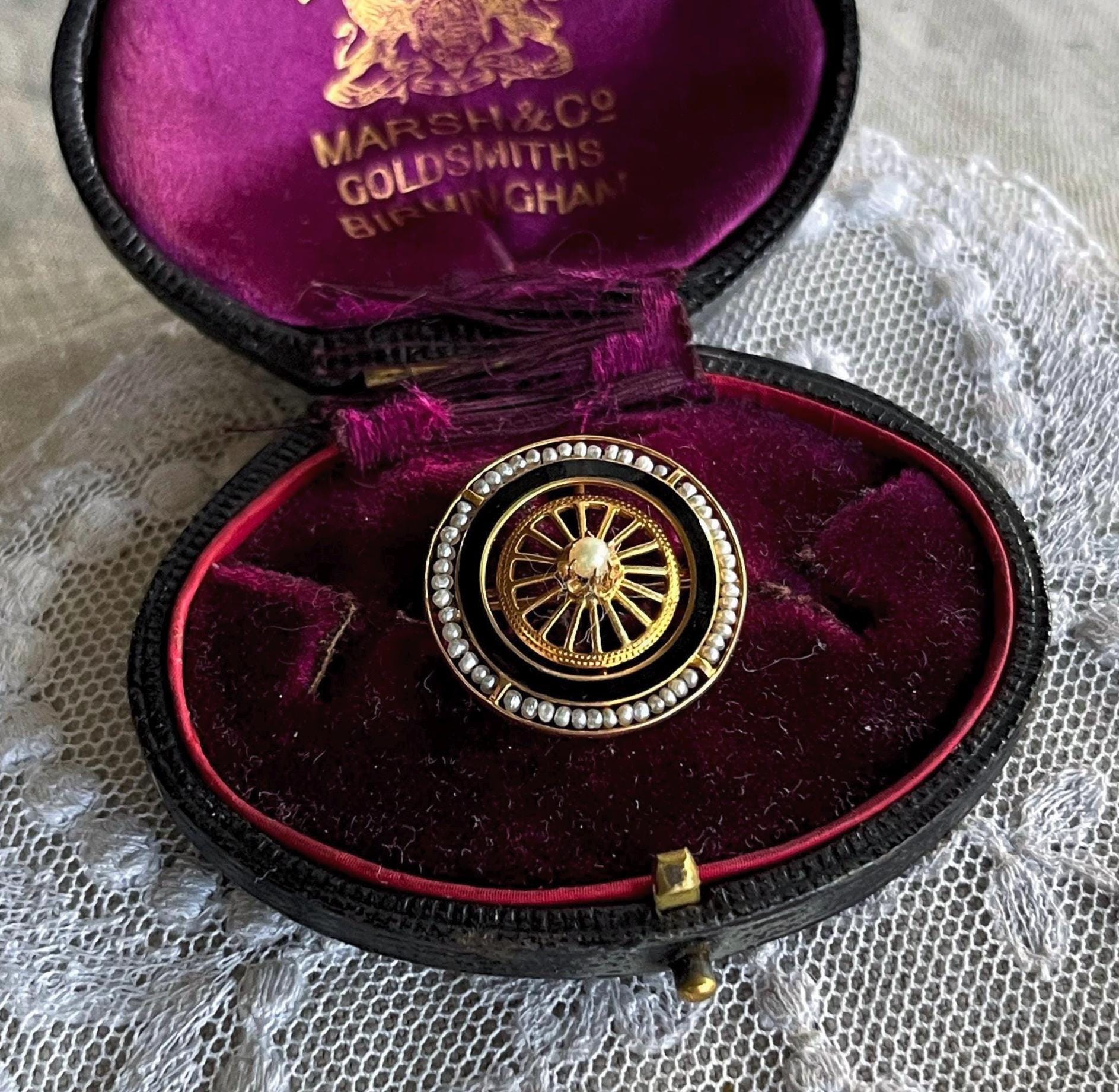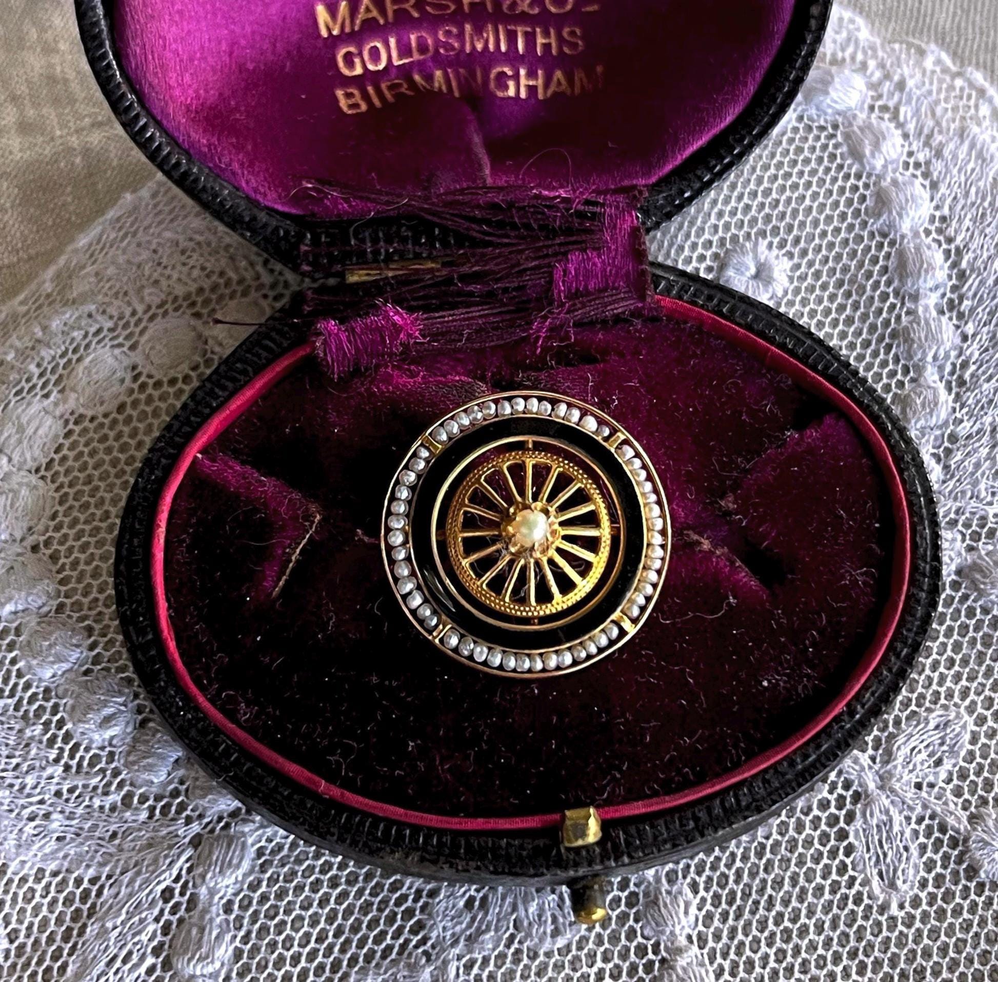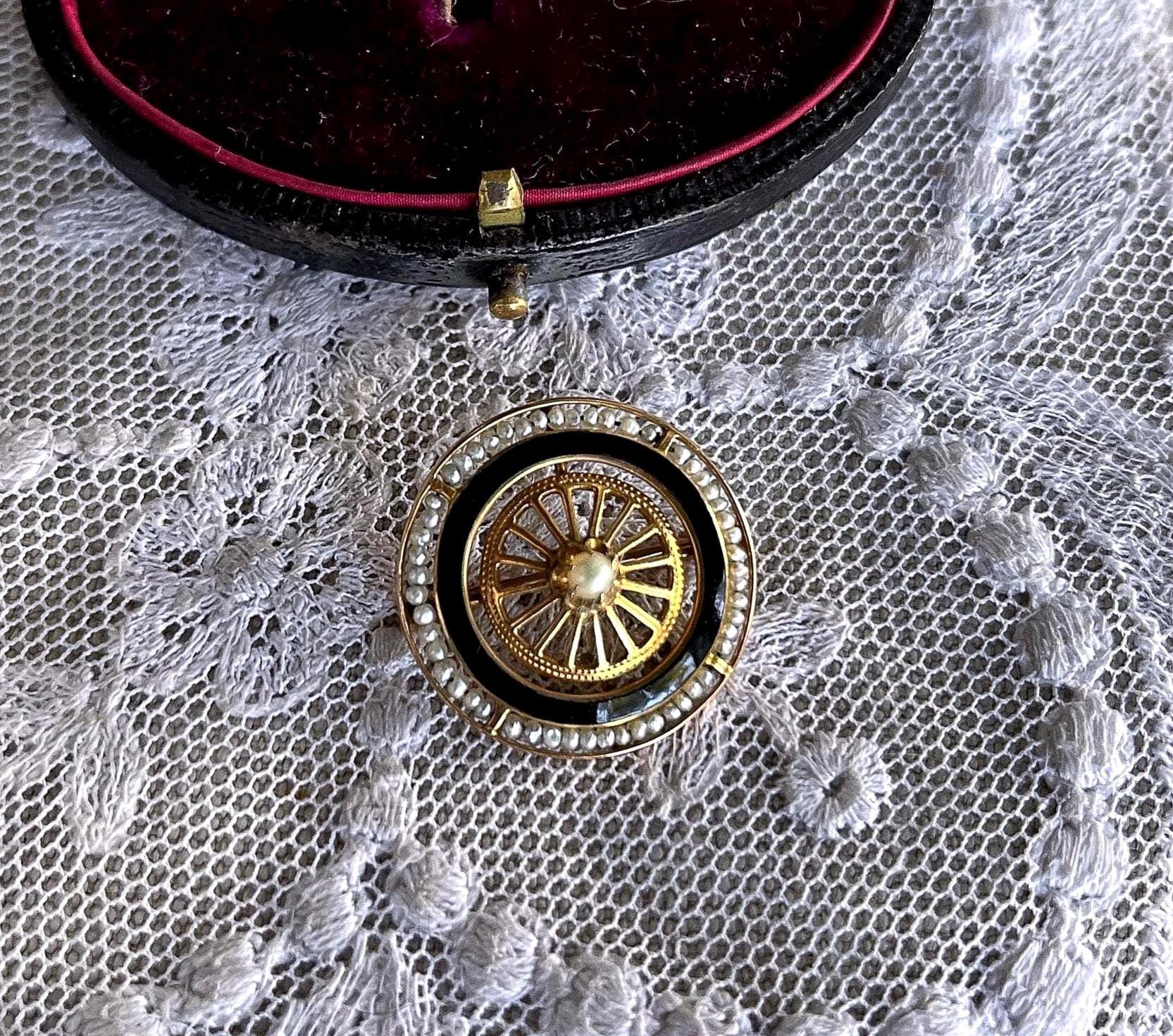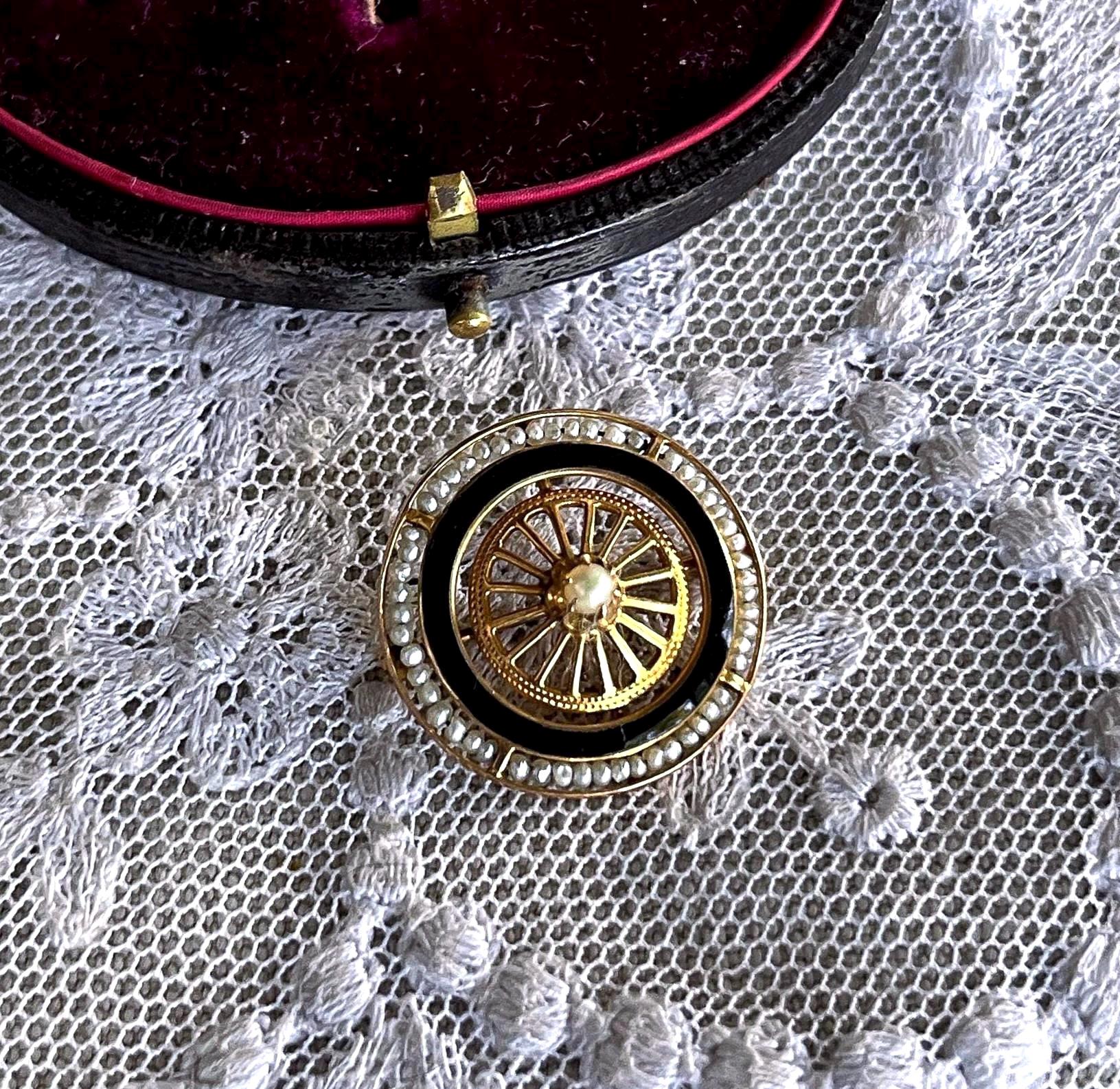 Featuring a lovely vintage Edwardian Victorian revival Mid Century solid 10k yellow gold lapel brooch adorned with luminous genuine Seed Pearls accented with luminous black enamel. Brooch measures approximately 1 by 3/8 inches at 2.6 grams respectively. This charming piece is in excellent vintage condition with functional clasp, enamel is perfectly intact with all pearls accounted for, hallmarked on the reverse. Highly collectible, beautifully designed this wonderful piece is ready to wear and pass on for generations!