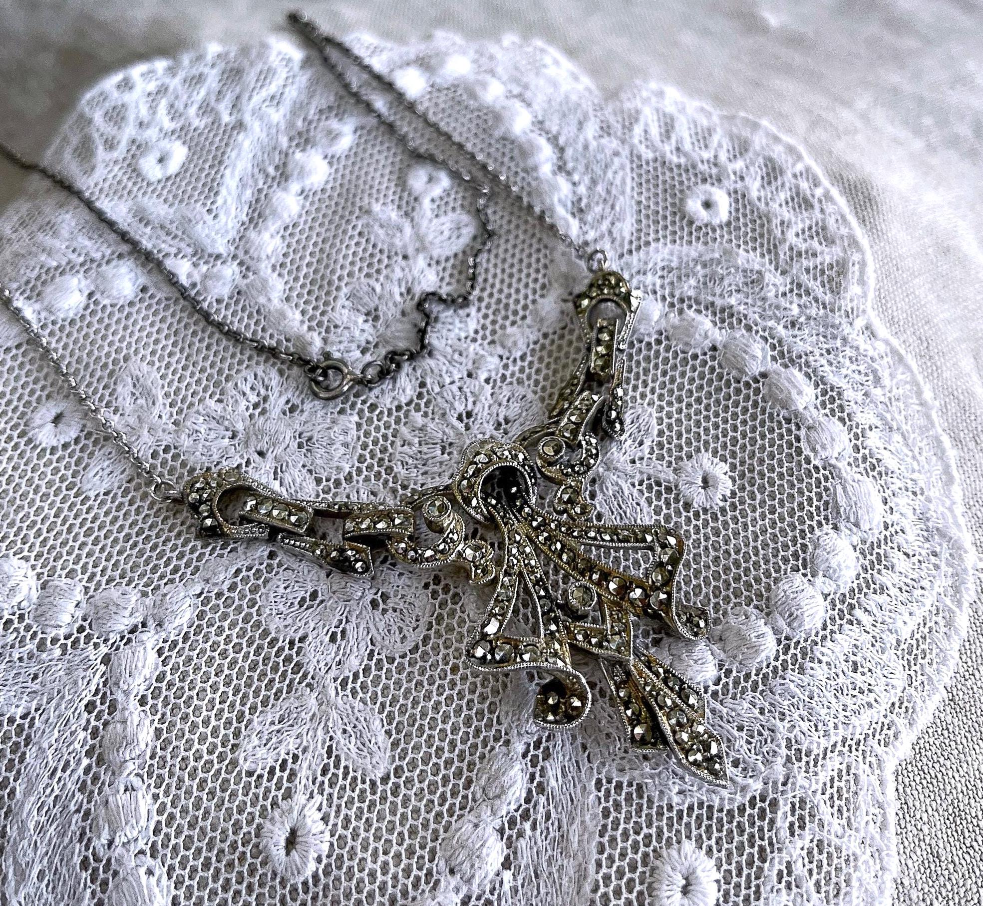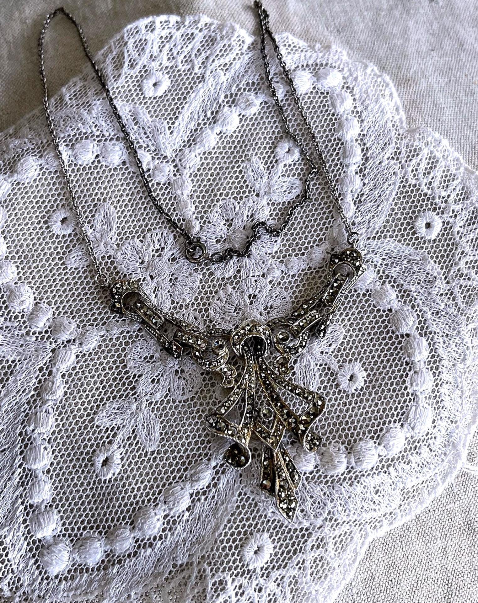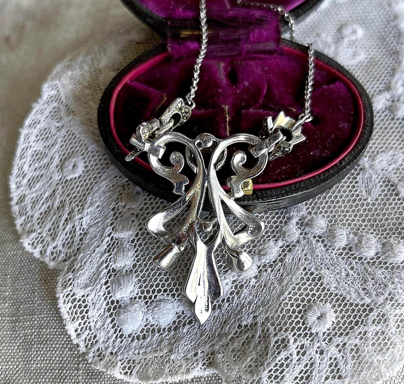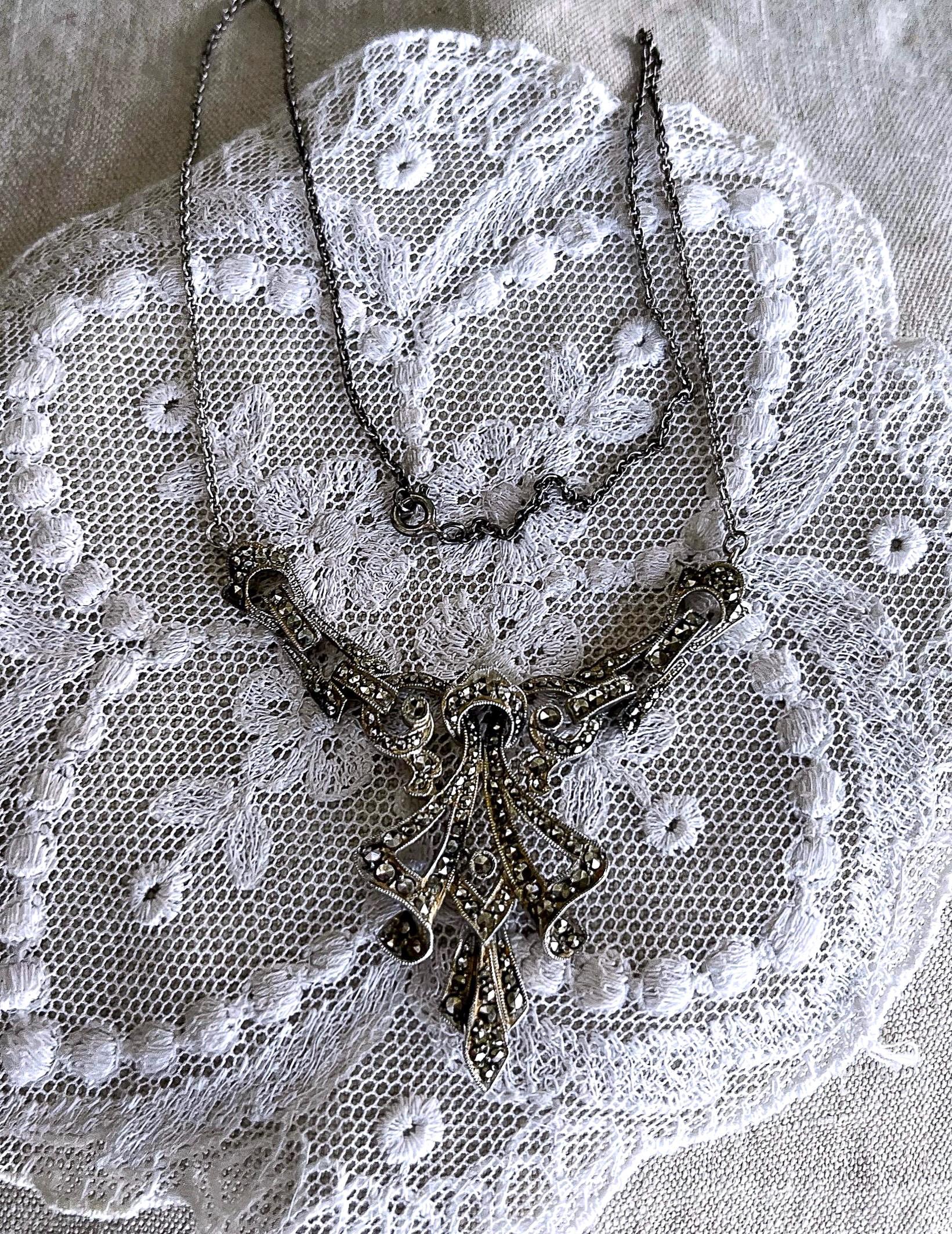 Featuring a beautiful English Art Deco Revival sterling silver bib necklace adorned with brilliant sparkling faceted marcasite crystals set in a deco motif setting. Necklace measures approximately 15 inches around with a 2 inch pendant drop at 11.63 grams. This beautiful necklace is in excellent vintage condition with working c spring clasp marked on the reverse of pendant.