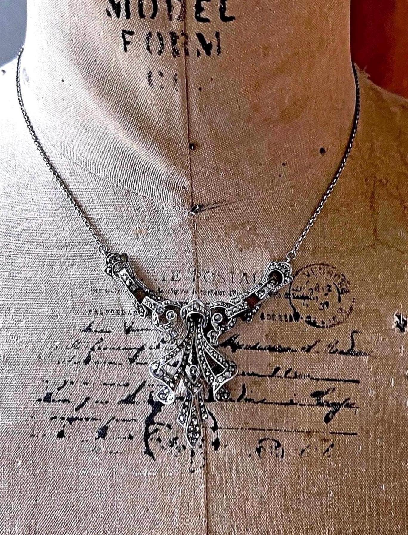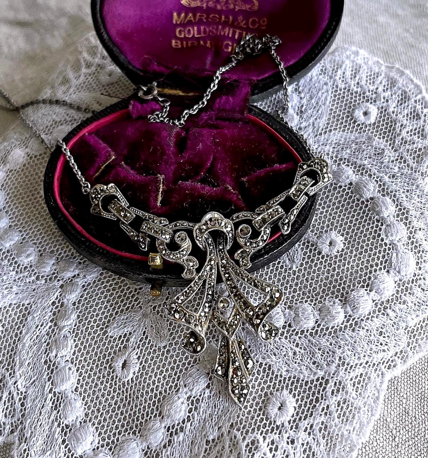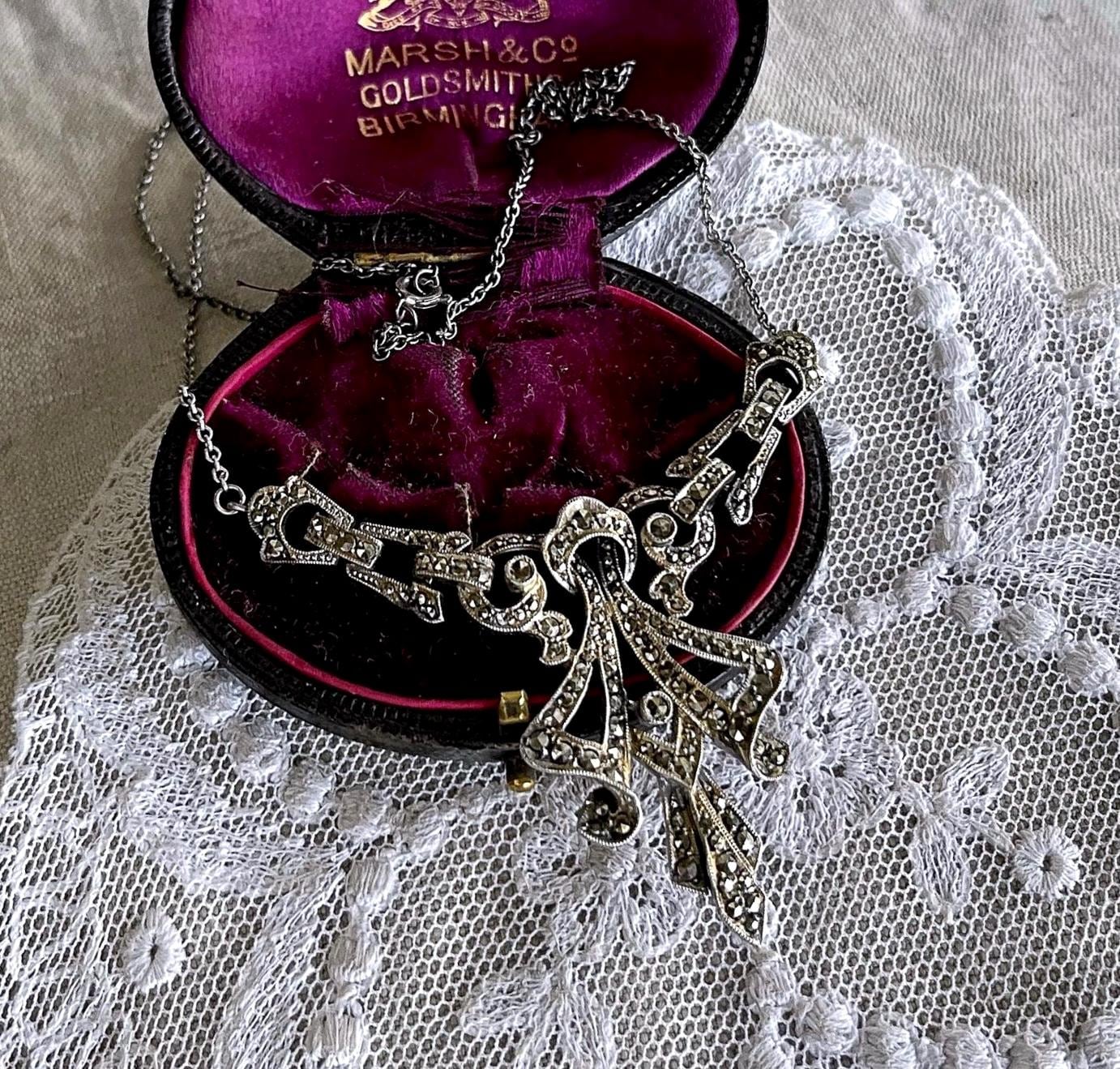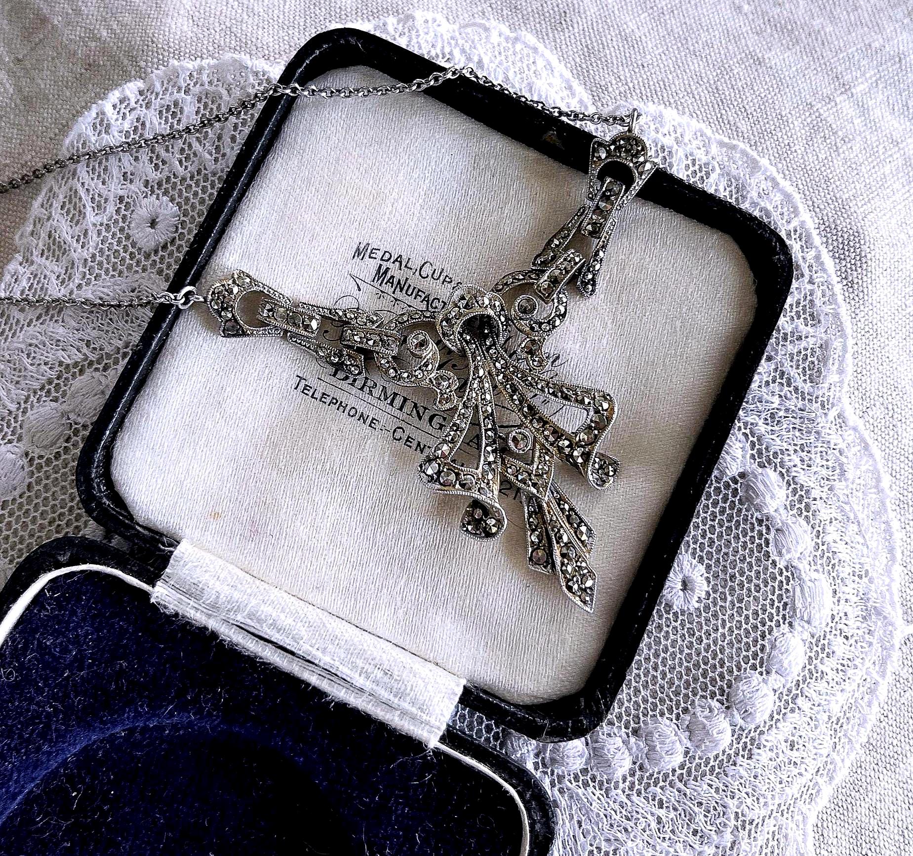 Featuring a beautiful English Art Deco Revival sterling silver bib necklace adorned with brilliant sparkling faceted marcasite crystals set in a deco motif setting. Necklace measures approximately 15 inches around with a 2 inch pendant drop at 11.63 grams. This beautiful necklace is in excellent vintage condition with working c spring clasp marked on the reverse of pendant.