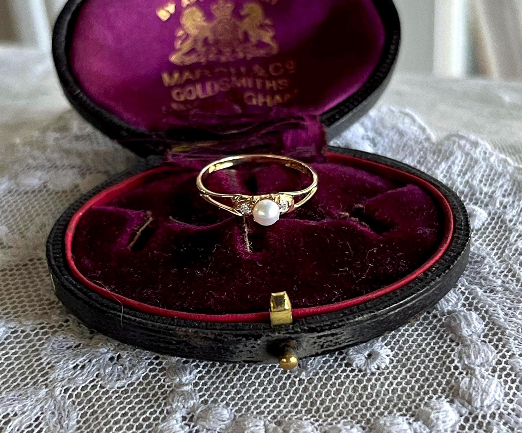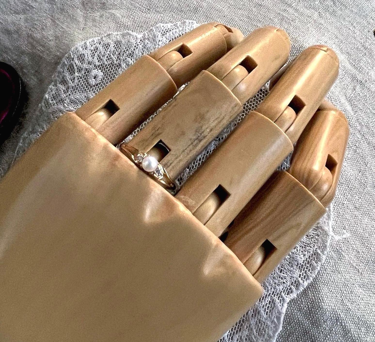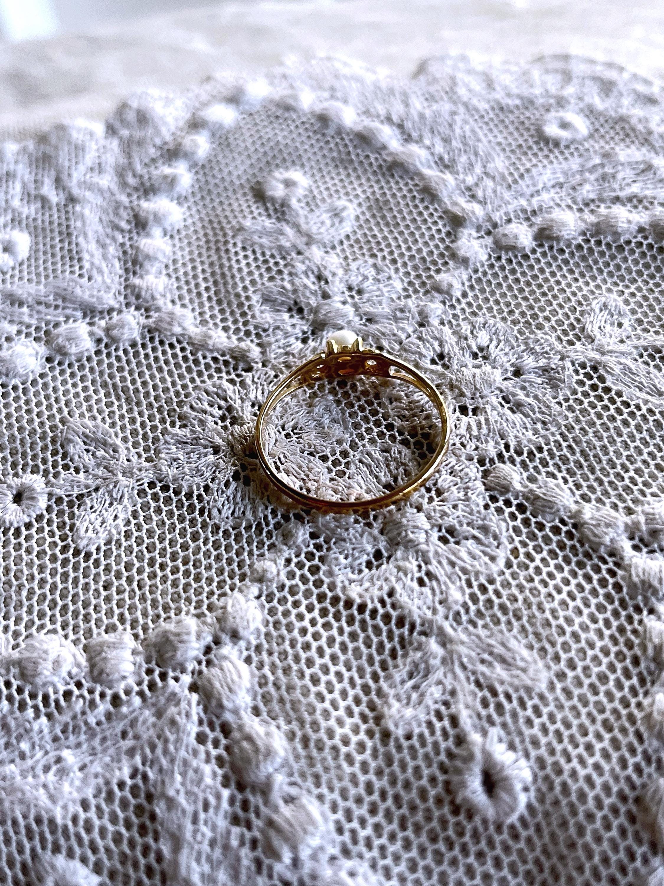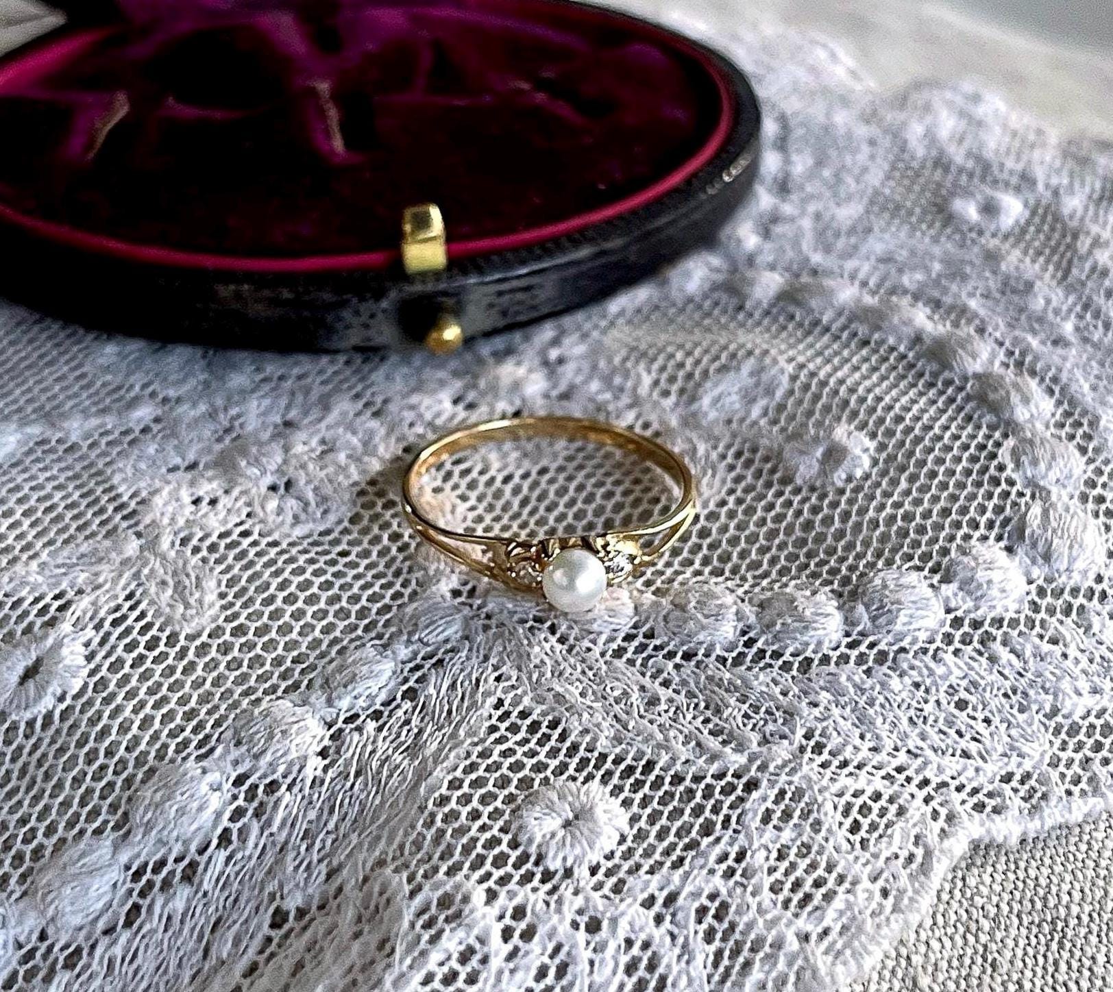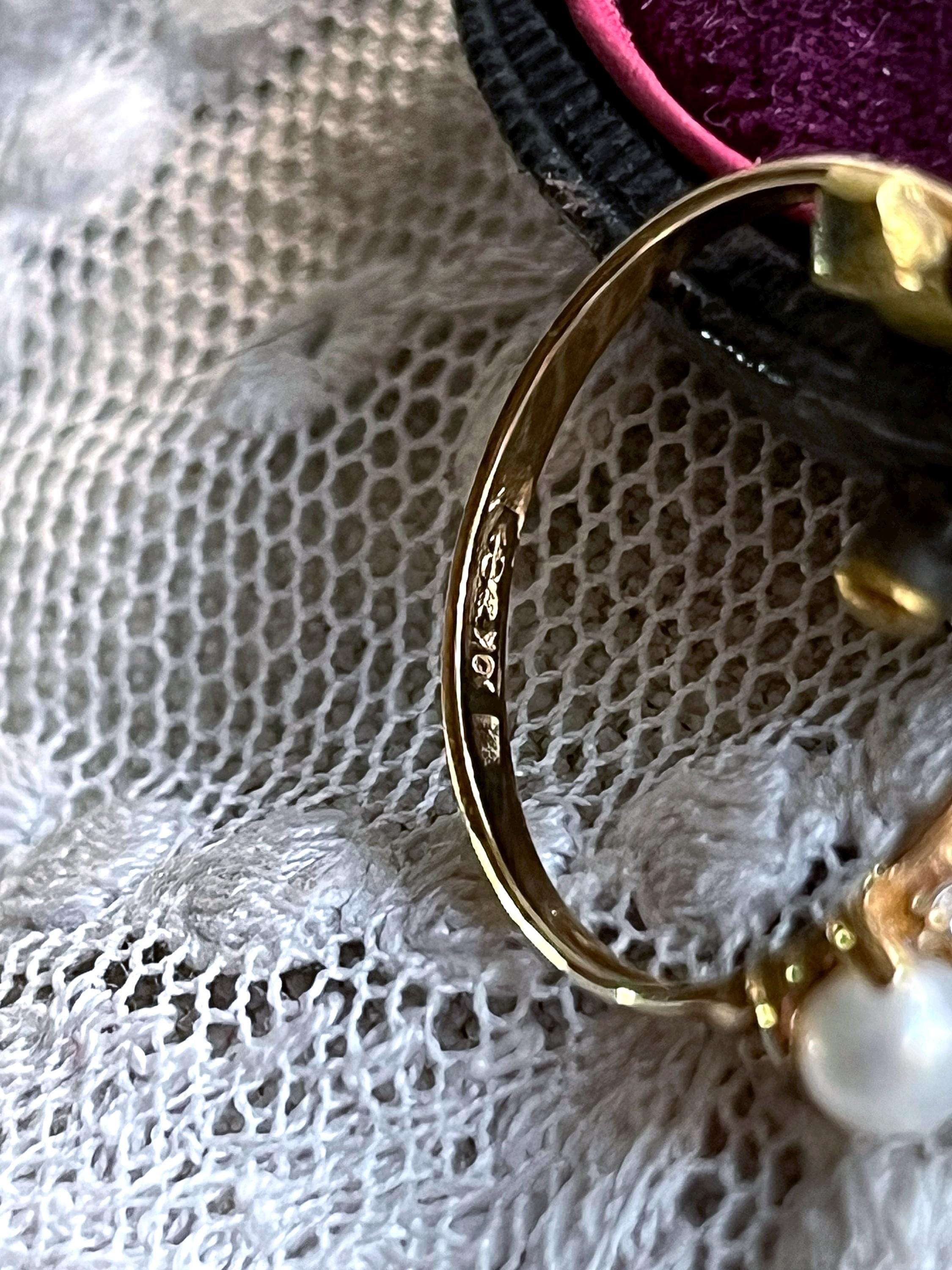 Featuring a gorgeous vintage Ladylike solid 10K yellow gold size stacking Ring adorned with a luminous beautifully colored Cultured Pearl and CZ accents. This wonderful Pearl ring is in excellent vintage condition with minimal wear, stamped 10K on the inside of band with all components intact and accounted for. Ring is approximately size 7. at 1.1 grams respectively and is ready to wear! I’ve been mesmerized by Pearls for as long as I can remember…