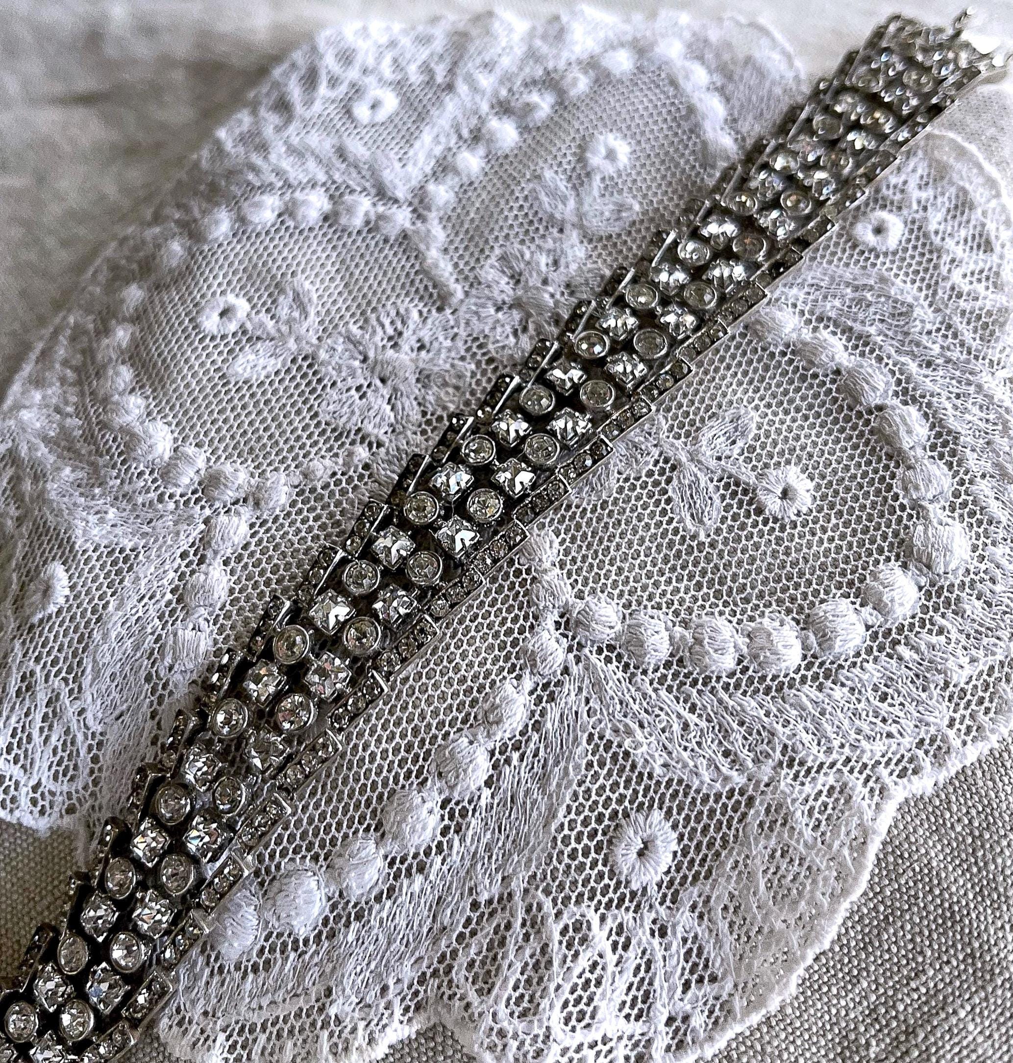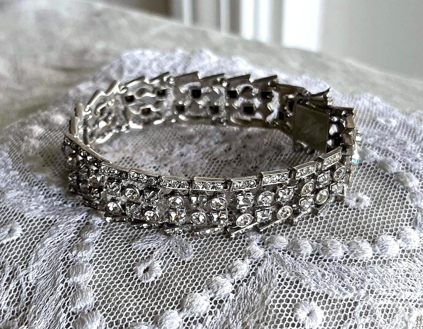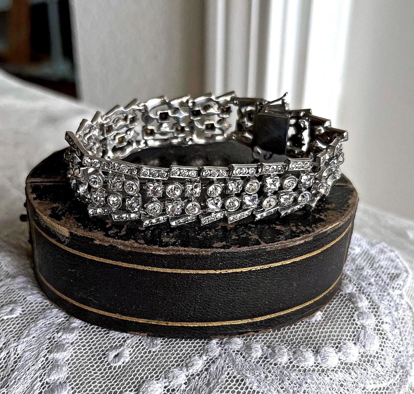 Featuring a stunning vintage German Art Deco Haute Couture 1930s dazzling solid sterling silver link bracelet adorned with bright white sparkling faceted paste stones set in closed back settings . Bracelet measures approximately 7 inches around at 29.91 grams respectively and is in excellent vintage condition with a functional hallmarked slide clasp, without safety chain all stones bright and accounted for. Stamped STERLING/GERMANY on the clasp, an exceptional piece, elegant, wearable and always appreciating.