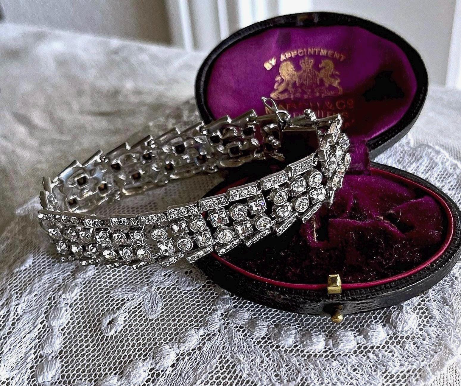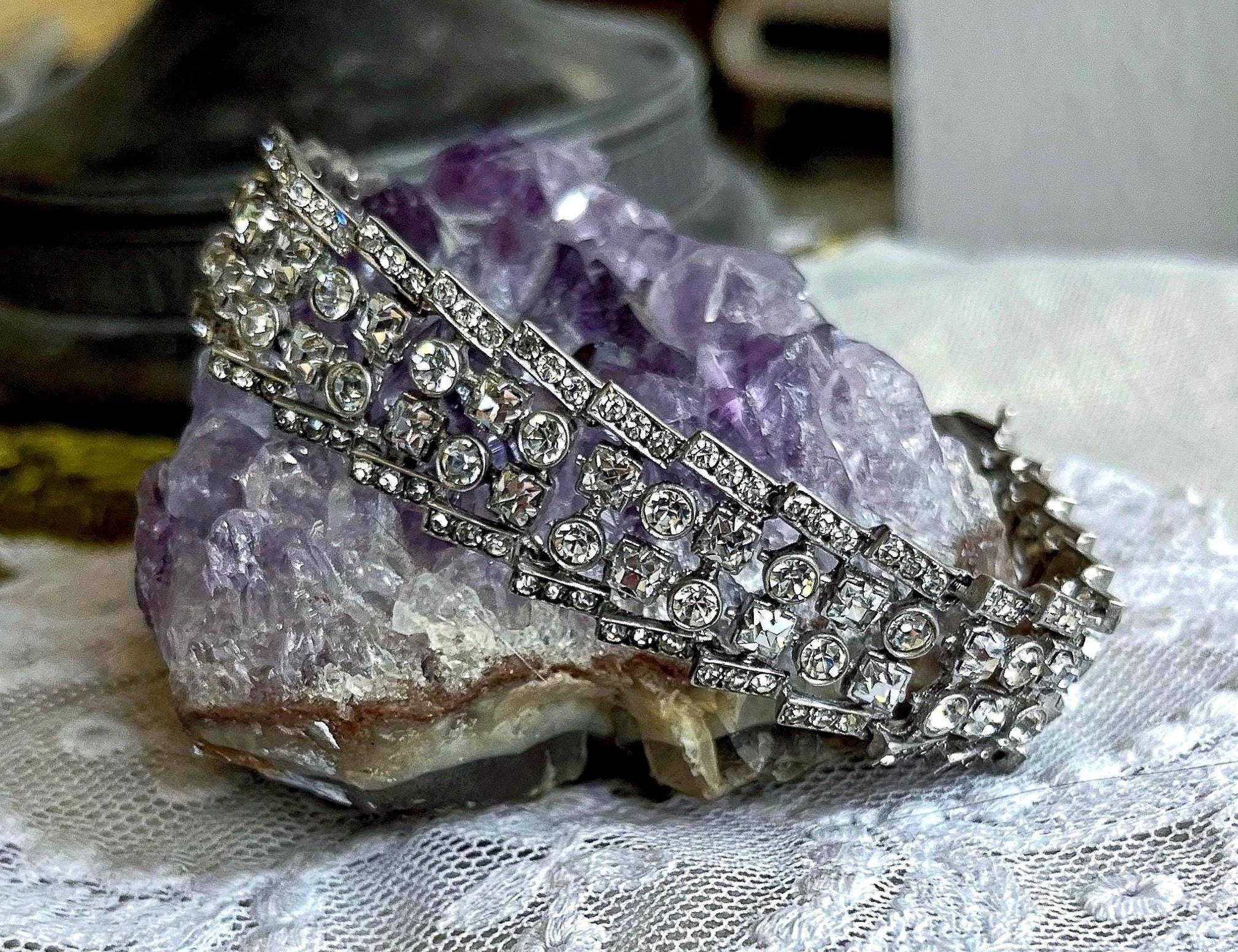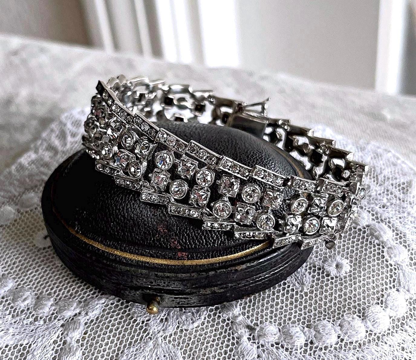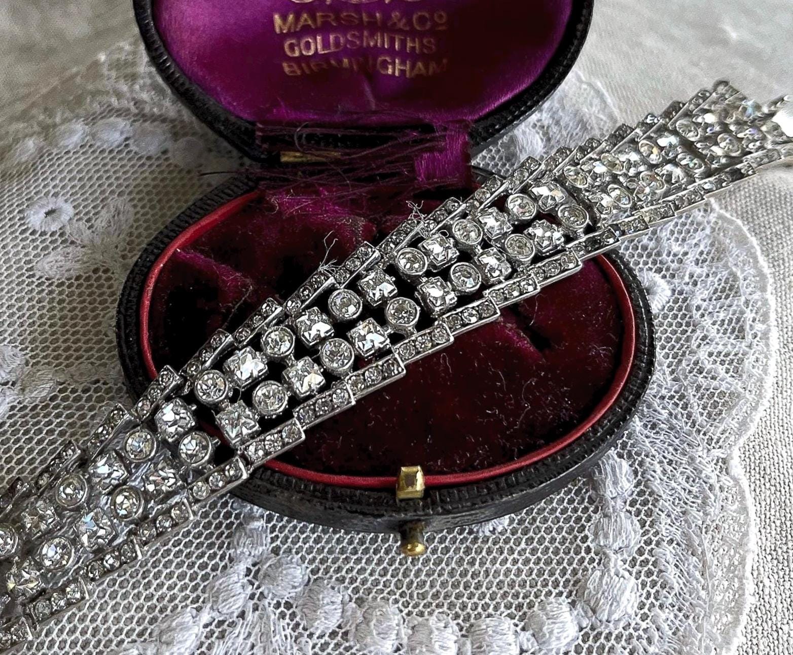 Featuring a stunning vintage German Art Deco Haute Couture 1930s dazzling solid sterling silver link bracelet adorned with bright white sparkling faceted paste stones set in closed back settings . Bracelet measures approximately 7 inches around at 29.91 grams respectively and is in excellent vintage condition with a functional hallmarked slide clasp, without safety chain all stones bright and accounted for. Stamped STERLING/GERMANY on the clasp, an exceptional piece, elegant, wearable and always appreciating.