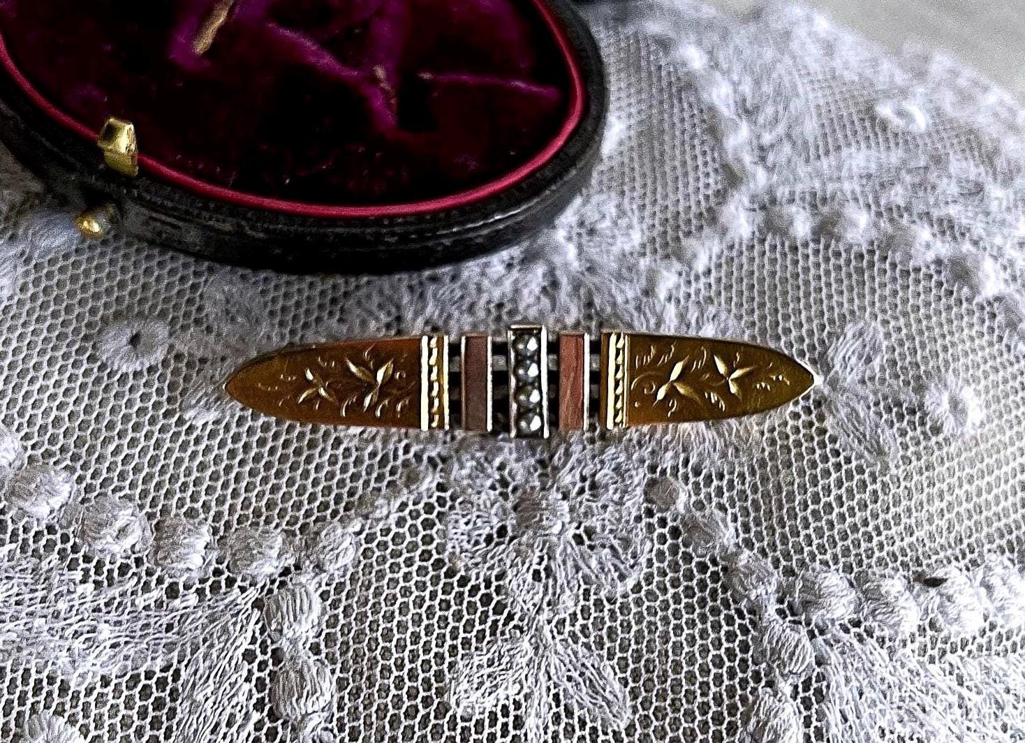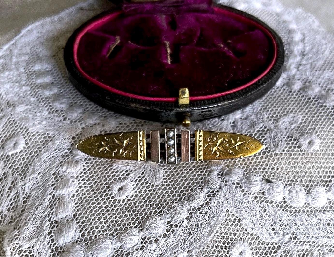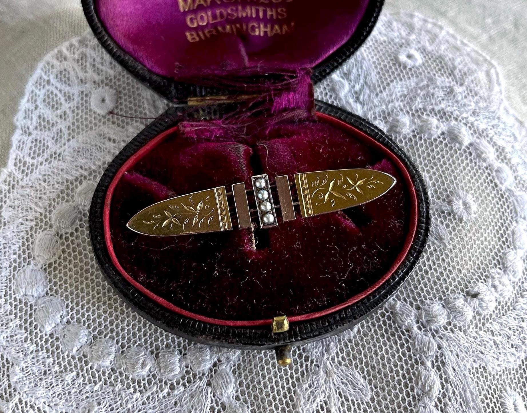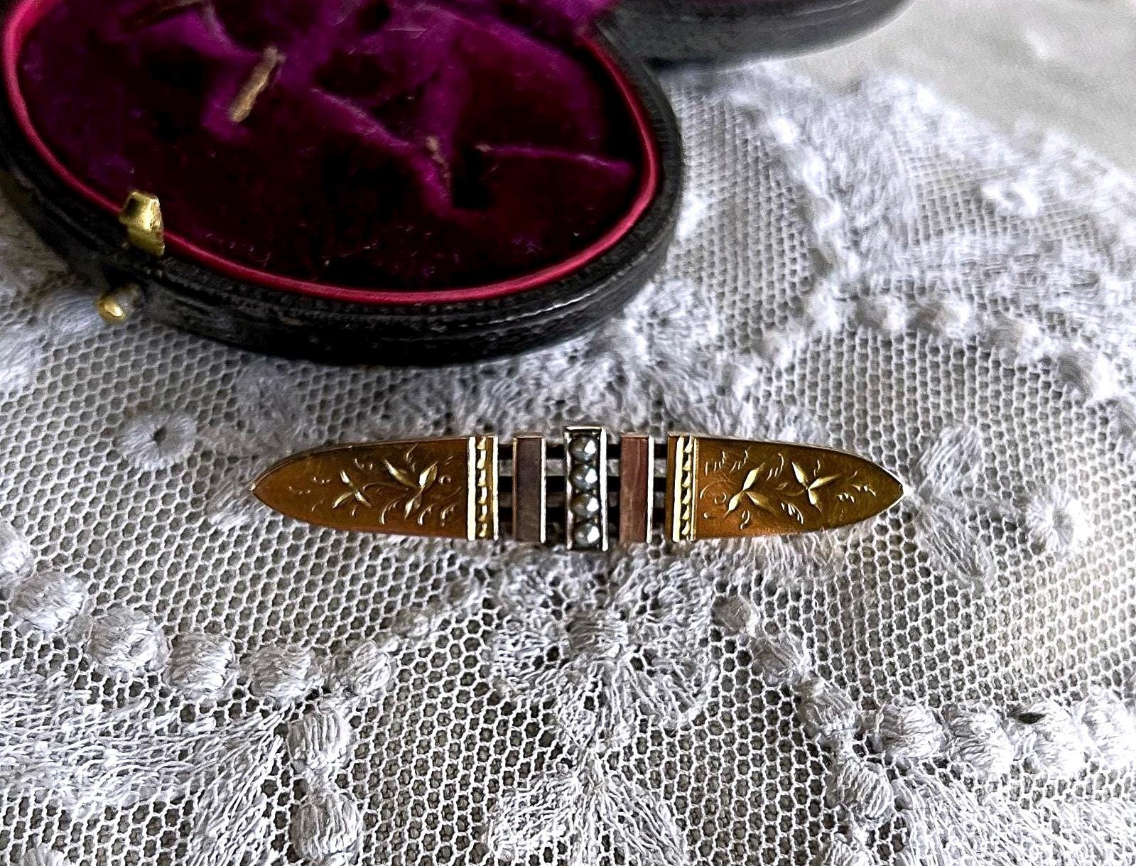 Featuring a beautiful antique Victorian Romantic Era 1800s fancy scrolled 9k gold tested oblong brooch adorned with luminous genuine Seed Pearl accents. Brooch is in excellent antique condition with functional antique hinged C clasp, normal wear with all components intact and accounted for. Brooch is tested as 9k and is unsigned measuring approximately 4 by .4 inches at 3.9 grams respectively. An absolutely amazing antique piece, beautifully designed and handcrafted over 100 years ago!