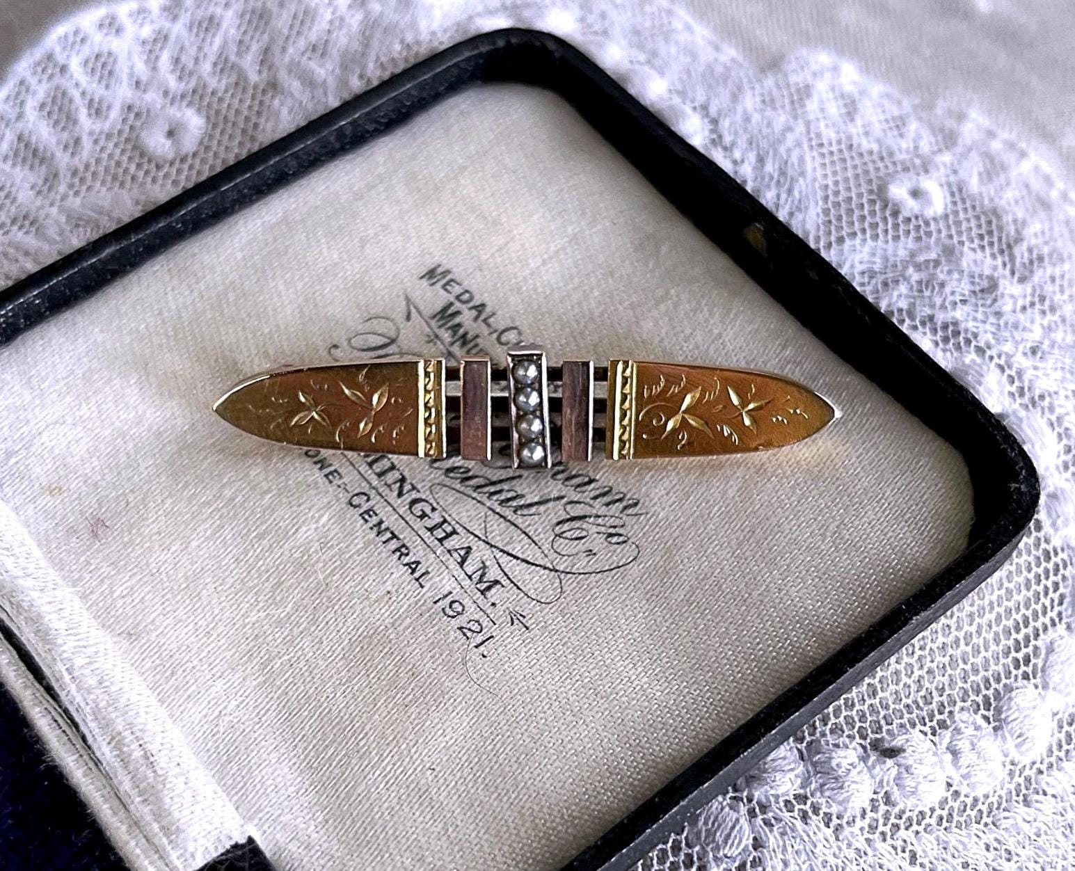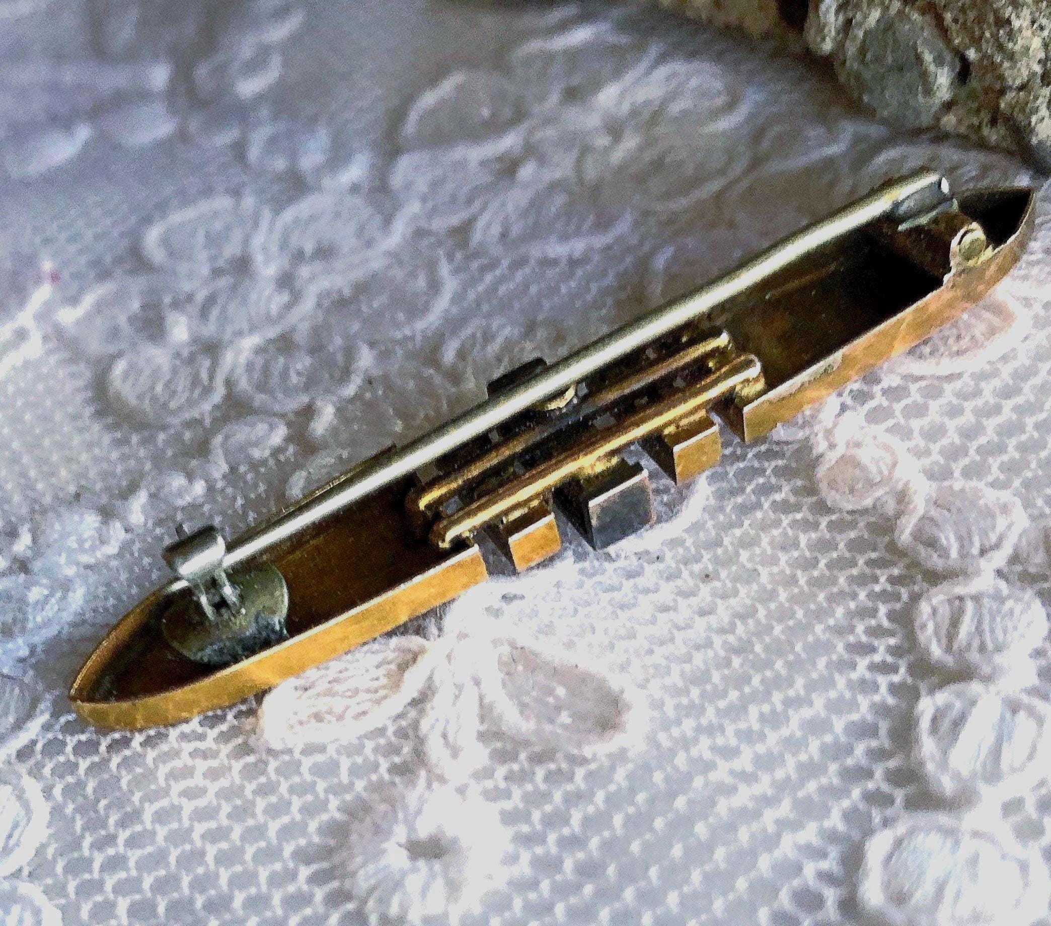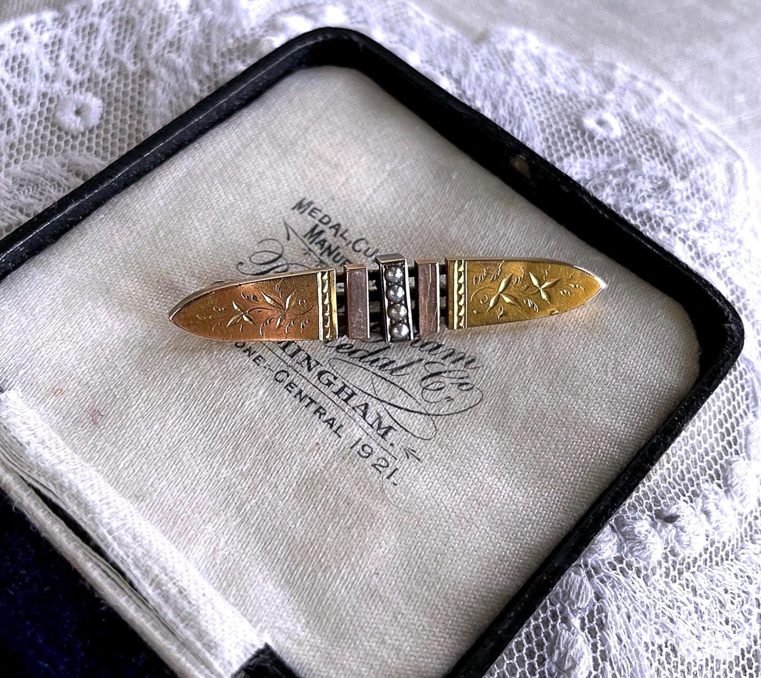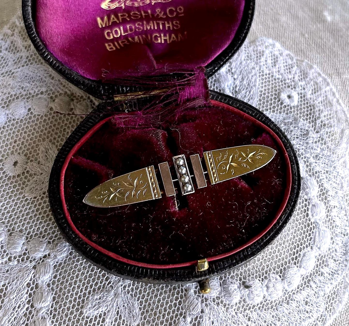 Featuring a beautiful antique Victorian Romantic Era 1800s fancy scrolled 9k gold tested oblong brooch adorned with luminous genuine Seed Pearl accents. Brooch is in excellent antique condition with functional antique hinged C clasp, normal wear with all components intact and accounted for. Brooch is tested as 9k and is unsigned measuring approximately 4 by .4 inches at 3.9 grams respectively. An absolutely amazing antique piece, beautifully designed and handcrafted over 100 years ago!