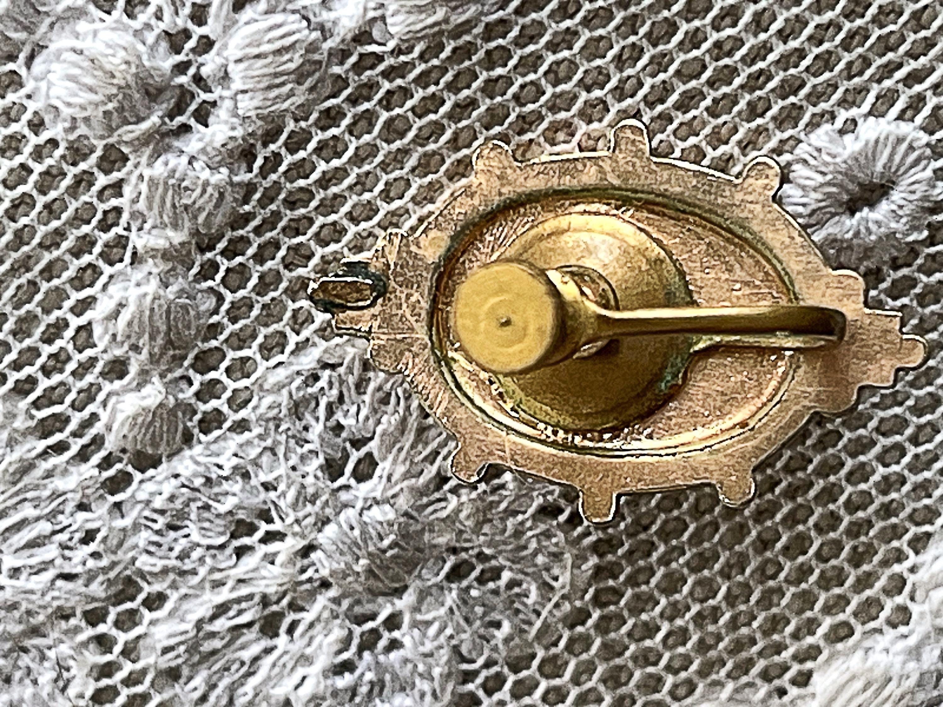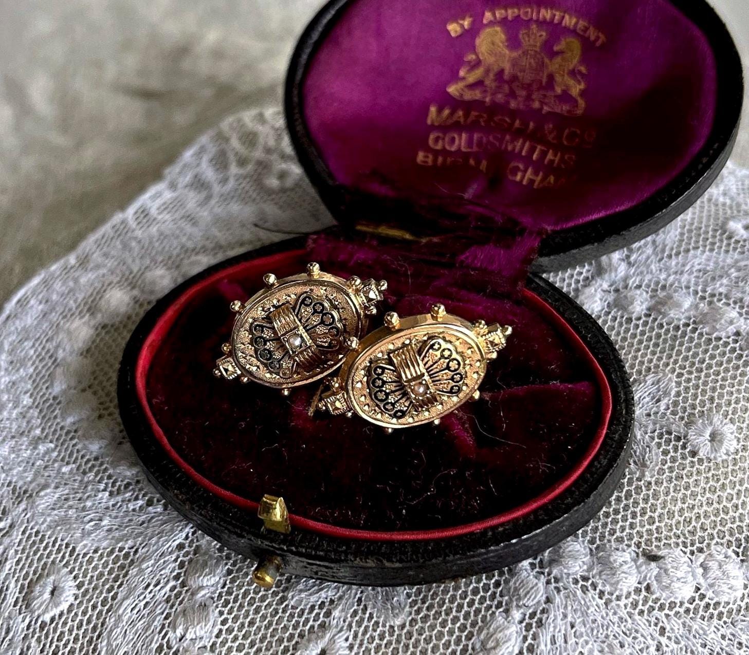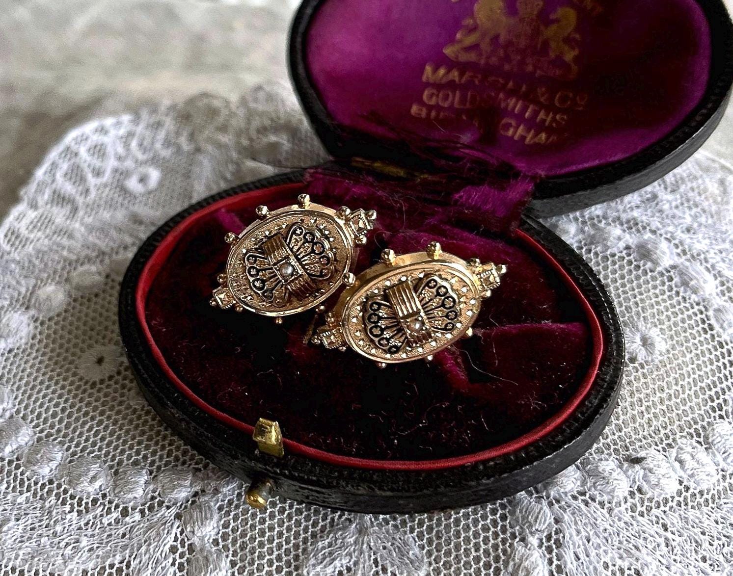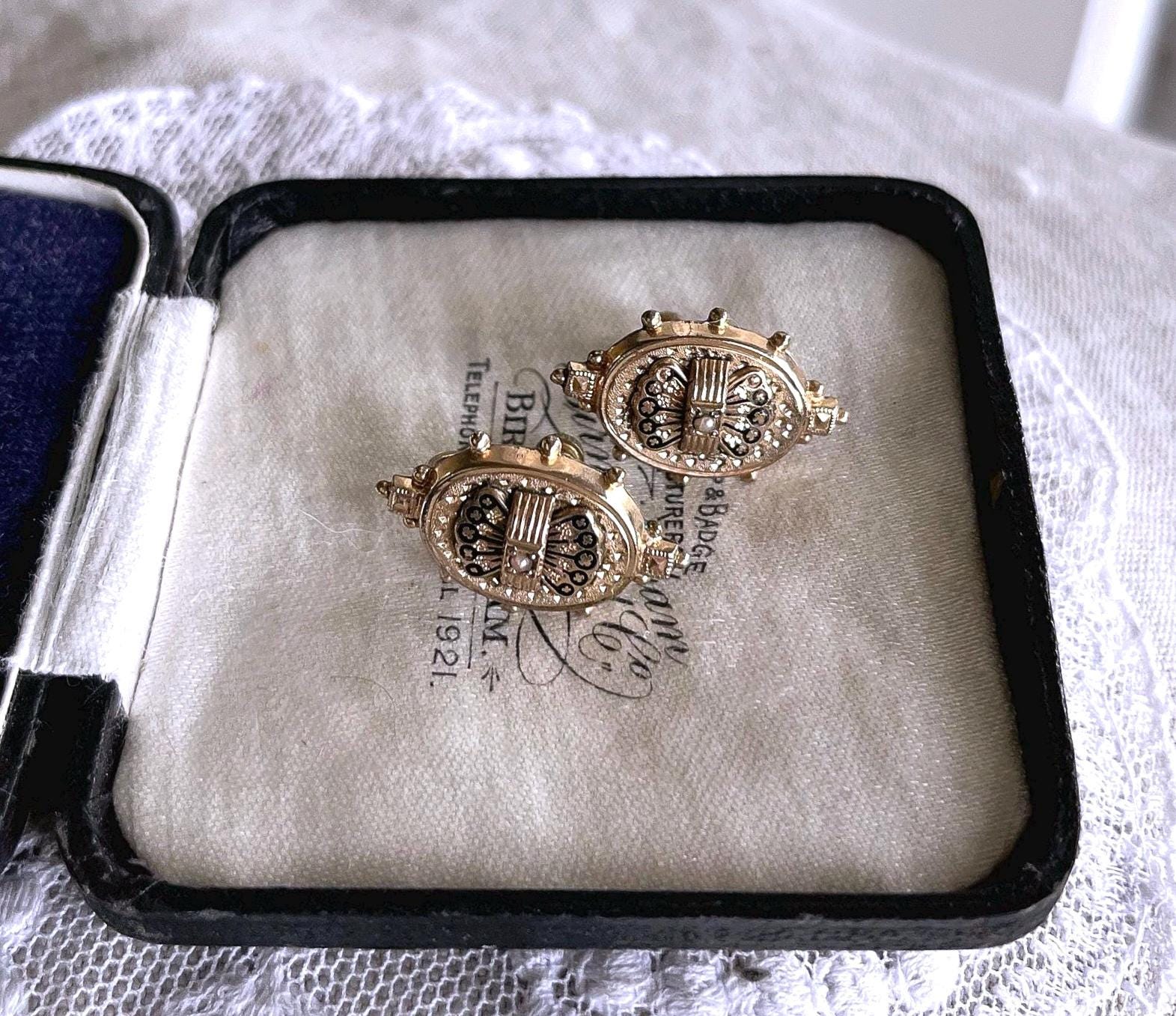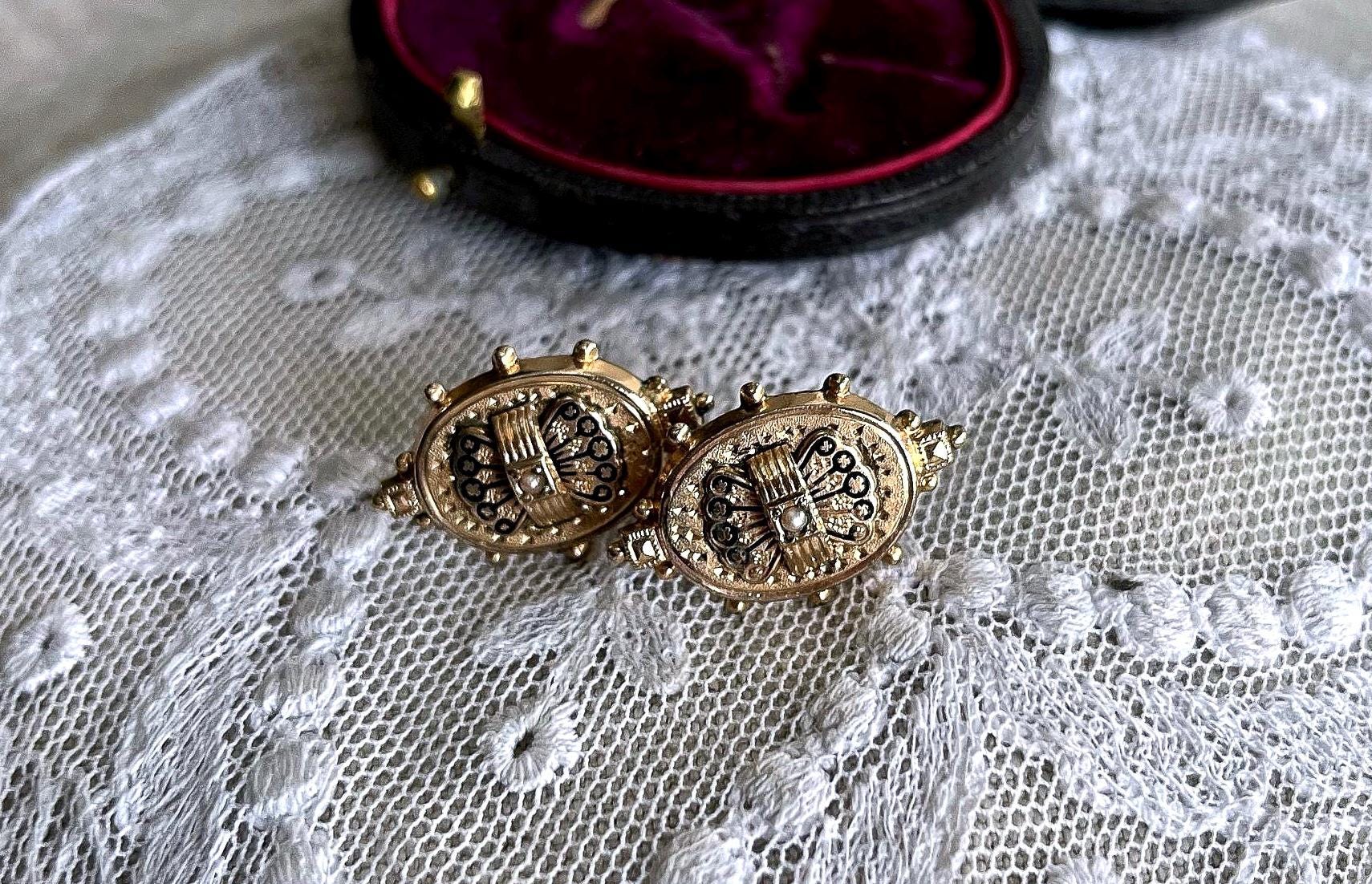 Featuring a beautiful pair of antique Late Victorian Aesthetic lovely scrolled gold filled Pinchbeck screw back dangle earrings. Earrings measure approximately 1 inch long at 2.62 grams respectively and are excellent antique condition with functional clasps, normal wear with all stones and enamel intact, with faded markings. These beauties are beautifully designed and ready to pass on for generations.