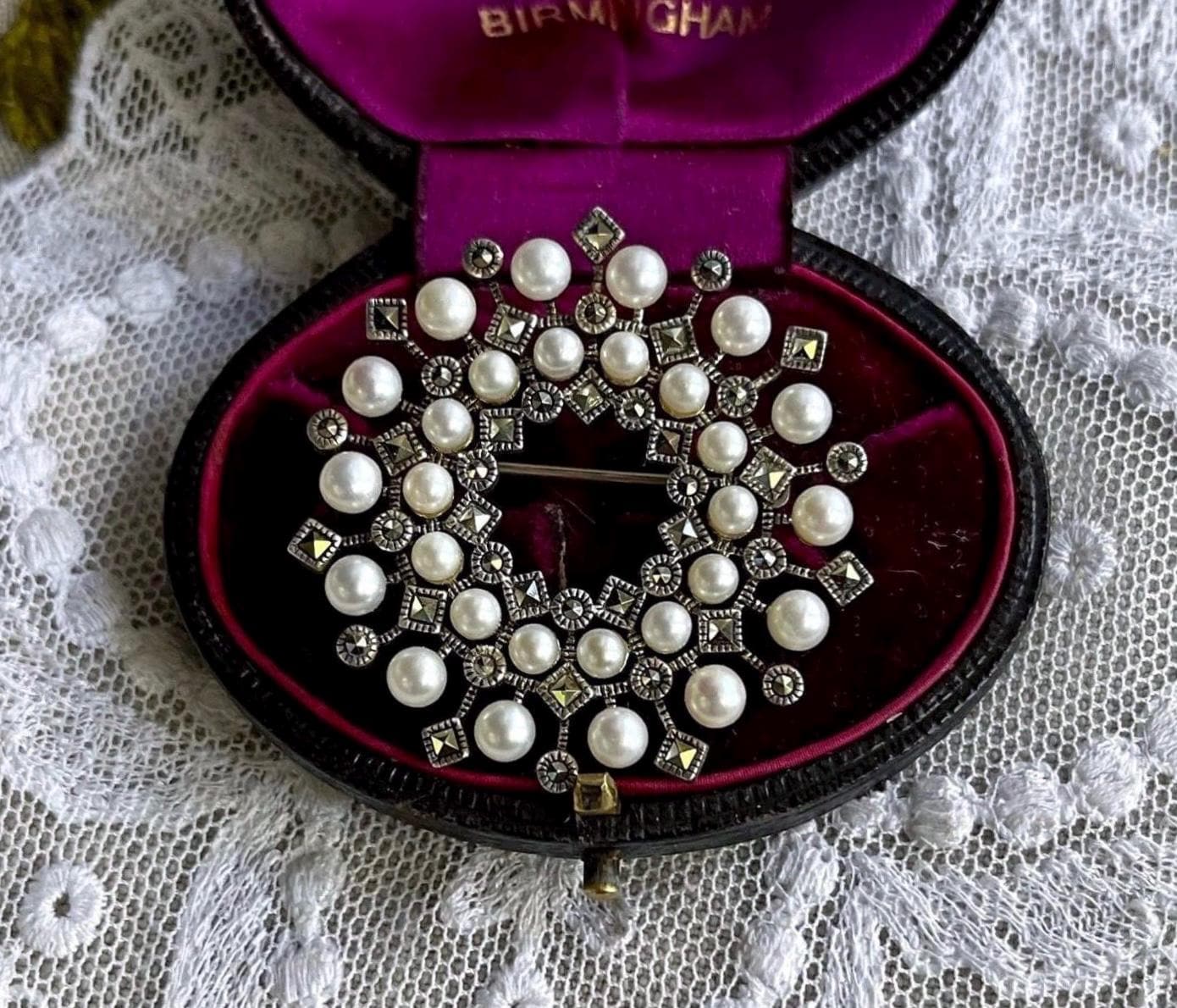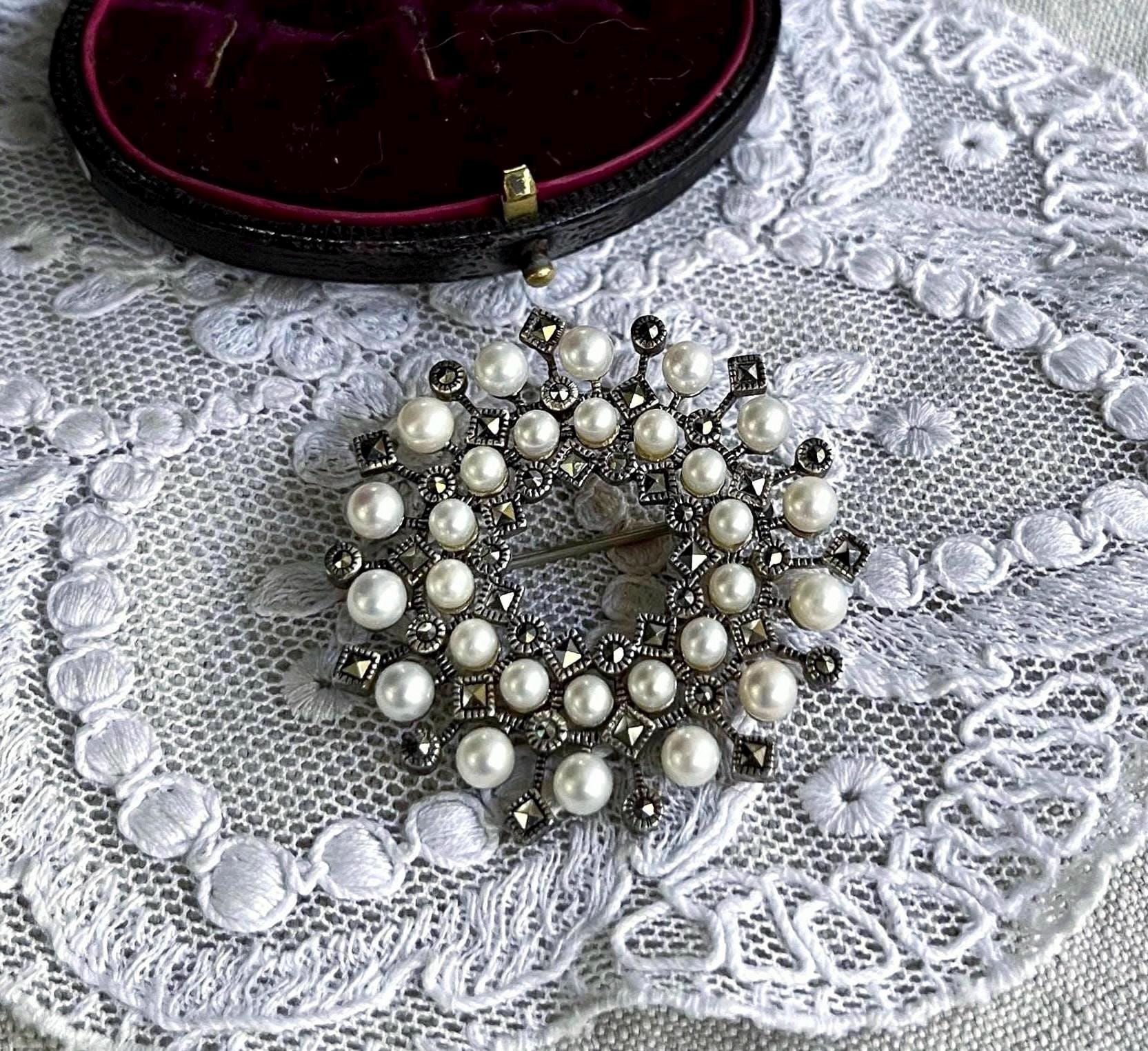 Featuring a lovely romantic vintage Art Deco Revival hallmarked sterling silver 925 dazzling star burst statement brooch adorned with luminous genuine Cultured pearls accented with brilliant sparkling faceted marcasite crystals . Brooch is in excellent vintage condition with a functional clasp, a beautiful shine with all stones intact and accounted for. Measuring approximately 1 3/8 inches in diameter at 11.4 grams respectively this is a lovely, timeless beauty , stamped on the reverse , sparkles like crazy!