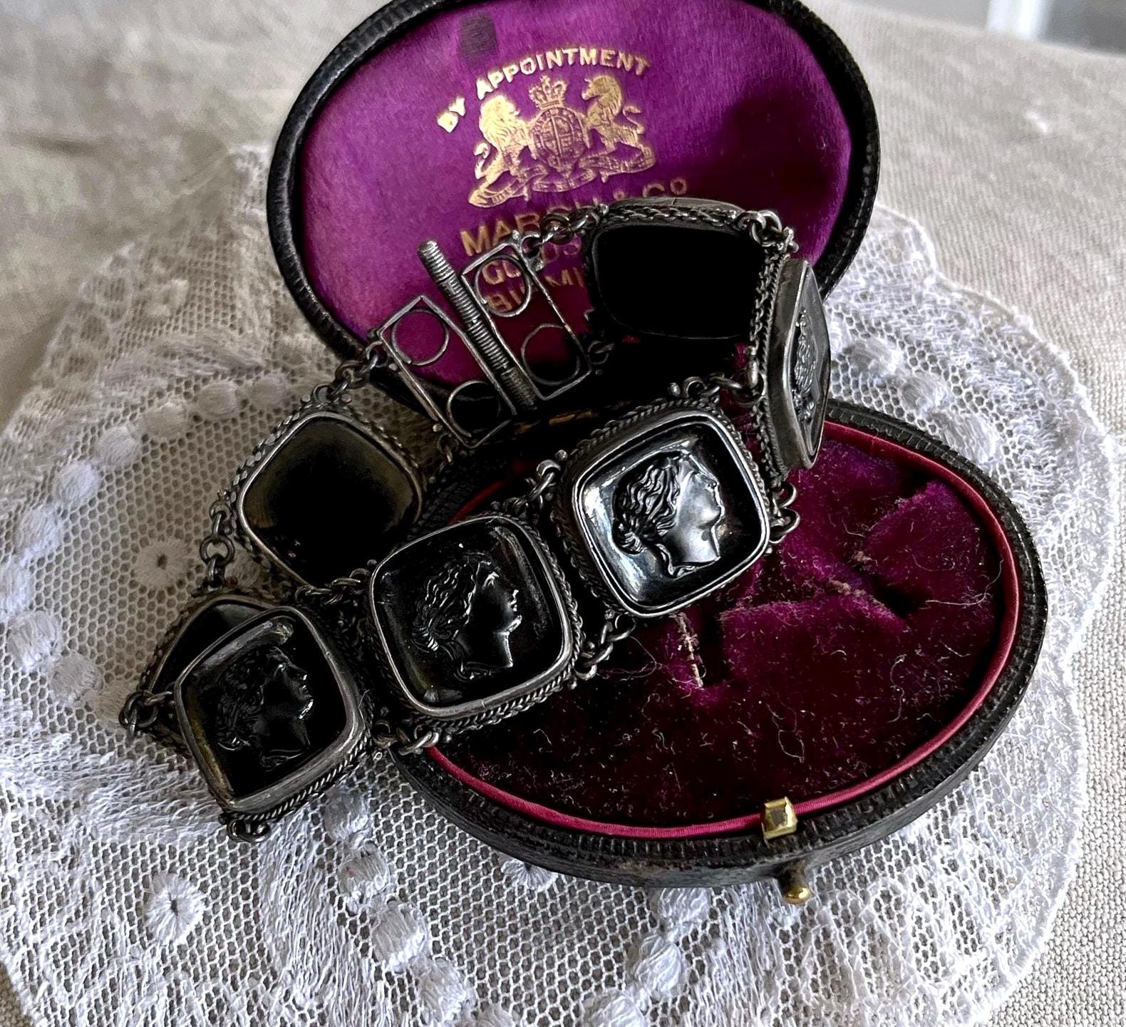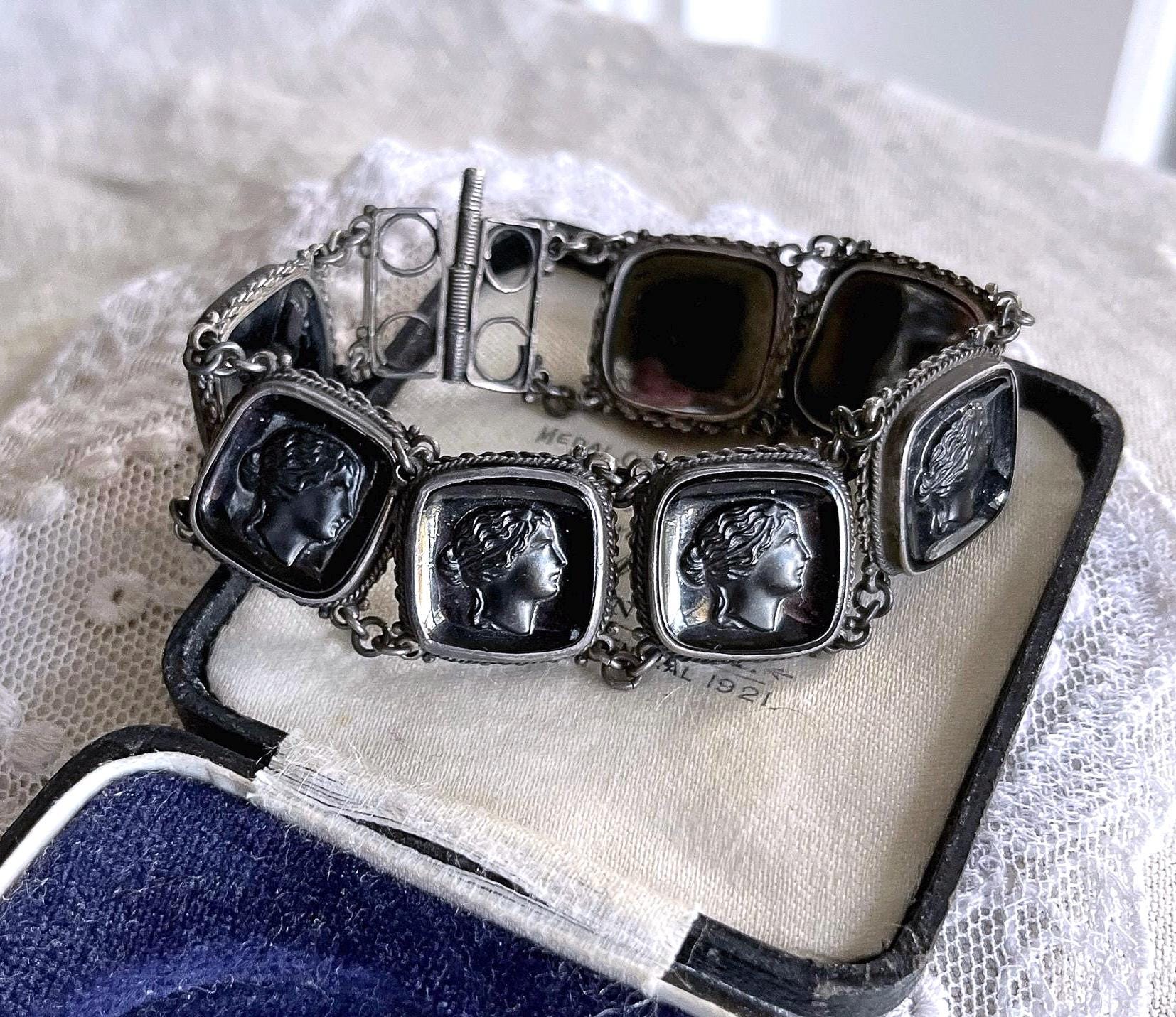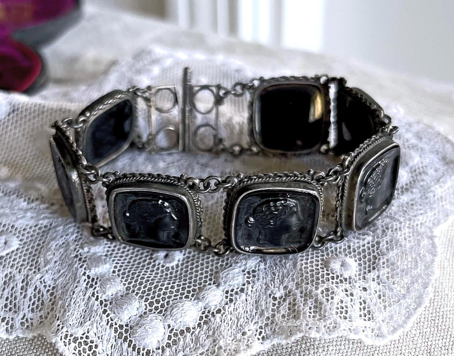 Featuring an exquisite example of an antique oxidized sterling silver Victorian Mourning bracelet adorned with beautiful genuine Obsidian Bezel set Cameos with an antique Pin clasp. Bracelet measures approximately 7.5 inches around with Cameos measuring approximately .75 inches in diameter at 26.8 grams respectively. Bracelet is in excellent antique condition with functional clasp, a lovely patina with all stones intact and accounted for. Beautifully handcrafted this is an exceptional and rare collectible piece!