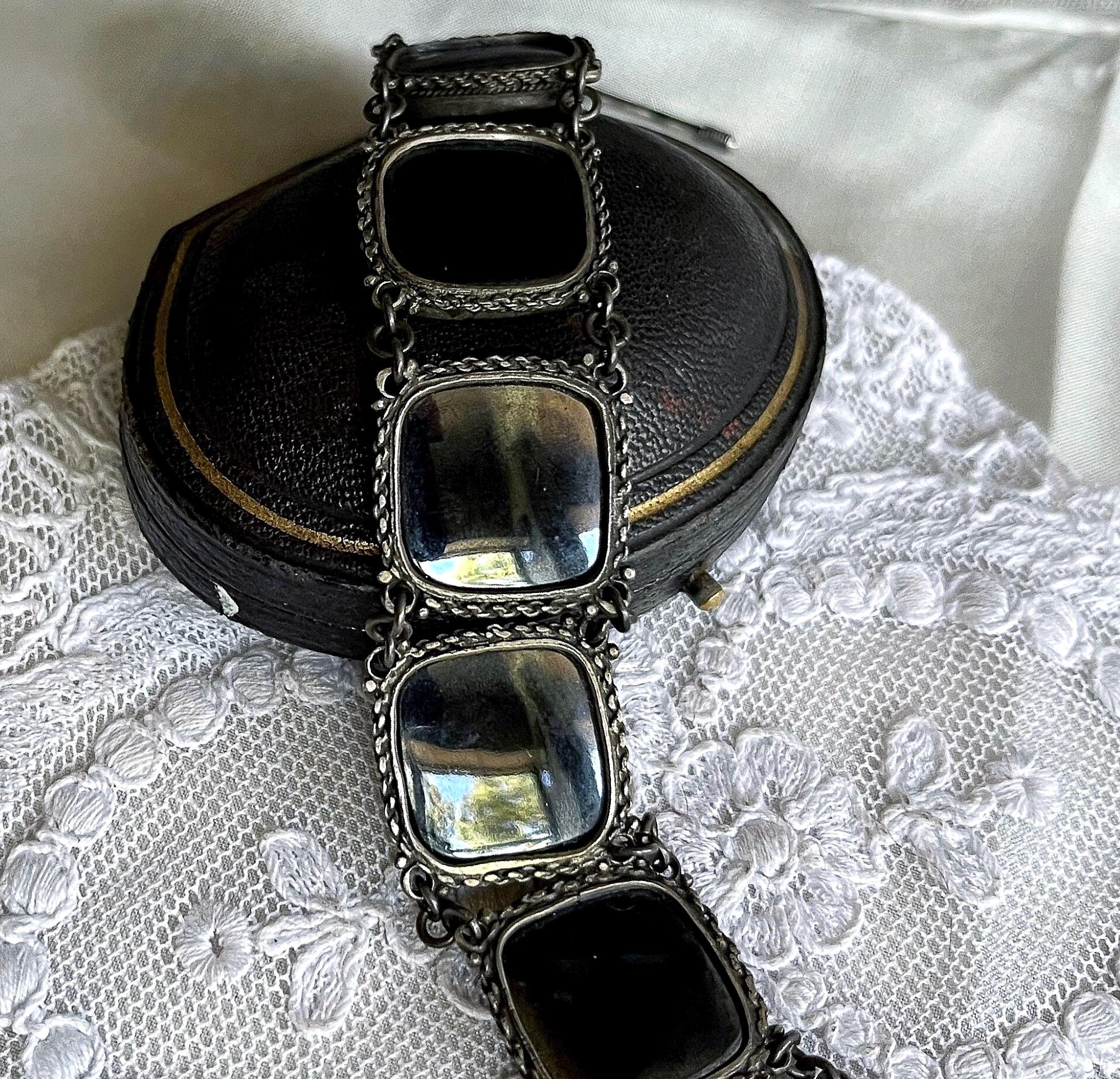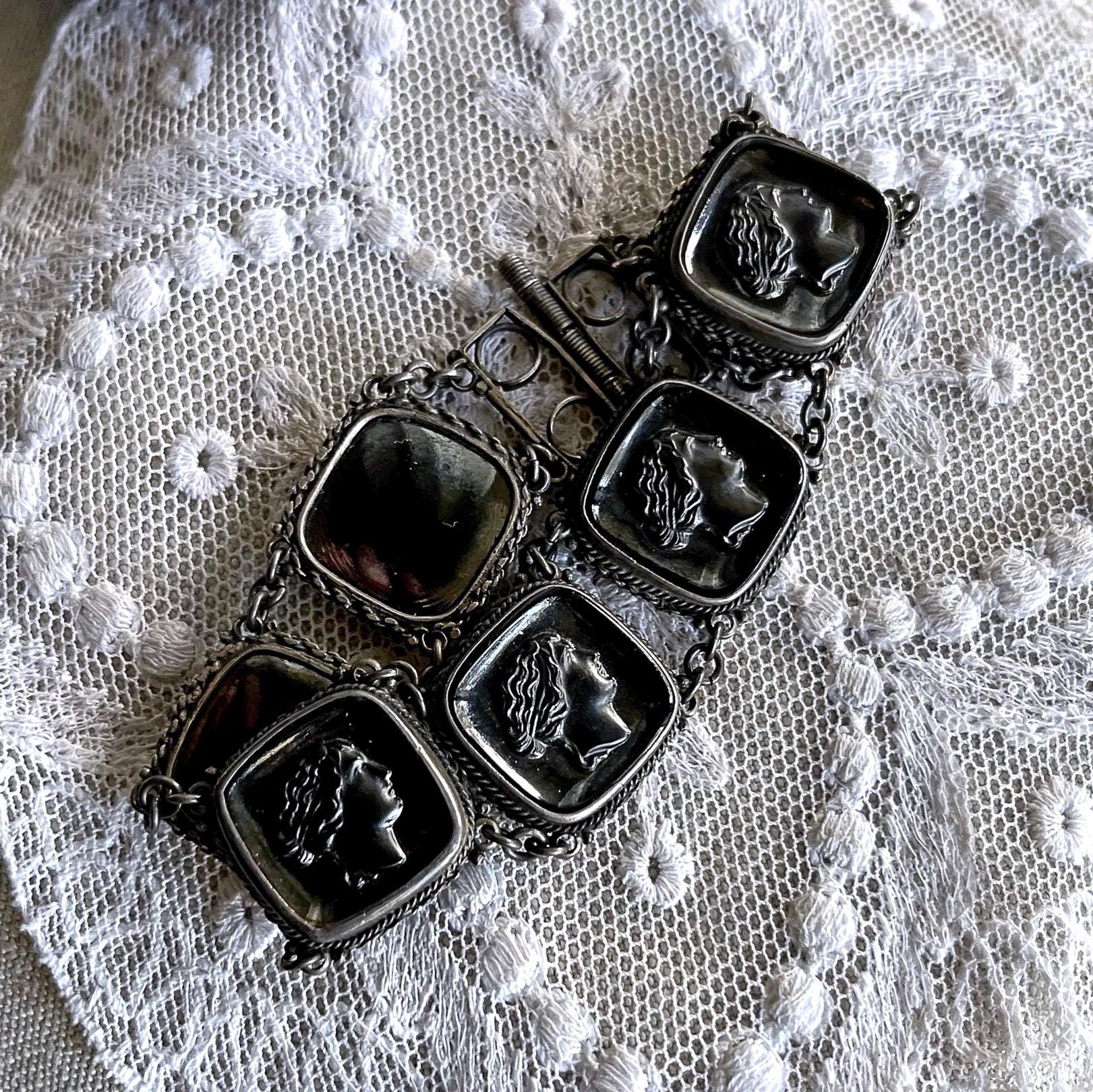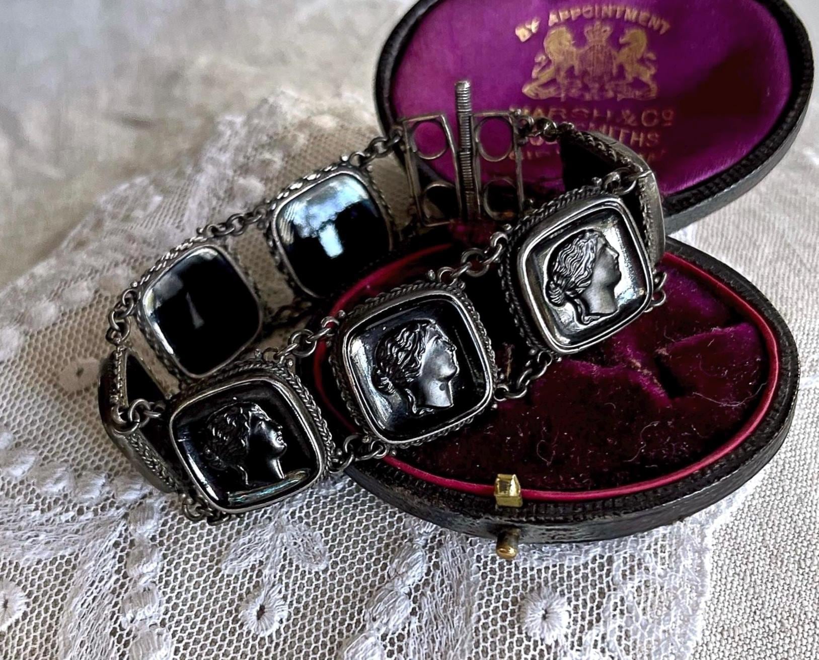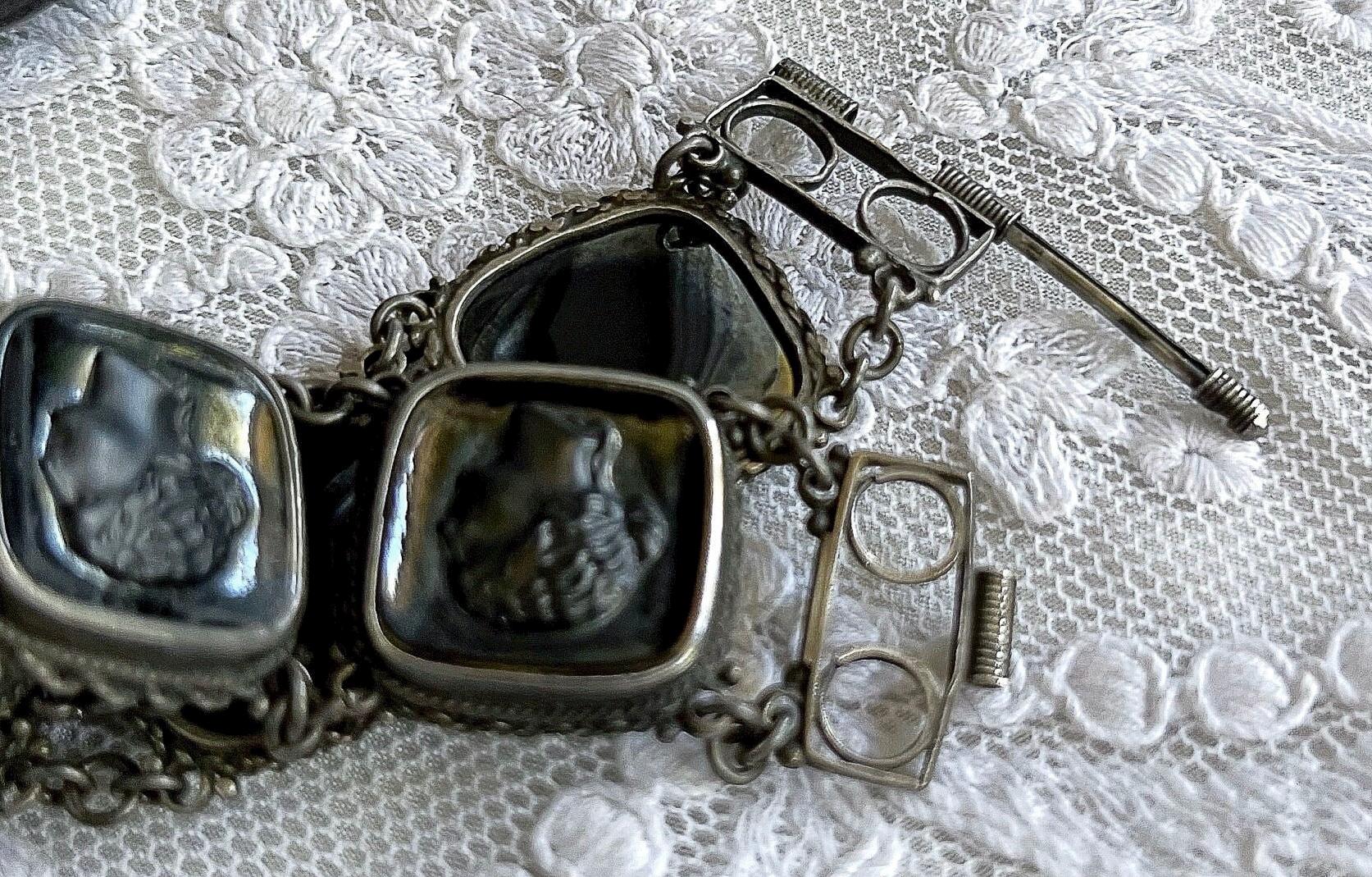 Featuring an exquisite example of an antique oxidized sterling silver Victorian Mourning bracelet adorned with beautiful genuine Obsidian Bezel set Cameos with an antique Pin clasp. Bracelet measures approximately 7.5 inches around with Cameos measuring approximately .75 inches in diameter at 26.8 grams respectively. Bracelet is in excellent antique condition with functional clasp, a lovely patina with all stones intact and accounted for. Beautifully handcrafted this is an exceptional and rare collectible piece!