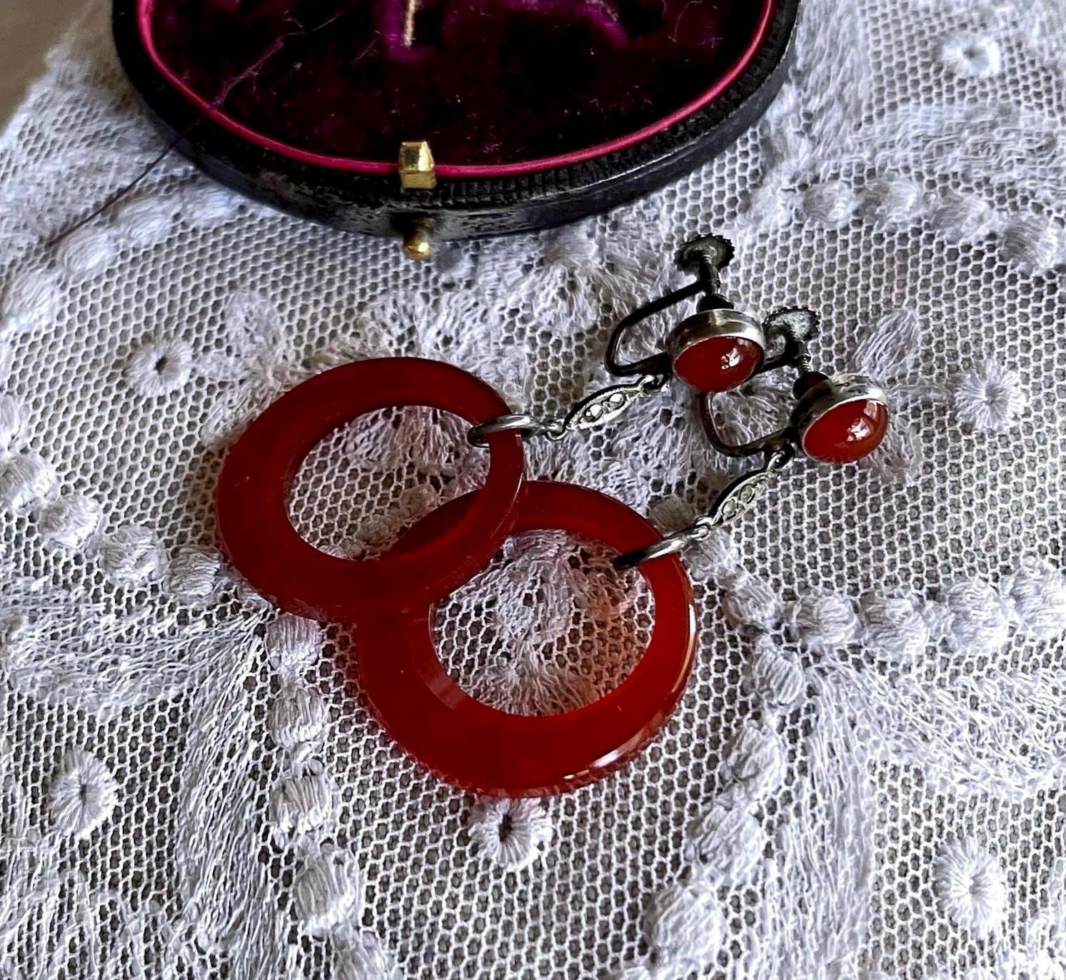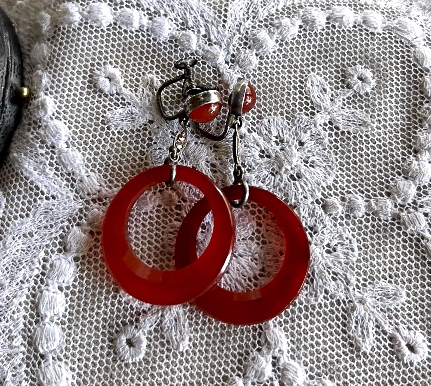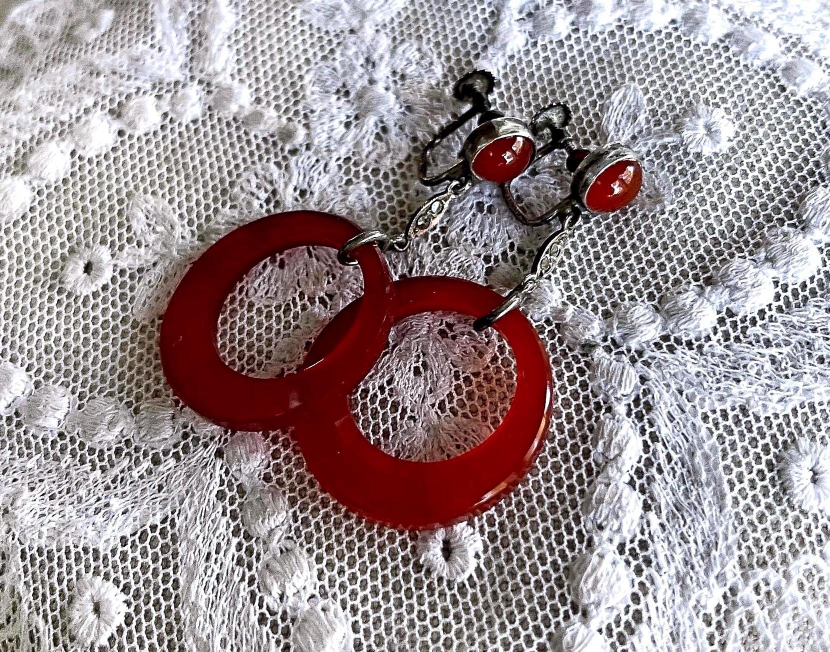 Featuring a gorgeous rare one of a kind antique 1920s Art Deco stamped sterling silver screw back drop earrings adorned with luminous Red Czech Glass rings and cabochon faceted Marcasite accented drop earrings. This beauties are in excellent antique condition, with functional clasps, glass rings intact with a lovely patina, hallmarked STERLING with pat. on the clasps. Measuring approximately 2 inches long at 3.89 grams respectively this unique earrings are ready to wear. Haven’t seen anything like them!