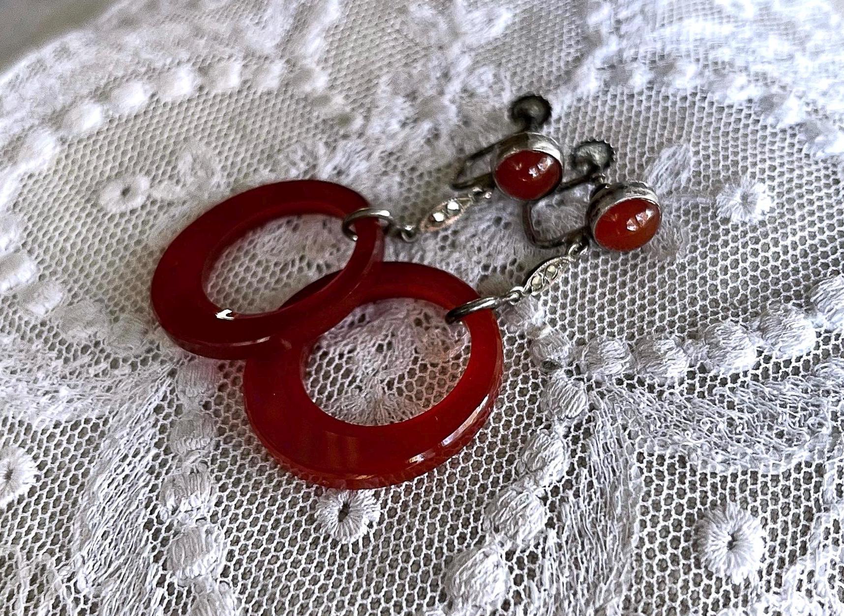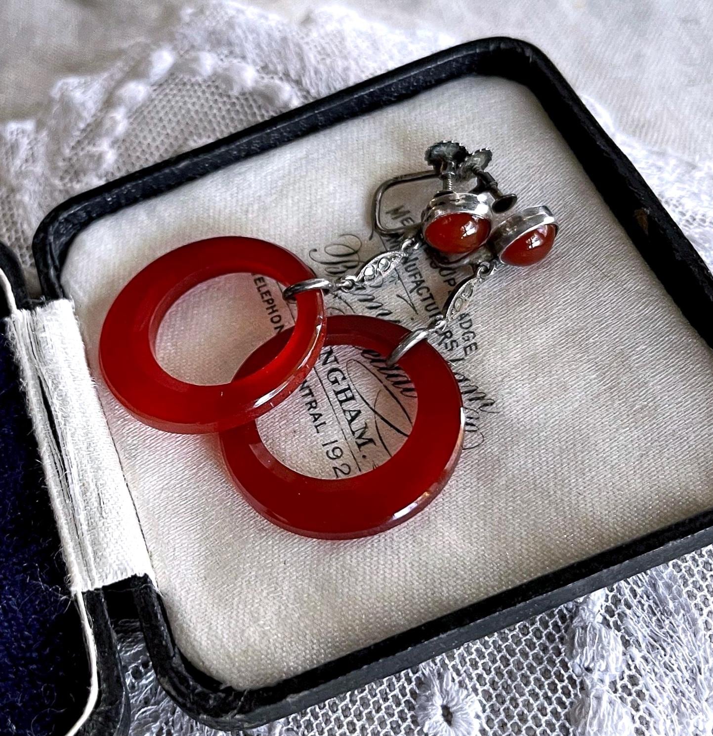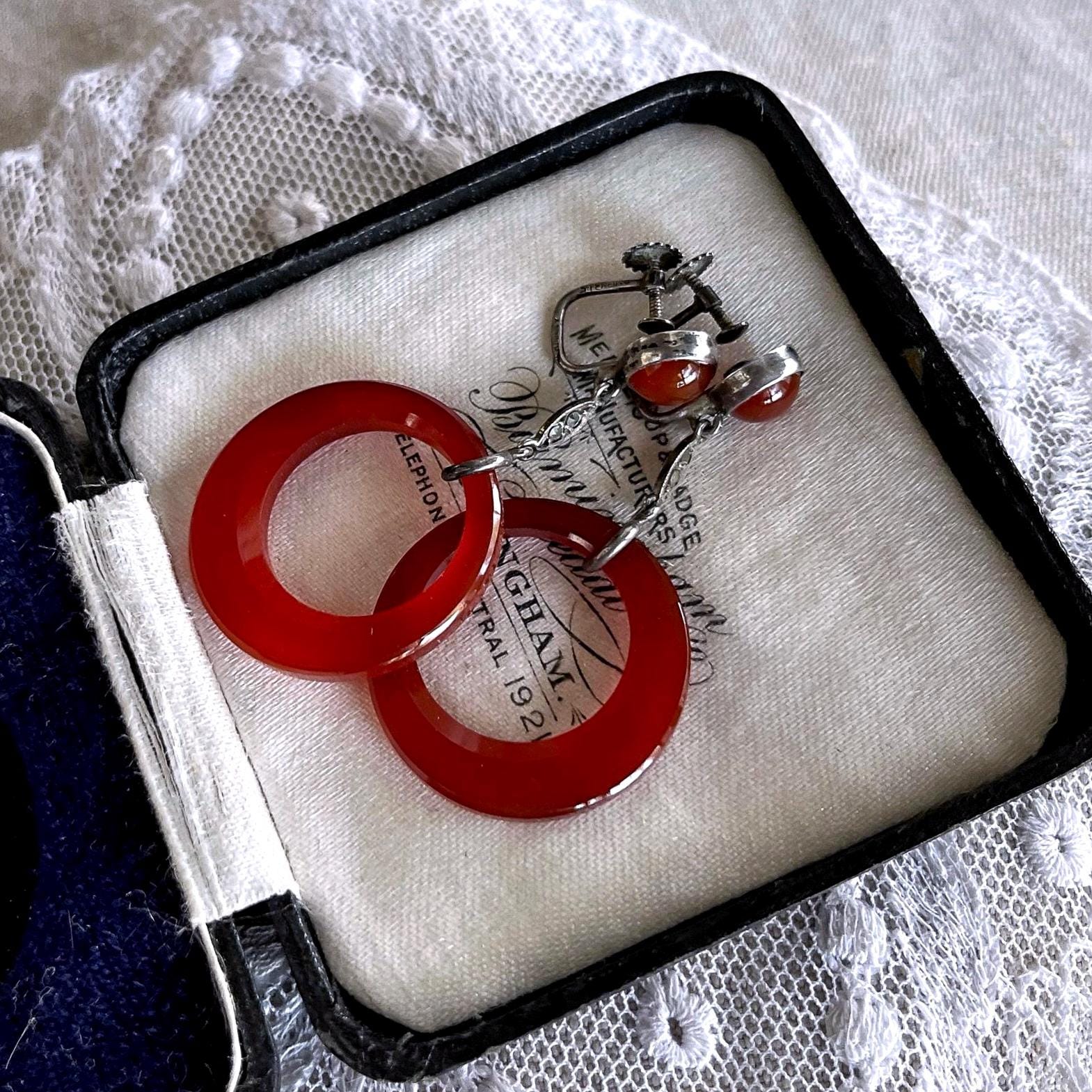Featuring a gorgeous rare one of a kind antique 1920s Art Deco stamped sterling silver screw back drop earrings adorned with luminous Red Czech Glass rings and cabochon faceted Marcasite accented drop earrings. This beauties are in excellent antique condition, with functional clasps, glass rings intact with a lovely patina, hallmarked STERLING with pat. on the clasps. Measuring approximately 2 inches long at 3.89 grams respectively this unique earrings are ready to wear. Haven’t seen anything like them!