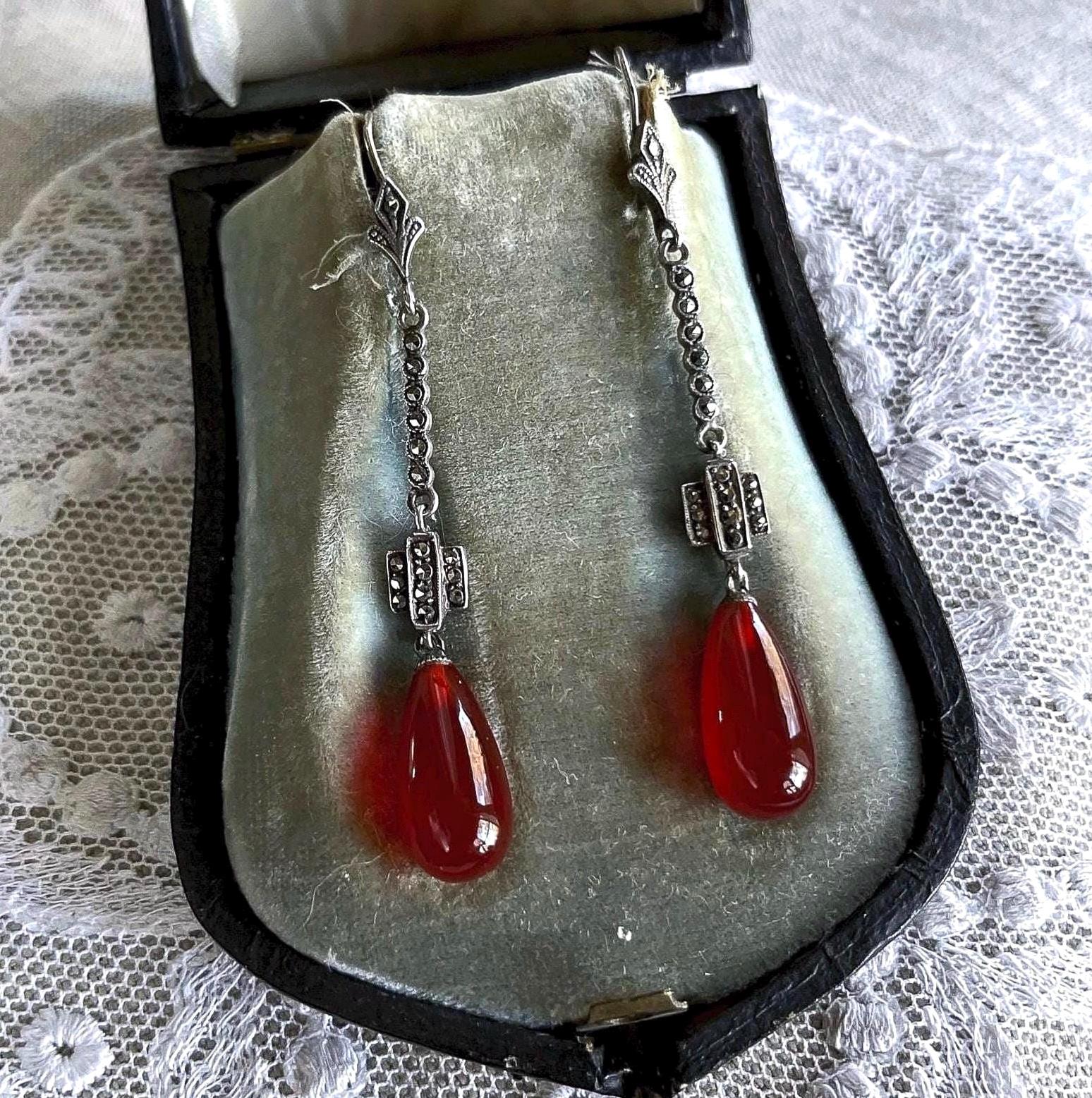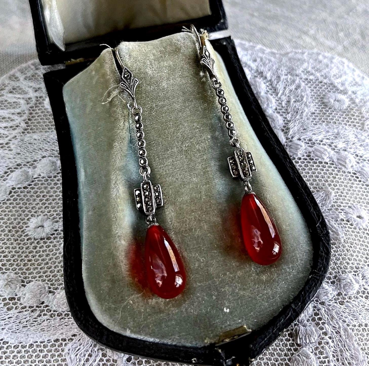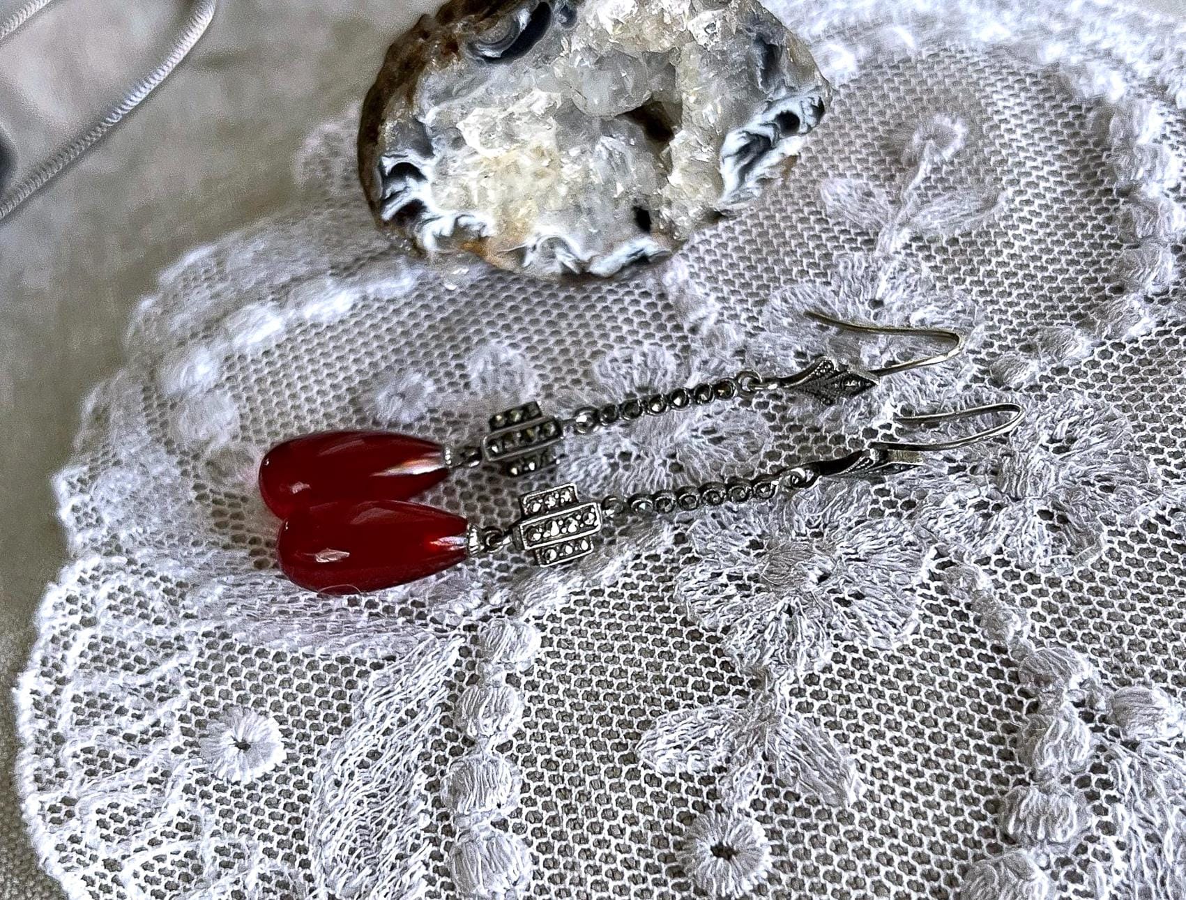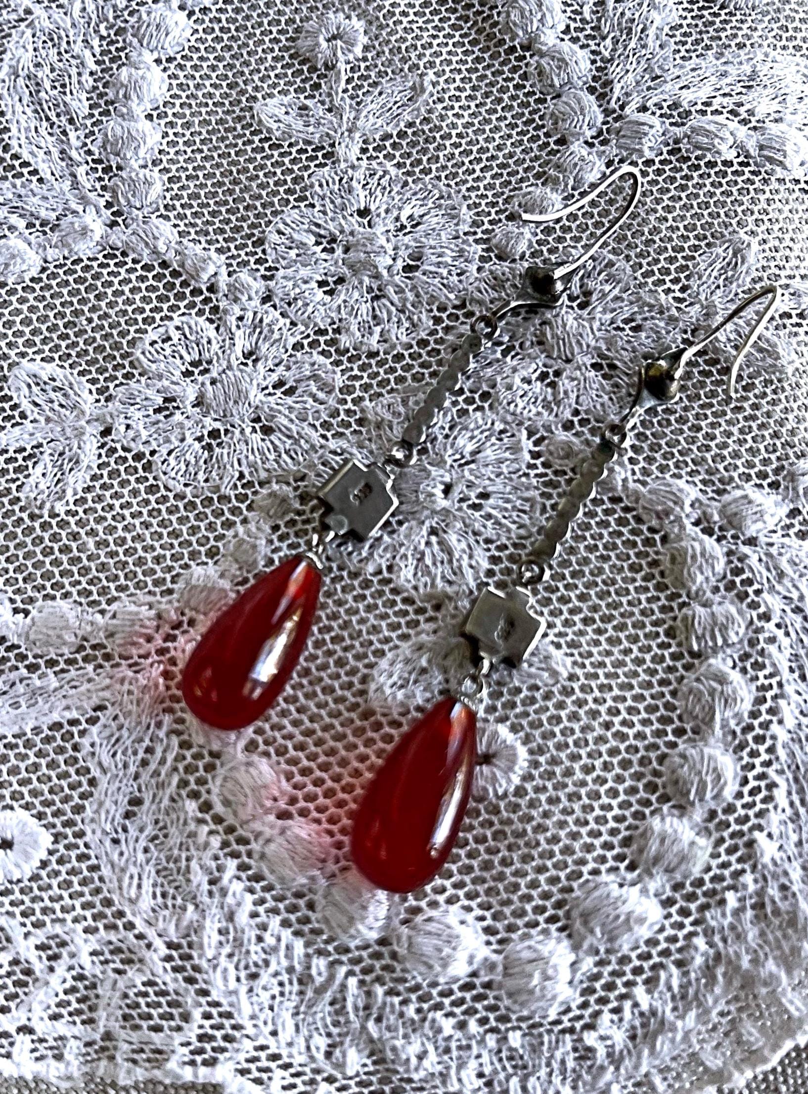 Featuring a gorgeous pair of antique Edwardian 1910s Germany 935 silver shepherds hook drop earrings adorned with beautiful Carnelian drop gemstones accented with brilliant faceted marcasite crystals. Earrings measure approximately 2.5 inches long at 5 grams respectively with both pieces in excellent antique condition with a lovely patina, all stones intact, hallmarked 935 on the reverse. These beauties are just stunning, collectible and ready to wear!