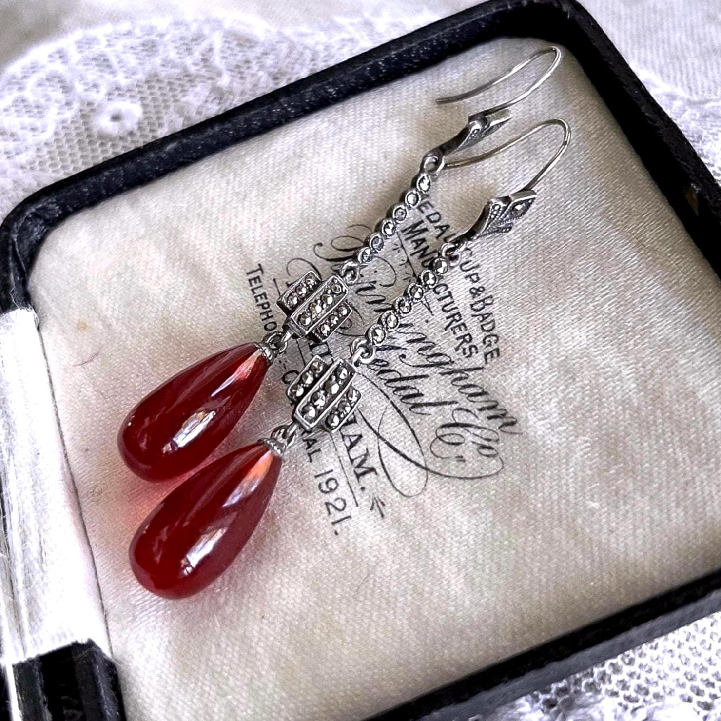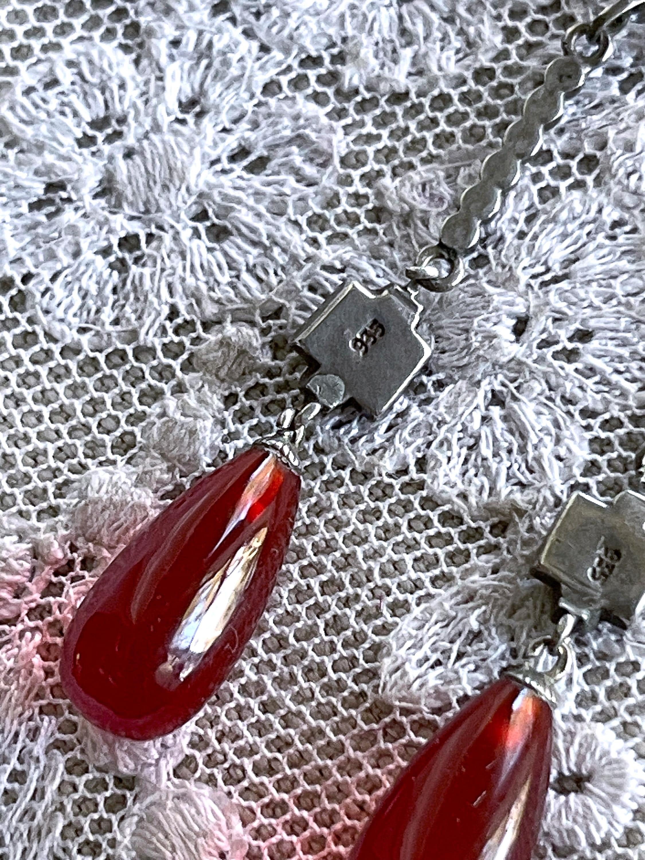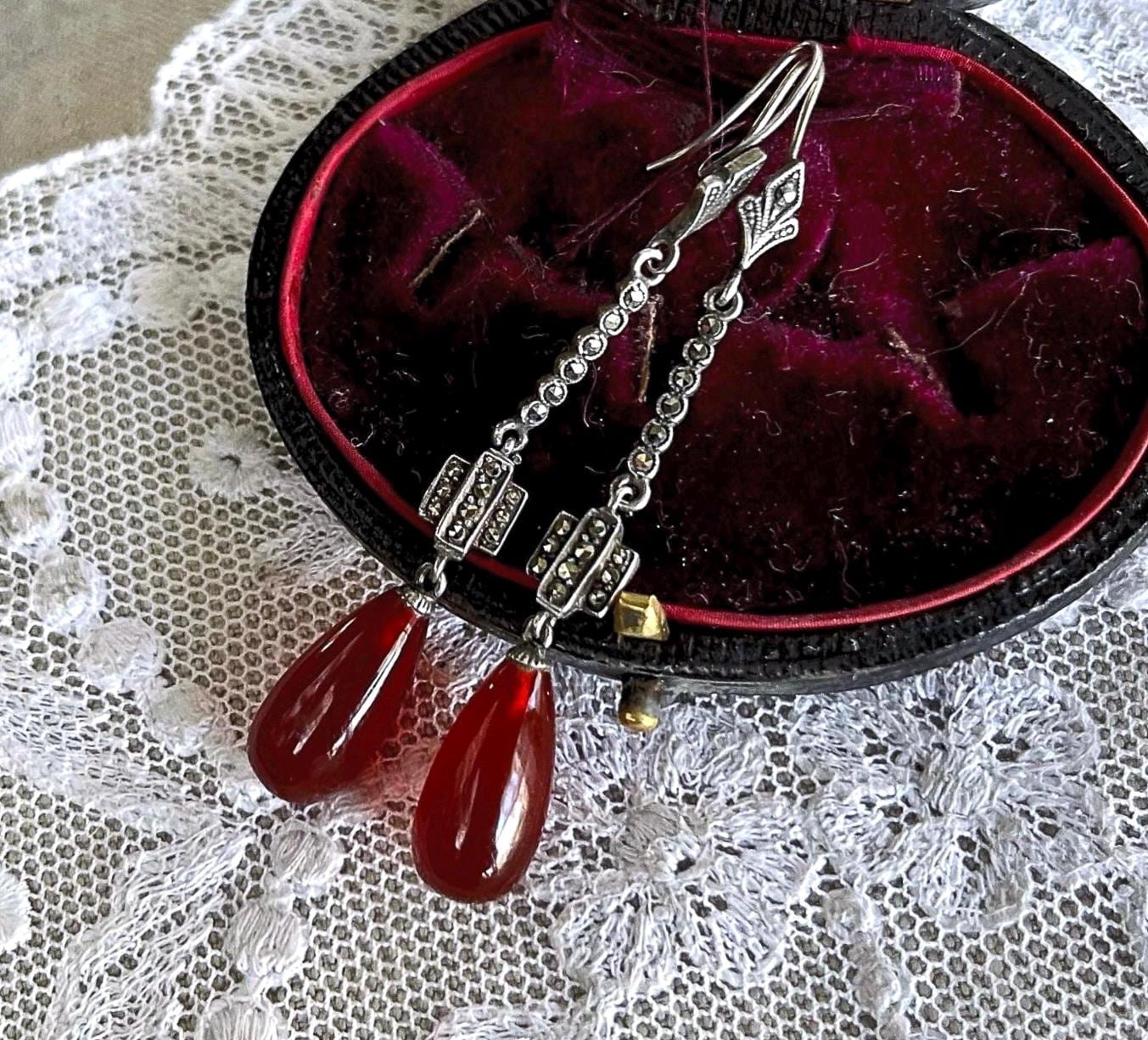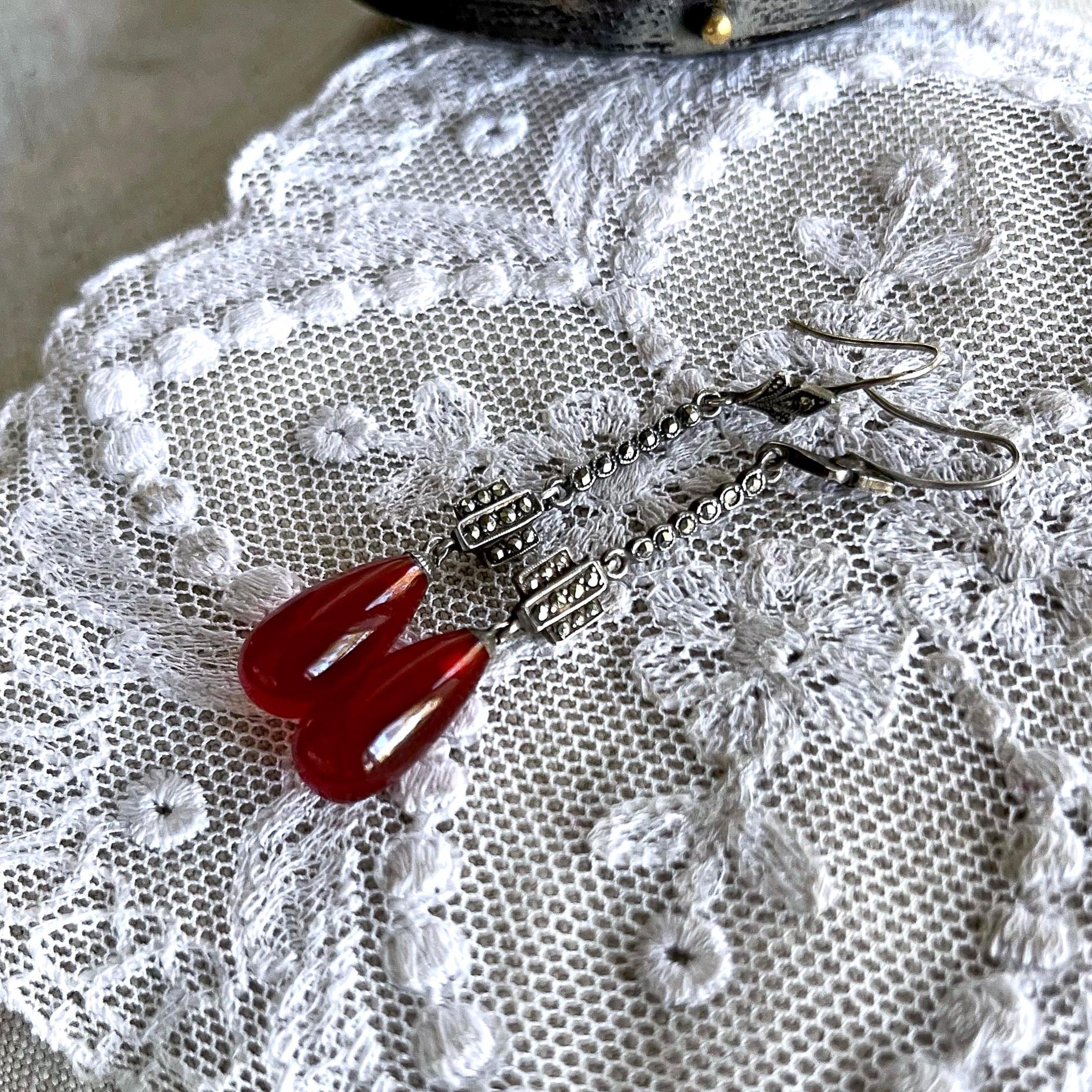 Featuring a gorgeous pair of antique Edwardian 1910s Germany 935 silver shepherds hook drop earrings adorned with beautiful Carnelian drop gemstones accented with brilliant faceted marcasite crystals. Earrings measure approximately 2.5 inches long at 5 grams respectively with both pieces in excellent antique condition with a lovely patina, all stones intact, hallmarked 935 on the reverse. These beauties are just stunning, collectible and ready to wear!