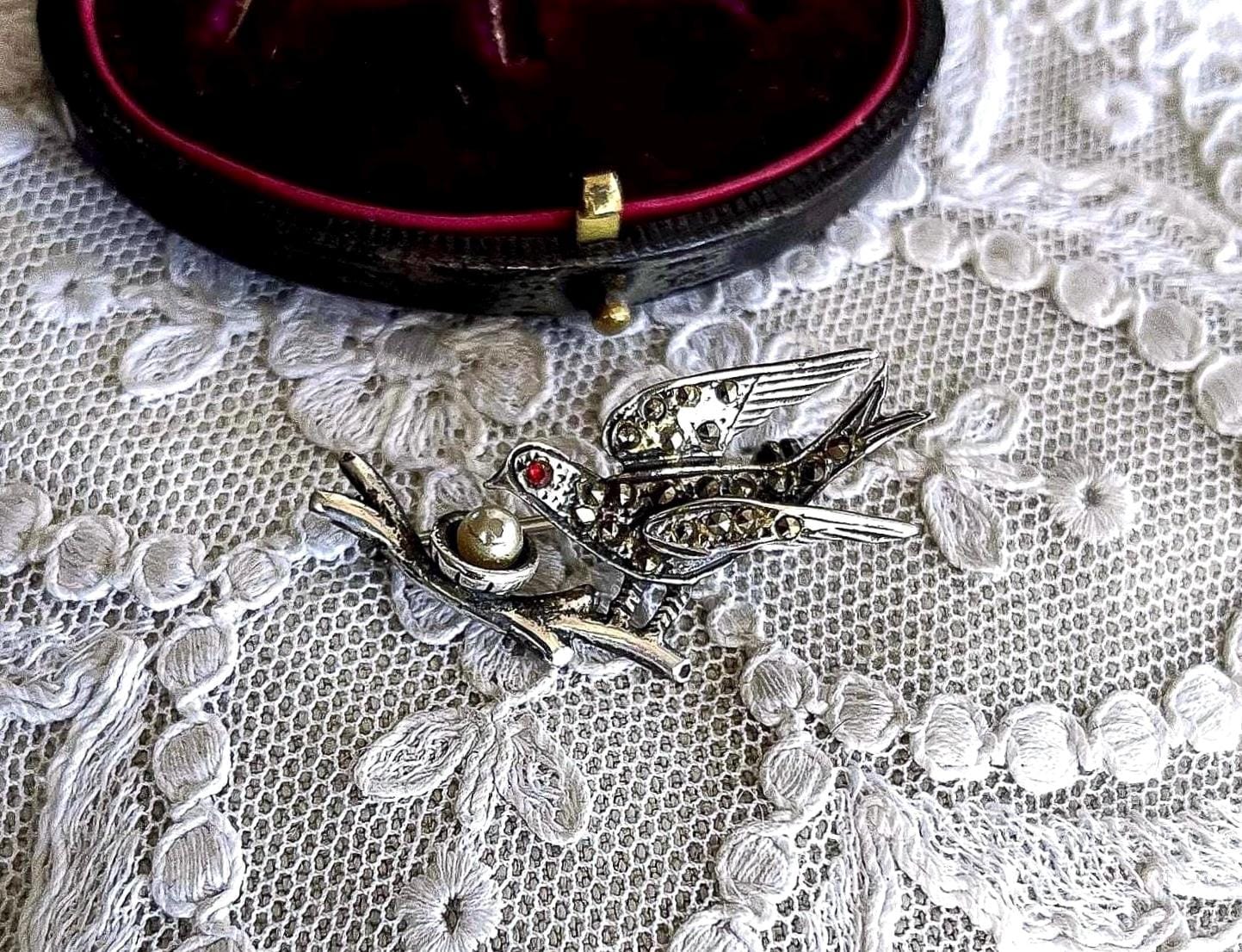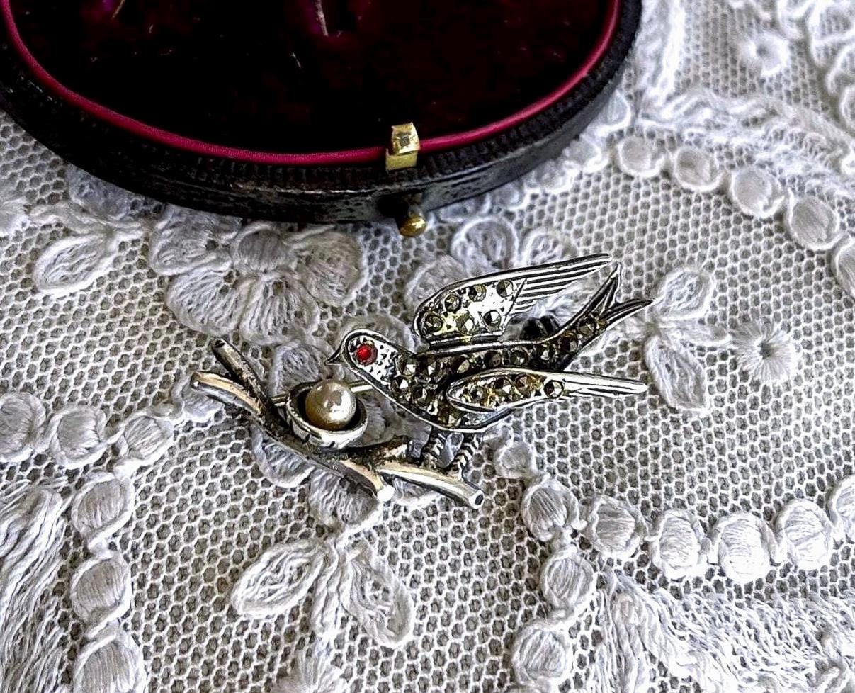 Featuring a beautiful vintage Portuguese Mid Century 835 silver flying bird brooch adorned with a genuine garnet seed bead with a luminous glass pearl accented with brilliant faceted marcasite crystals. Brooch measures approximately 1 inch at 4.02 grams respectively and is in excellent vintage condition with a functional clasp, a nice patina with all stones intact and accounted for. Hallmarked on the reverse this is a gorgeous piece, beautifully designed, collectible and ready to pass in for generations.