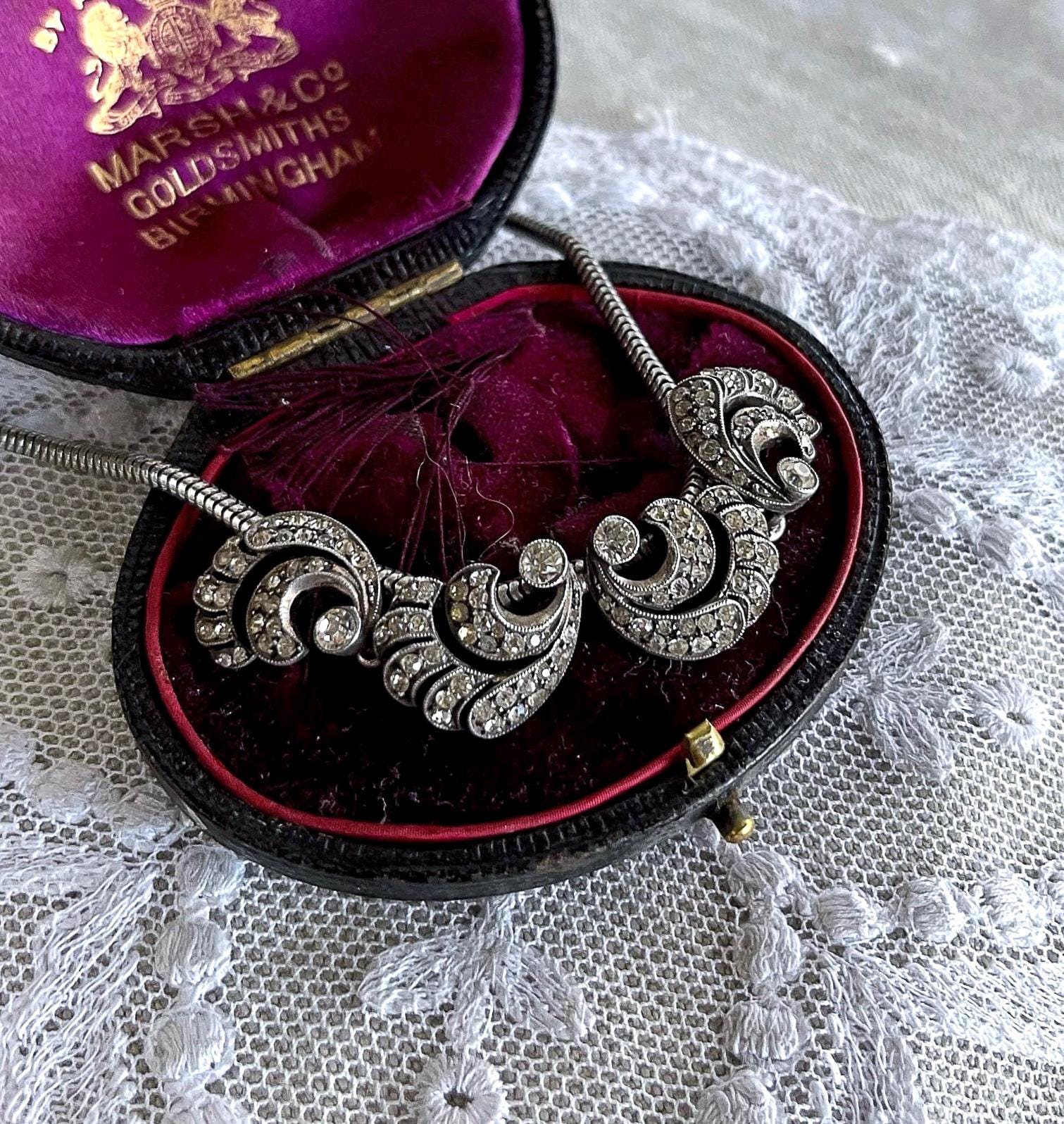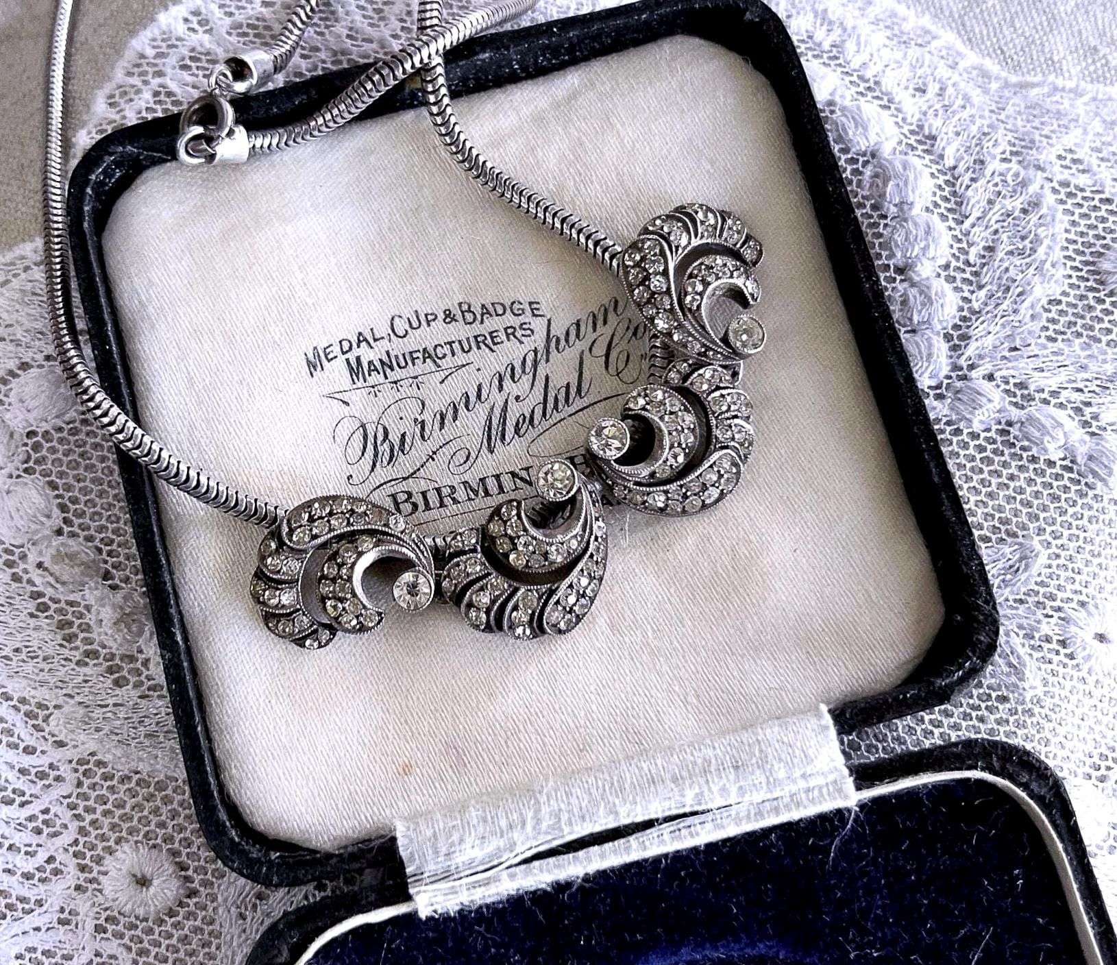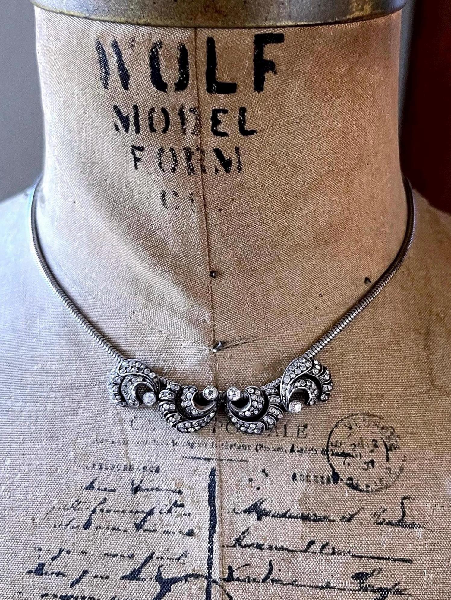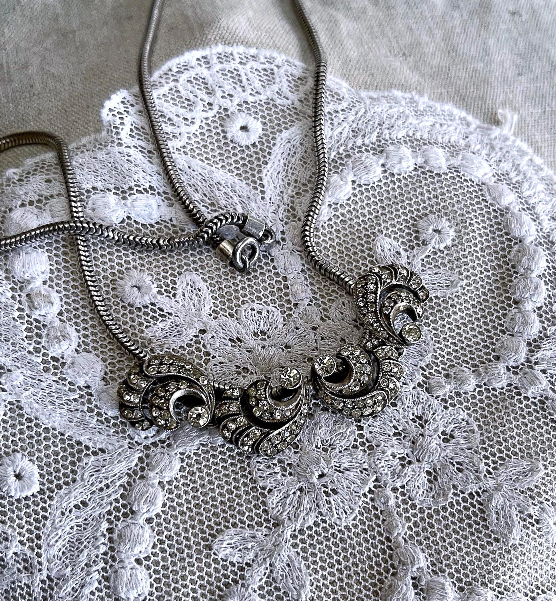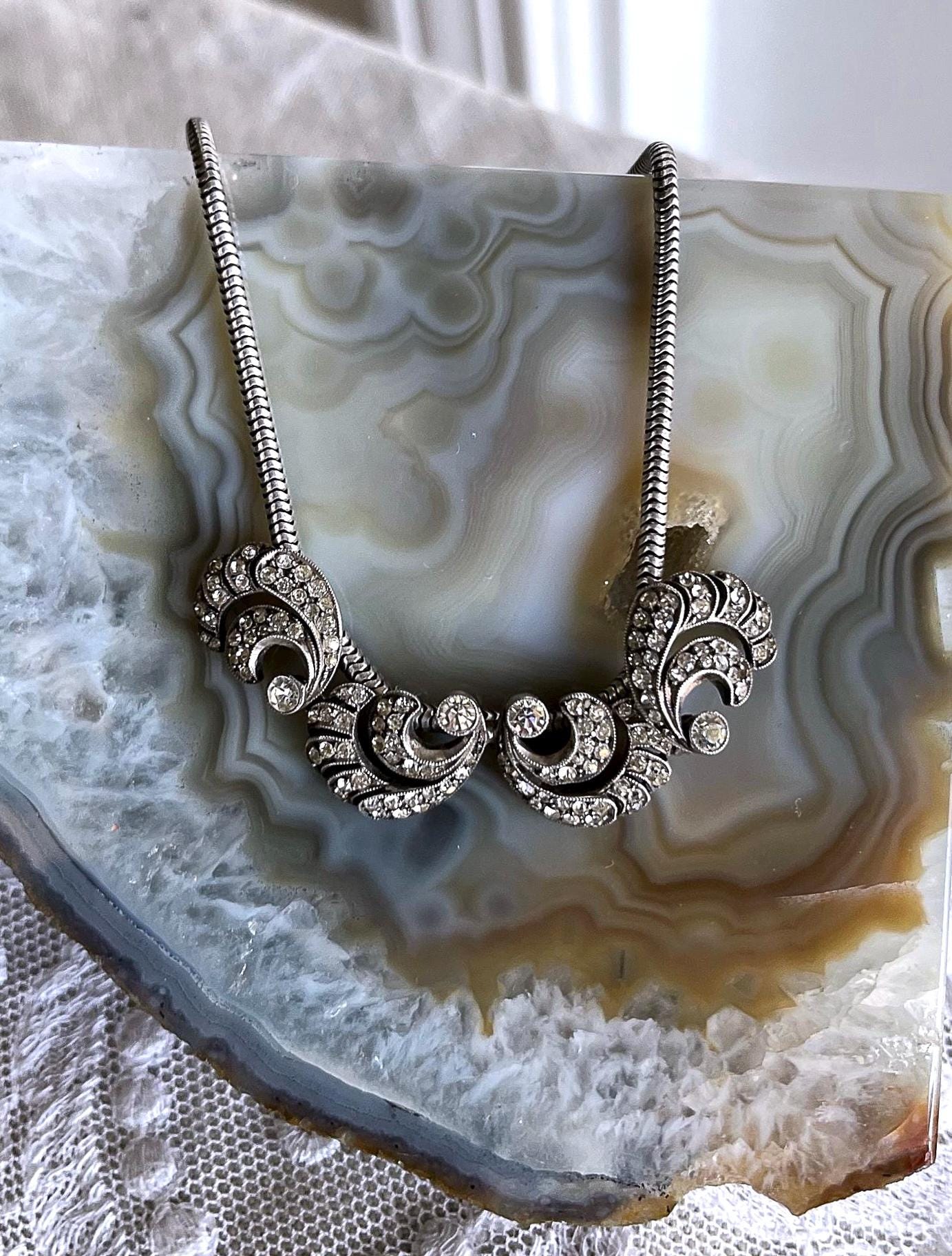 Featuring a unique vintage 1940s Germany 835 silver collier necklace adorned with brilliant sparkling faceted closed back paste stones. This lovely collectible necklace measures approximately 15.5 inches at 17.93 grams respectively and is in excellent vintage condition with a functional C spring clasp, with all stones intact and accounted for. Beautifully designed and handcrafted, stamped 835 on the reverse of pendant. Unique and beautifully designed.