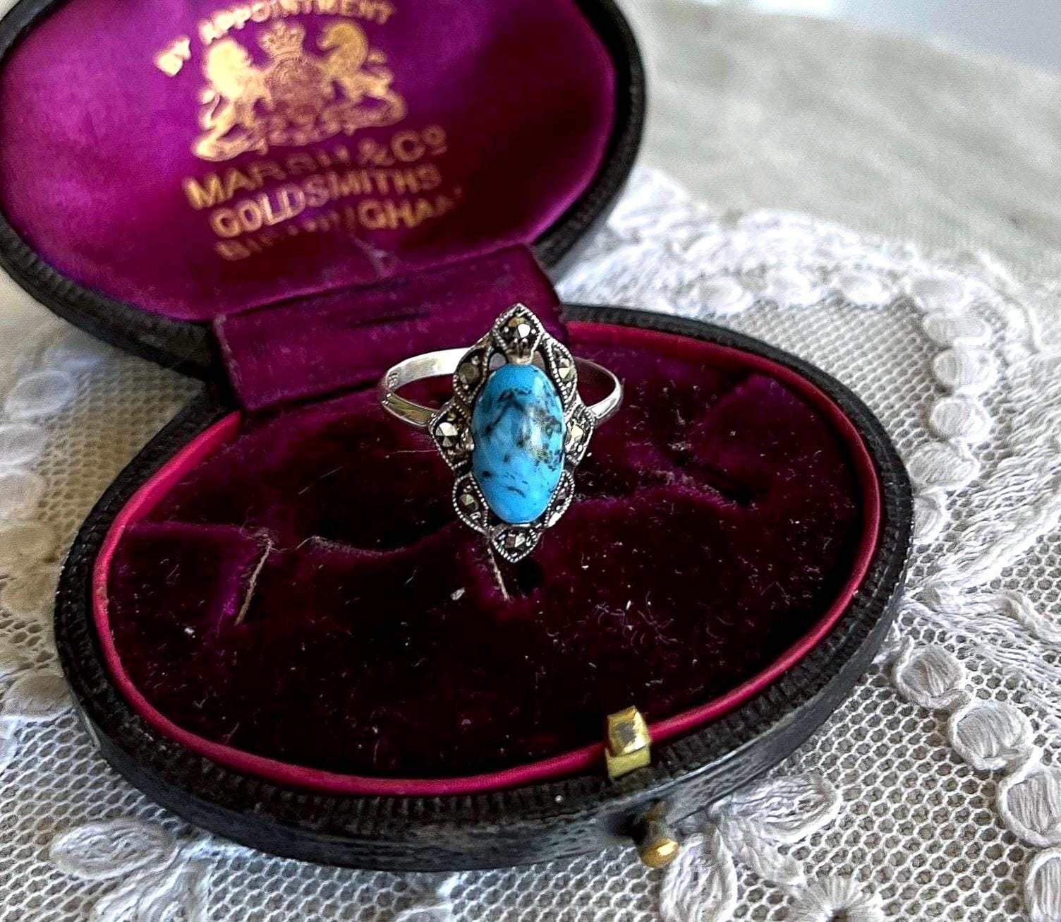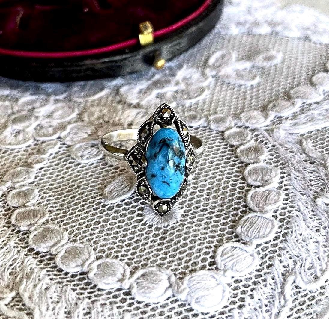Featuring a wonderful vintage Germany Austria 935 old European silver size 7 statement ring adorned with a beautiful luminous Turquoise glass oval Cabochon set in a decorative open back setting accented with brilliant sparkling faceted marcasite crystals. Ring is in excellent condition with minimal wear, a slight patina with all stones intact and accounted for. Ring is approximately size 7 at 2.3 grams respectively. Stamped 935 on the inside of band, this is a beautiful collectible wearable piece!