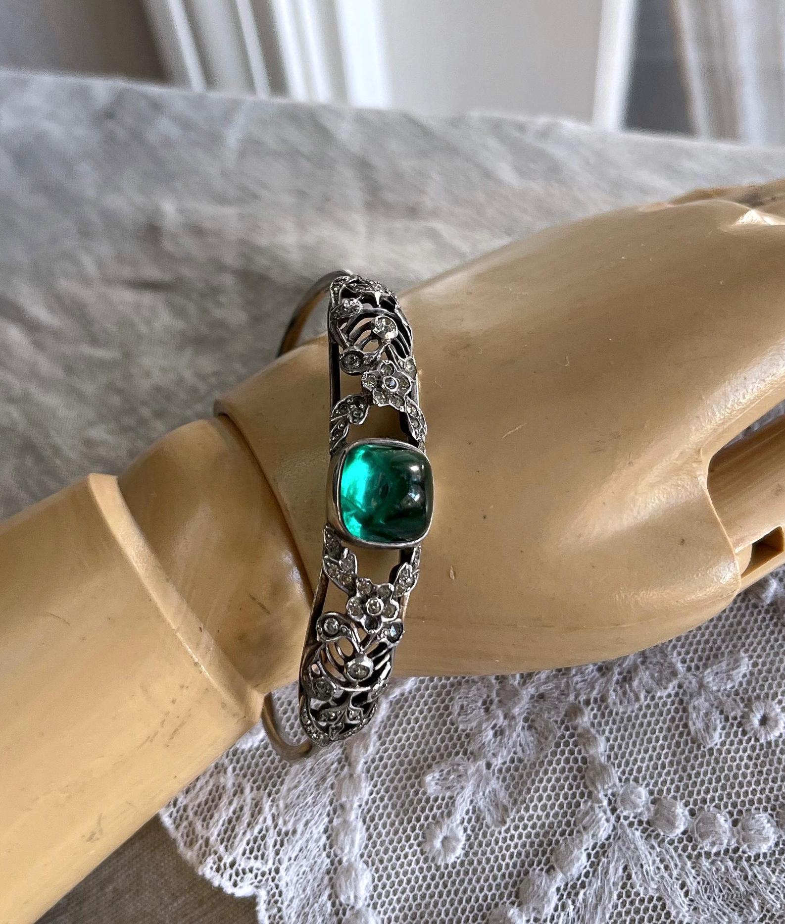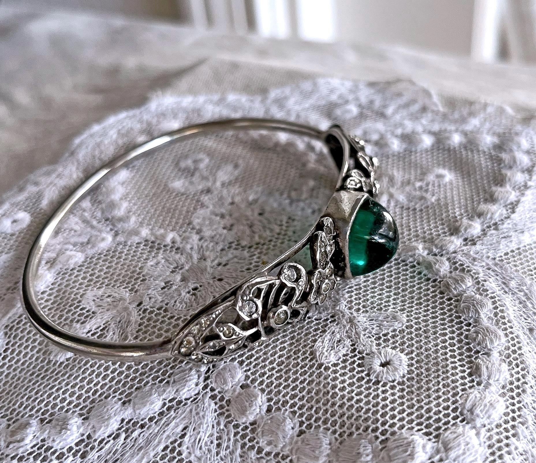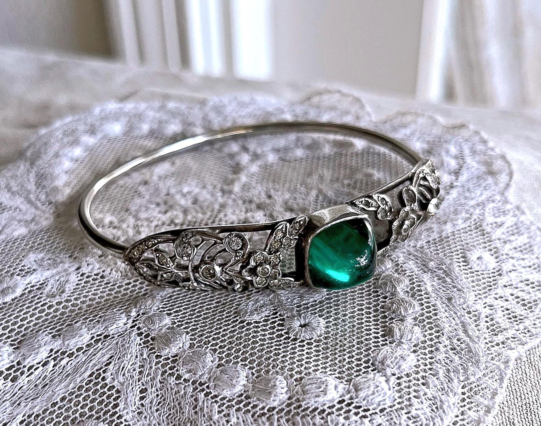 Featuring a gorgeous antique Art Nouveau sterling silver bangle bracelet adorned with luminous green paste Sugar loaf cabochons hallmarked April 14 1908 as well as STERLING on the inside of band. In excellent antique condition, a beautiful patina with all all stones intact. Bracelet measures approximately 7.8 inches around at 20.57 grams respectively. Highly collectible this is a wonderful heirloom piece, completely wearable and ready to pass on for generations.