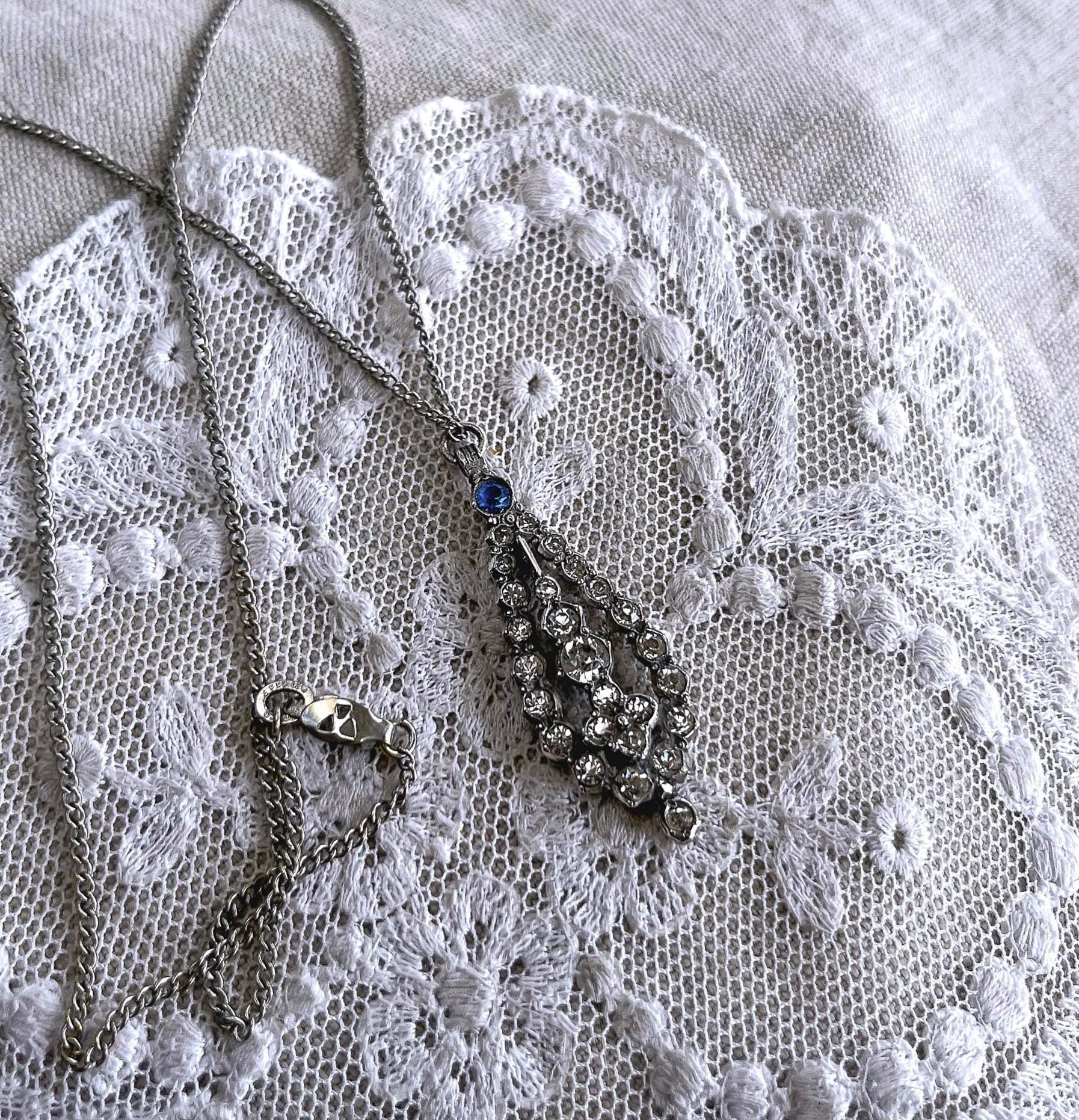 Featuring a lovely antique Edwardian 1910s Sterling Silver pendant necklace adorned with a beautiful brilliant foiled closed back set Paste stones. Necklace is in excellent antique condition with a stamped STERLING antique fold clasp, a beautiful patina with all stones intact and sparkling. Measuring approximately 17 inches around with a 1.2 inch pendant at 5.95 grams this is an extraordinary piece, beautifully designed and handcrafted over 120 years ago!