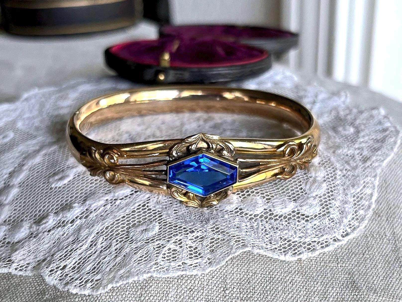 Featuring a beautiful antique Late Victorian ALLISON PAT. October 8, 1908 shining gold filled bangle bracelet adorned with a luminous faceted bezel set sapphire blue paste stone set in a closed decorative setting. Bracelet measures approximately 7.2 inches around at 21.42 grams respectively. Bracelet tested as gold filled and is in excellent antique condition with a functional clasp, minimal patina with all components intact..