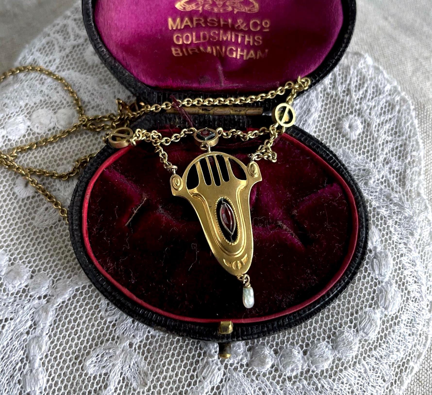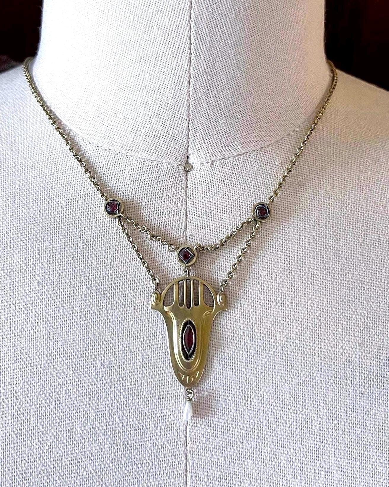 Featuring a highly sought after antique Victorian Pinchbeck Alloy dazzling negligee festoon necklace adorned with luminous Garnet paste stones in open back bezel settings accented with a genuine freshwater pearl dangle. This unique antique necklace measures approximately 17 inches around at 6.57 grams respectively and is in excellent antique condition with normal wear, functional hallmarked C spring clasp, a lovely matte champagne gold ,with all stones intact and accounted for. A wonderful heirloom piece.