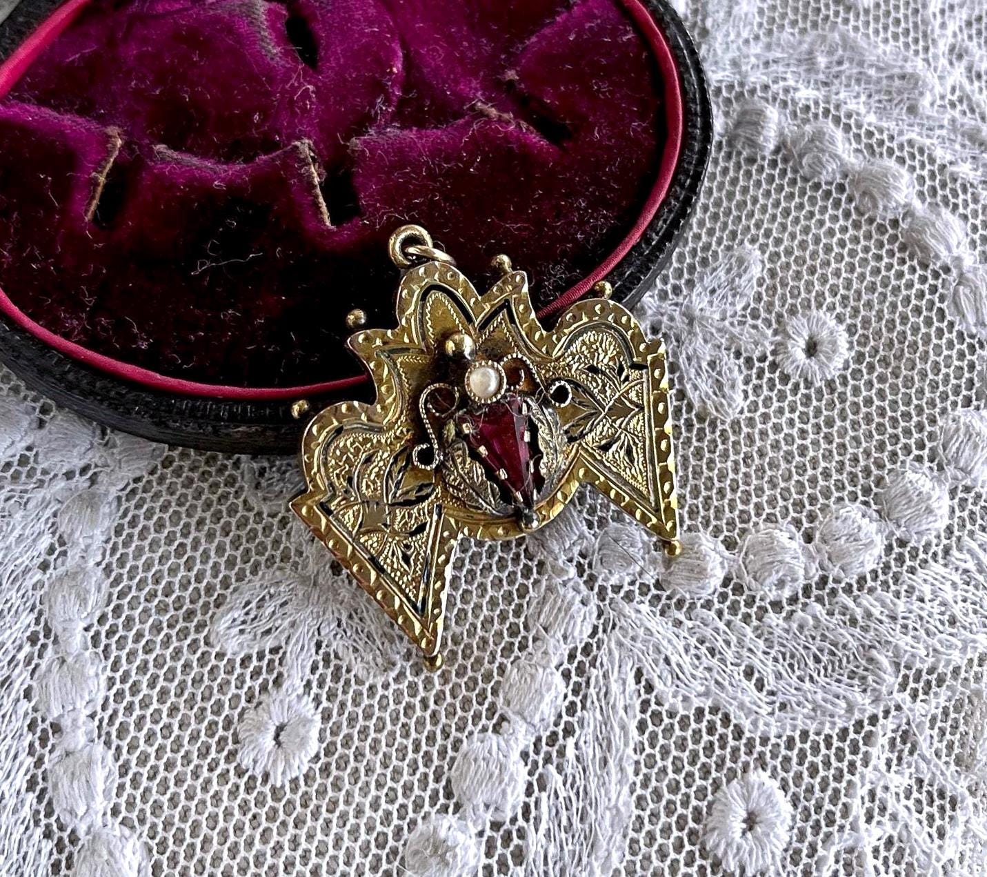 Featuring a beautiful antique Late Victorian Aesthetic lovely scrolled gold filled Pinchbeck collar pendant/brooch adorned with a luminous Ruby paste stone accented with a genuine seed pearl. This lovely piece measures approximately 1.3 inches long at 3.80 grams respectively and is in excellent antique condition with a functional C clasp, with all stones intact and accounted for. This lovely piece is ready to wear , beautifully designed and crafted!