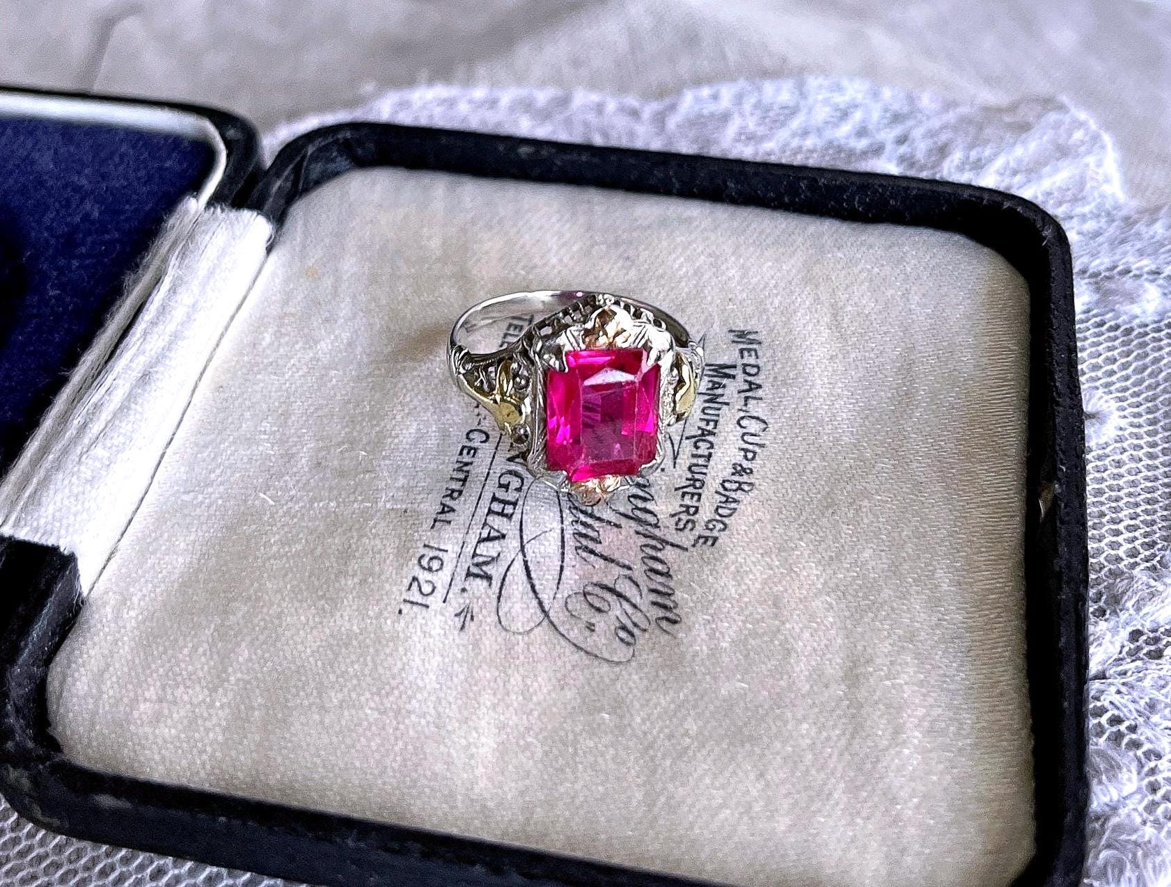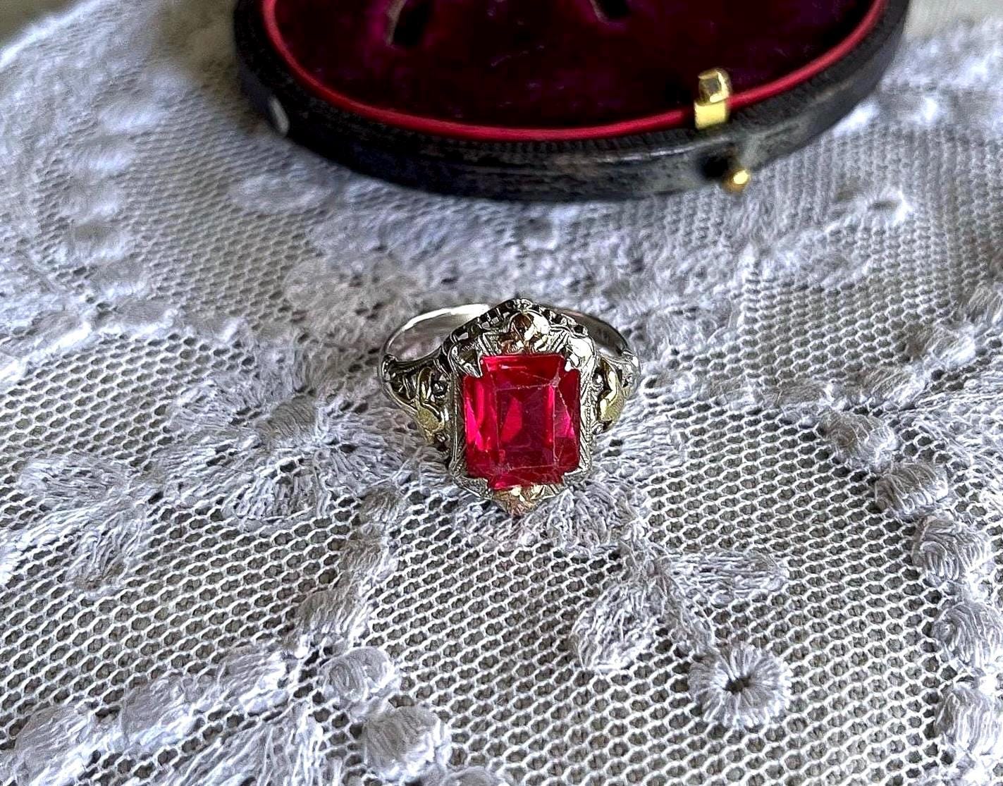 Featuring a fine antique Art Deco hallmarked 10k white and yellow gold cocktail Ring accented with a luminous simulated ruby gemstone set in an open back pronged setting. This gorgeous piece is in excellent antique condition with normal wear, hallmarked 10k on the inside of band with stone intact. Ring is approximately size 6 at 2.8 grams respectively. A wonderful wearable antique ring to pass on for generations.