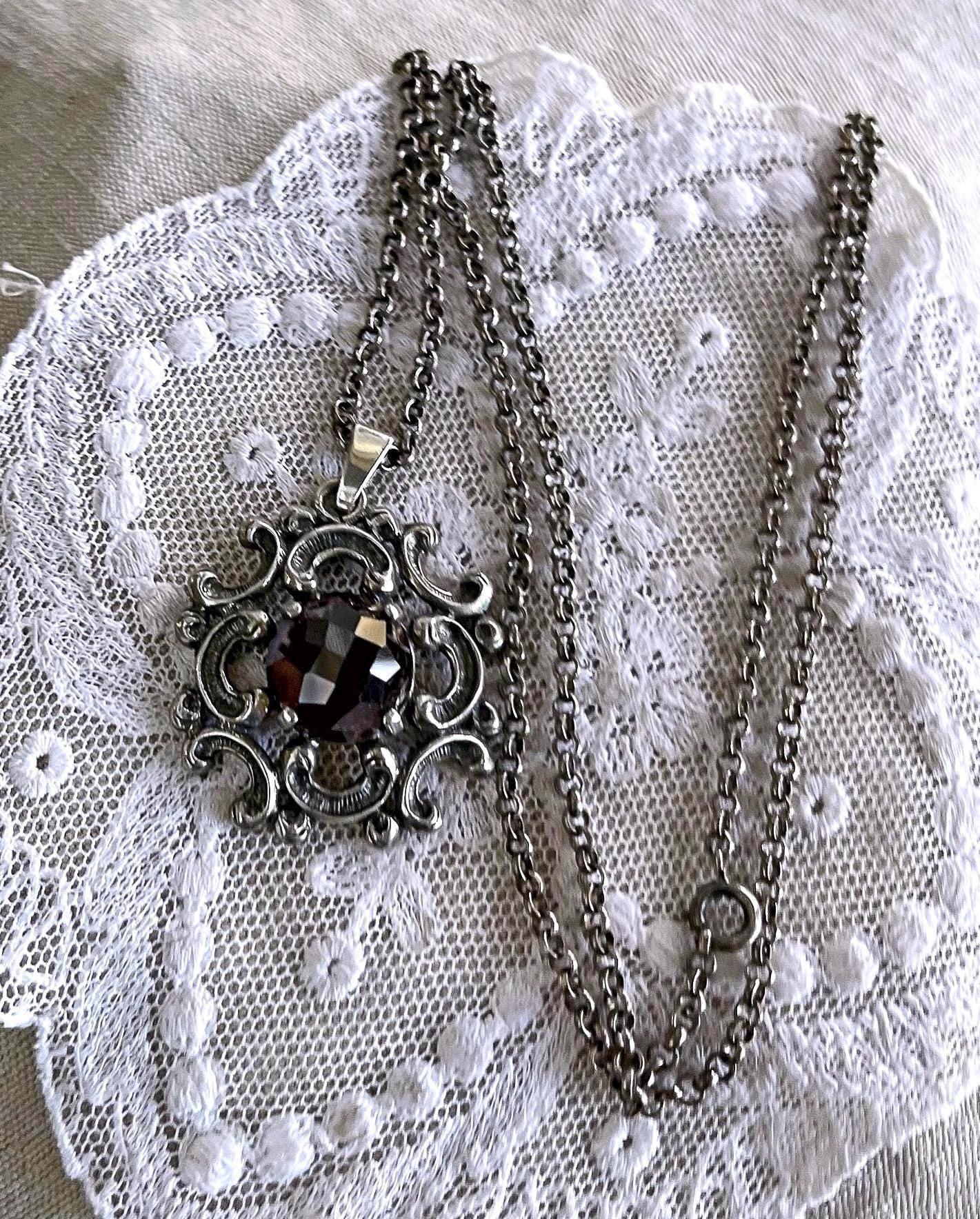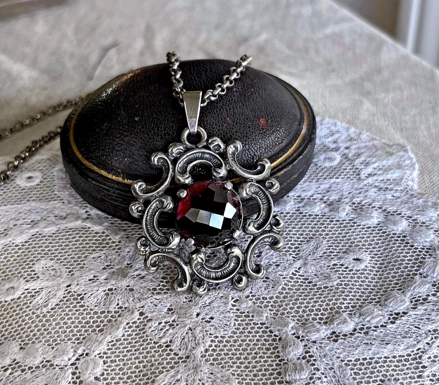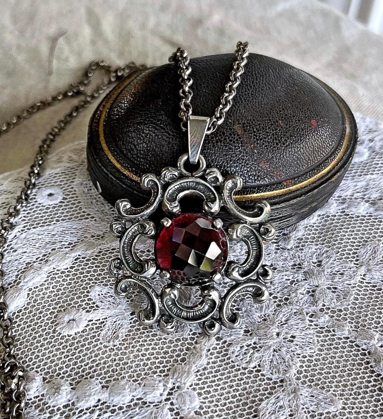 Featuring a magnificent vintage Austrian Jugendstil Art Nouveau stamped 835 silver ornate dirndl pendant necklace adorned with a gorgeous genuine rose cut garnet. This beautiful piece is in excellent condition with a functional clasp, a beautiful patina with all components intact, hallmarked 835 with makers mark on the reverse of pendant. Measuring approximately 24 inches long with a 1.5 inch pendant drop at 22 grams respectively this is a definite wearable investment, beautifully designed and handcrafted. Perfect for every occasion!