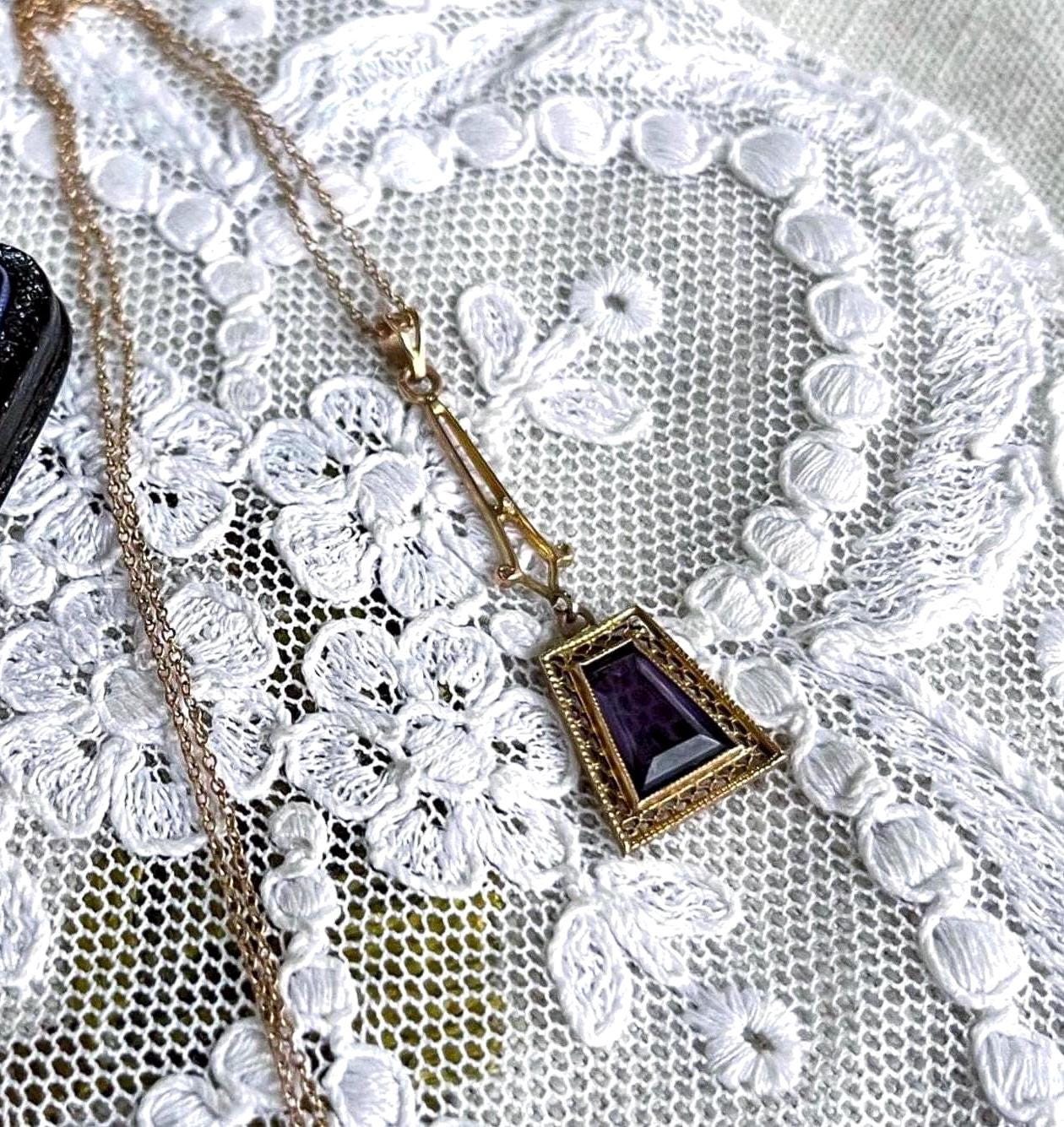 Featuring a beautiful vintage Art Deco solid 10k yellow gold pendant necklace adorned with a beautiful decorative Art Deco pendant accented with a brilliant faceted genuine Amethyst gemstone set in open back setting. Necklace is in excellent antique condition with a functional stamped C spring clasp, minimal wear with all components intact and accounted for. Necklace measures approximately 16 inches around with a 1.75 inch pendant drop at 1.9 grams respectively. An excellent investment, beautifully designed and ready to wear .