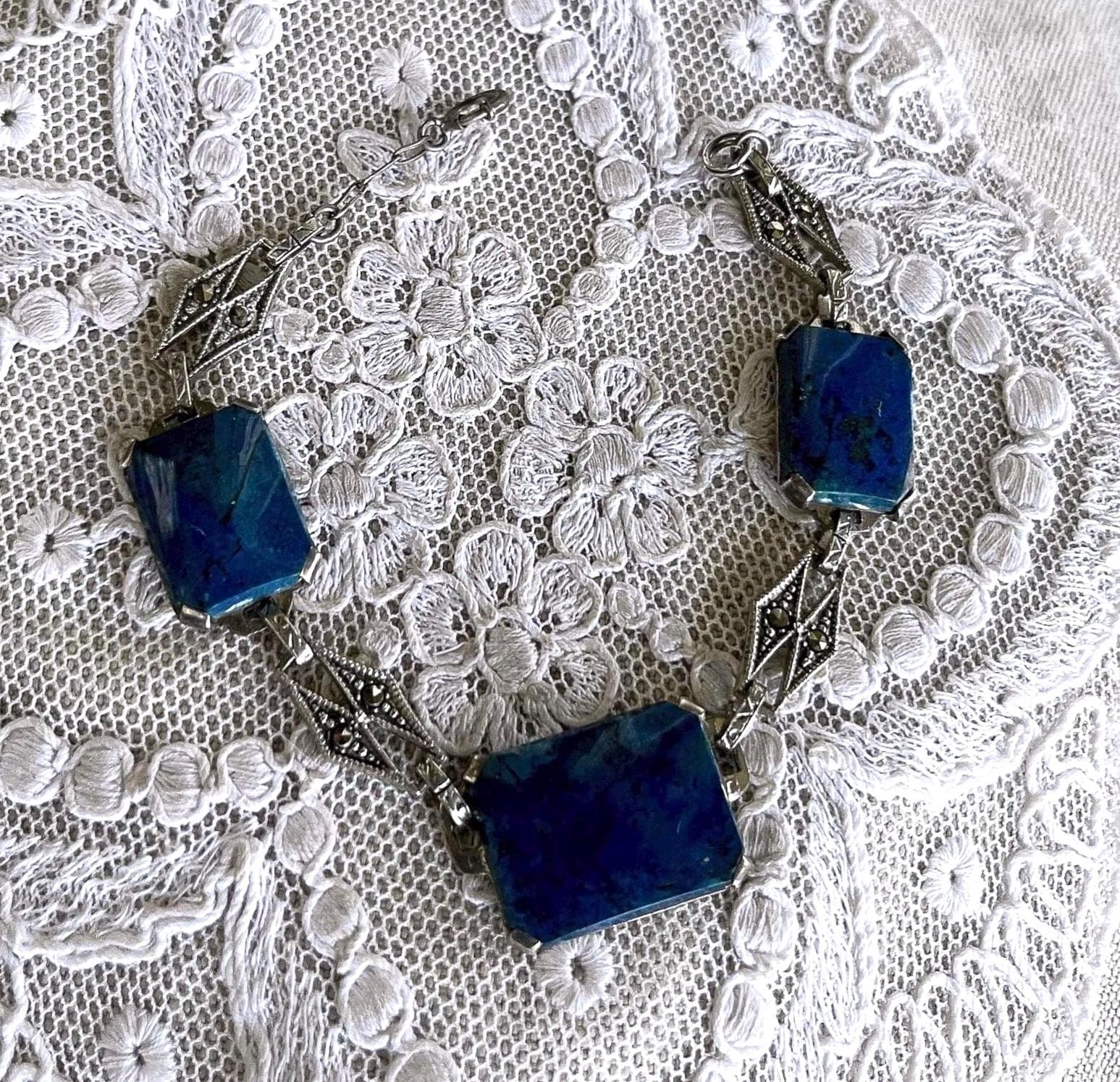 Featuring a beautiful pristine antique Art Deco 1920s-30s solid sterling silver ornate link bracelet adorned with prong set blue sodalite stones accented with brilliant sparkling faceted marcasite crystals. This gorgeous bracelet is in beautiful antique condition with a functional stamped STERLING antique thumbless clasp, a lovely patina with all stones intact and accounted for. Measuring approximately 7 inches around at 11.2 grams respectively, this bracelet was beautifully crafted and completely wearable. Hallmarked STERLING on the reverse of center stone as well as on clasp. a fine investment.