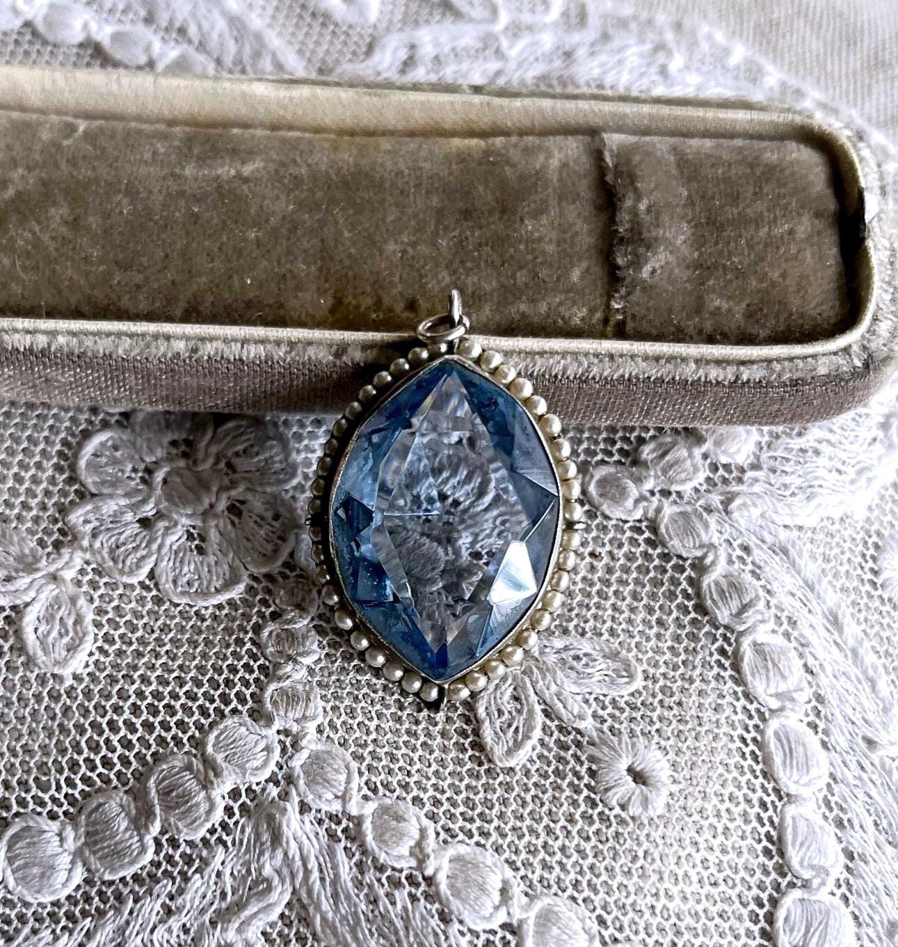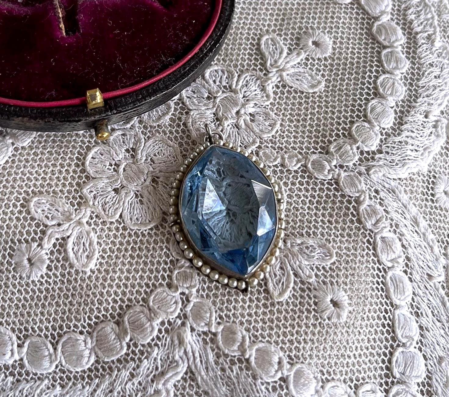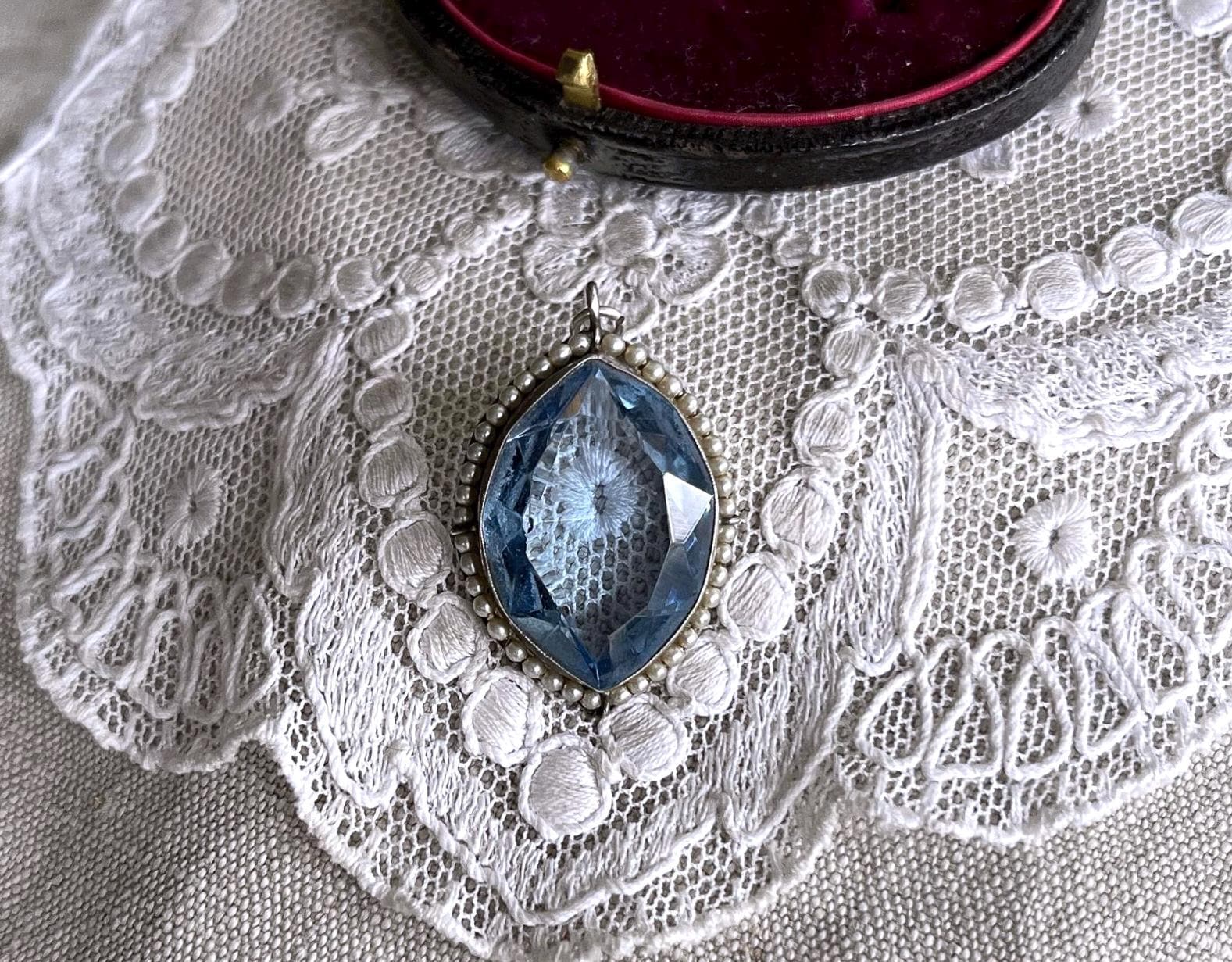 Featuring a gorgeous stately antique Edwardian Belle Époque sterling silver pendant adorned with a beautiful faceted marquee cut topaz paste stone flanked by luminous genuine seed pearls. Pendant is in excellent antique condition, with a slight patina, with all stones intact and accounted for measuring approximately 1.75 inches at 5.74 grams respectively. Beautifully made over 100 years ago, always appreciating and ready to wear and hand down for generations.