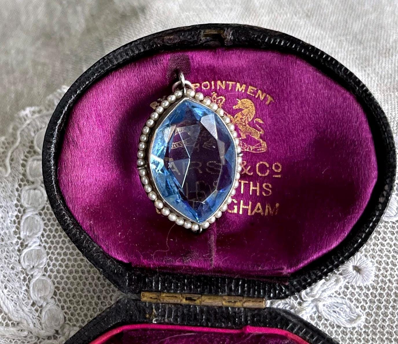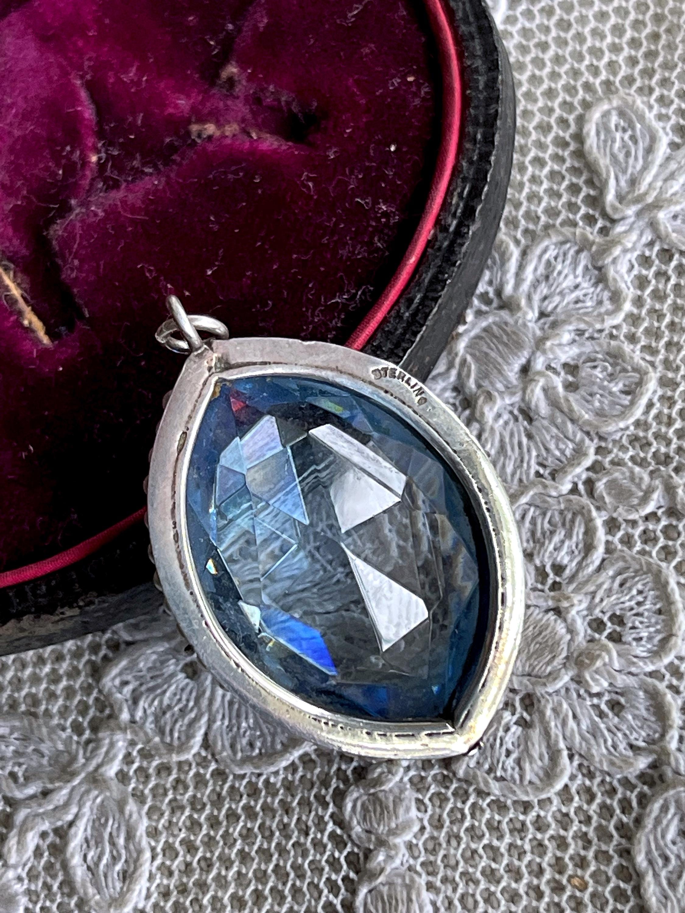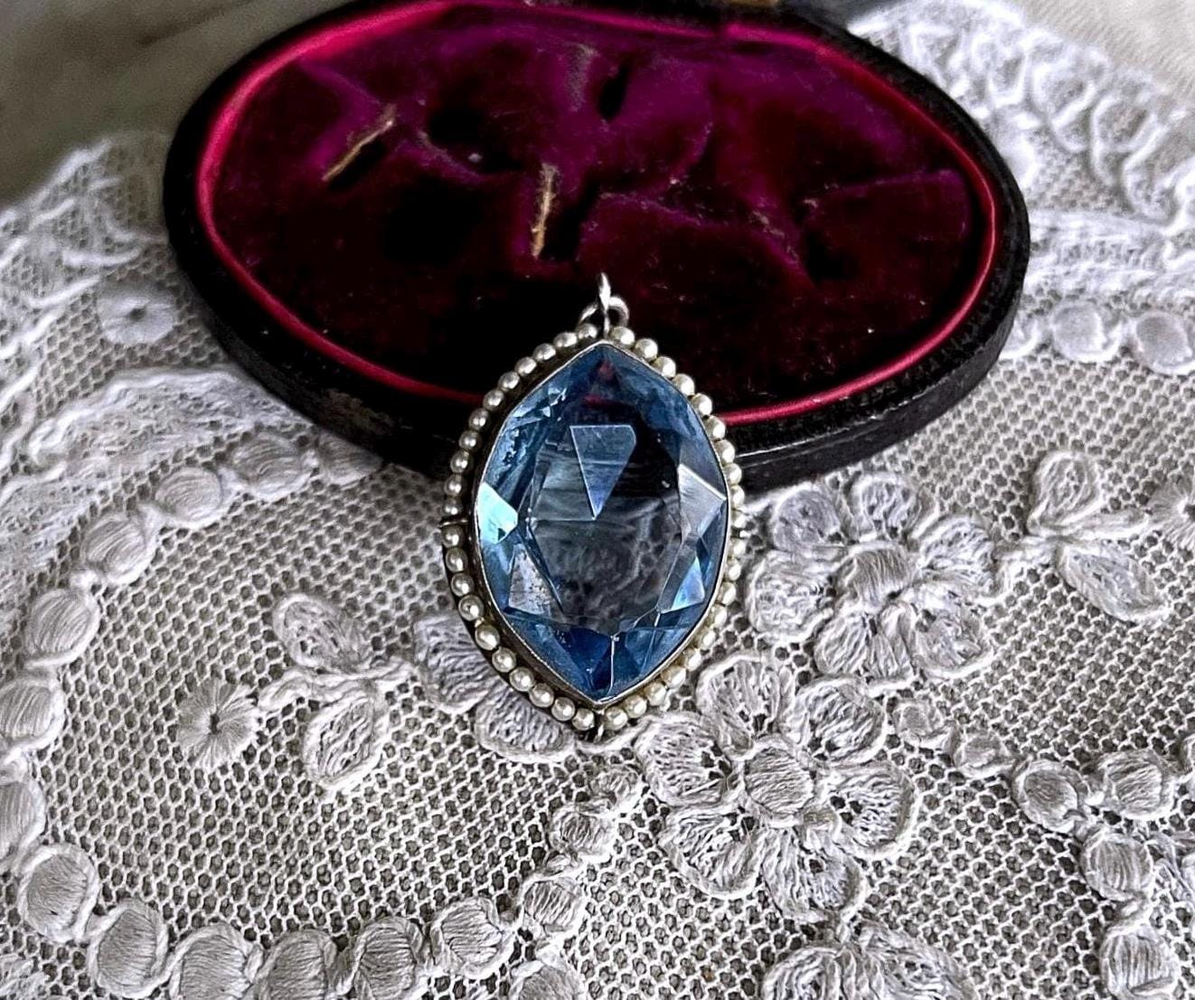 Featuring a gorgeous stately antique Edwardian Belle Époque sterling silver pendant adorned with a beautiful faceted marquee cut topaz paste stone flanked by luminous genuine seed pearls. Pendant is in excellent antique condition, with a slight patina, with all stones intact and accounted for measuring approximately 1.75 inches at 5.74 grams respectively. Beautifully made over 100 years ago, always appreciating and ready to wear and hand down for generations.