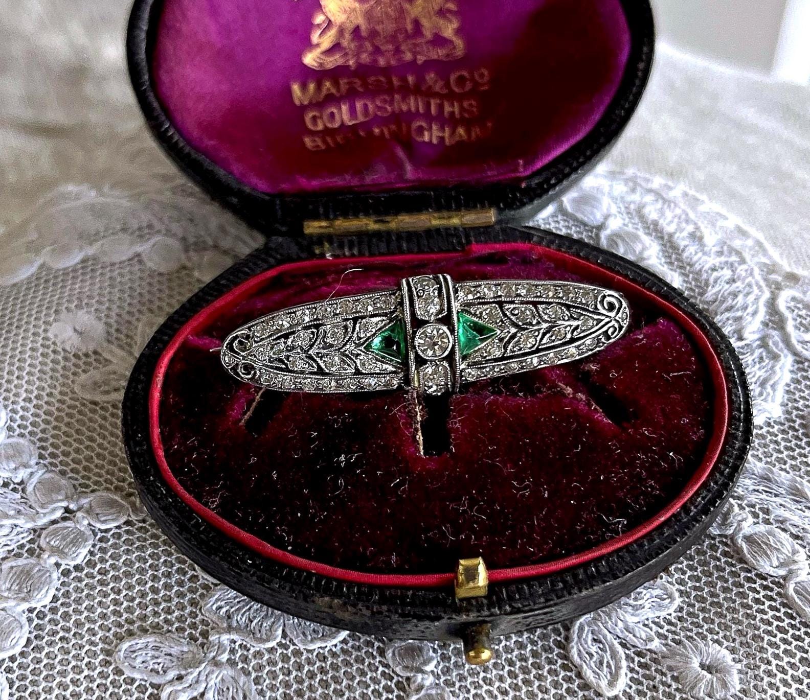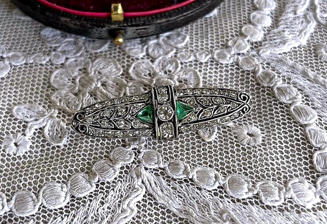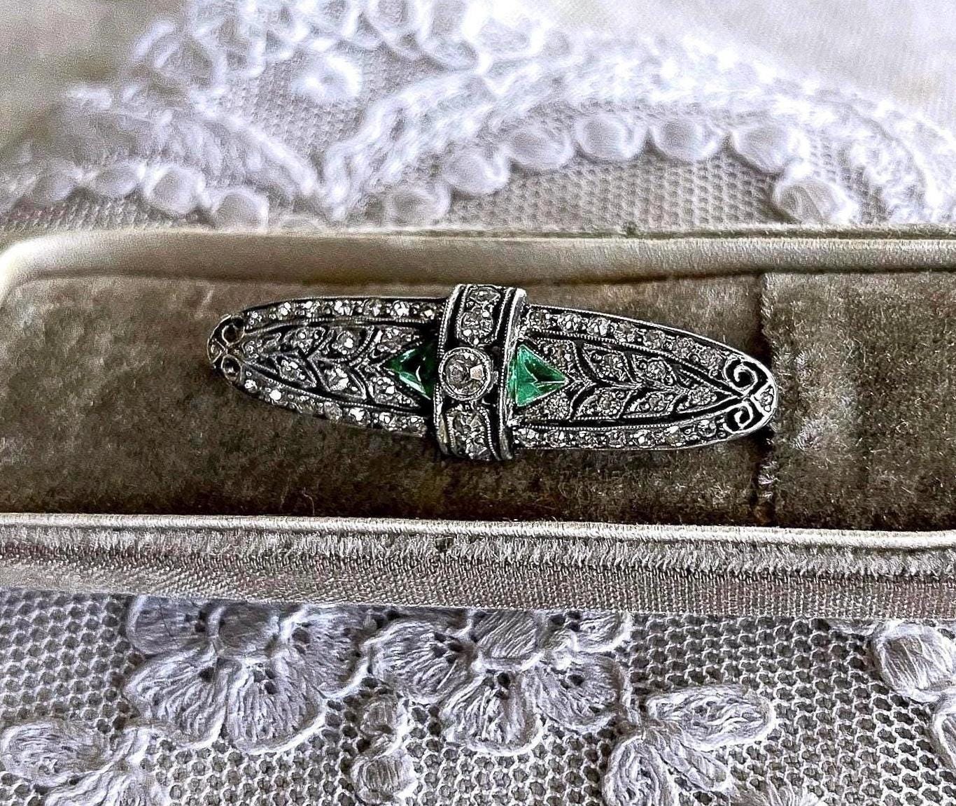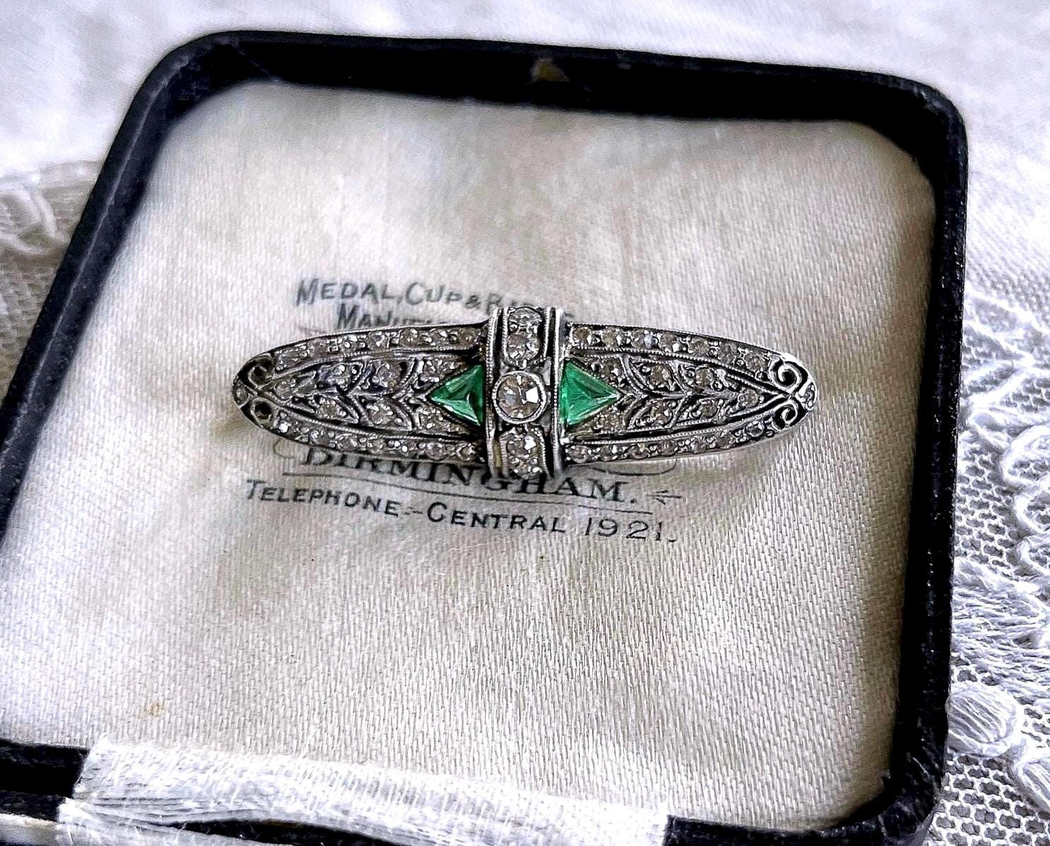 Featuring a lovely vintage 1930s Art Deco sterling silver lapel brooch adorned with dazzling faceted emerald green and white paste stones set in closed back sterling settings. This beautiful piece is in excellent vintage condition, with all stones intact and accounted for, a functional clasp, hallmarked on the reverse. Measuring approximately 1.75 inches at 6 grams respectively this is lovely vintage piece, ready to wear and pass down for generations!