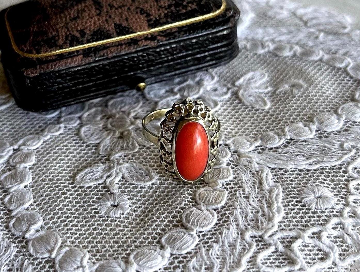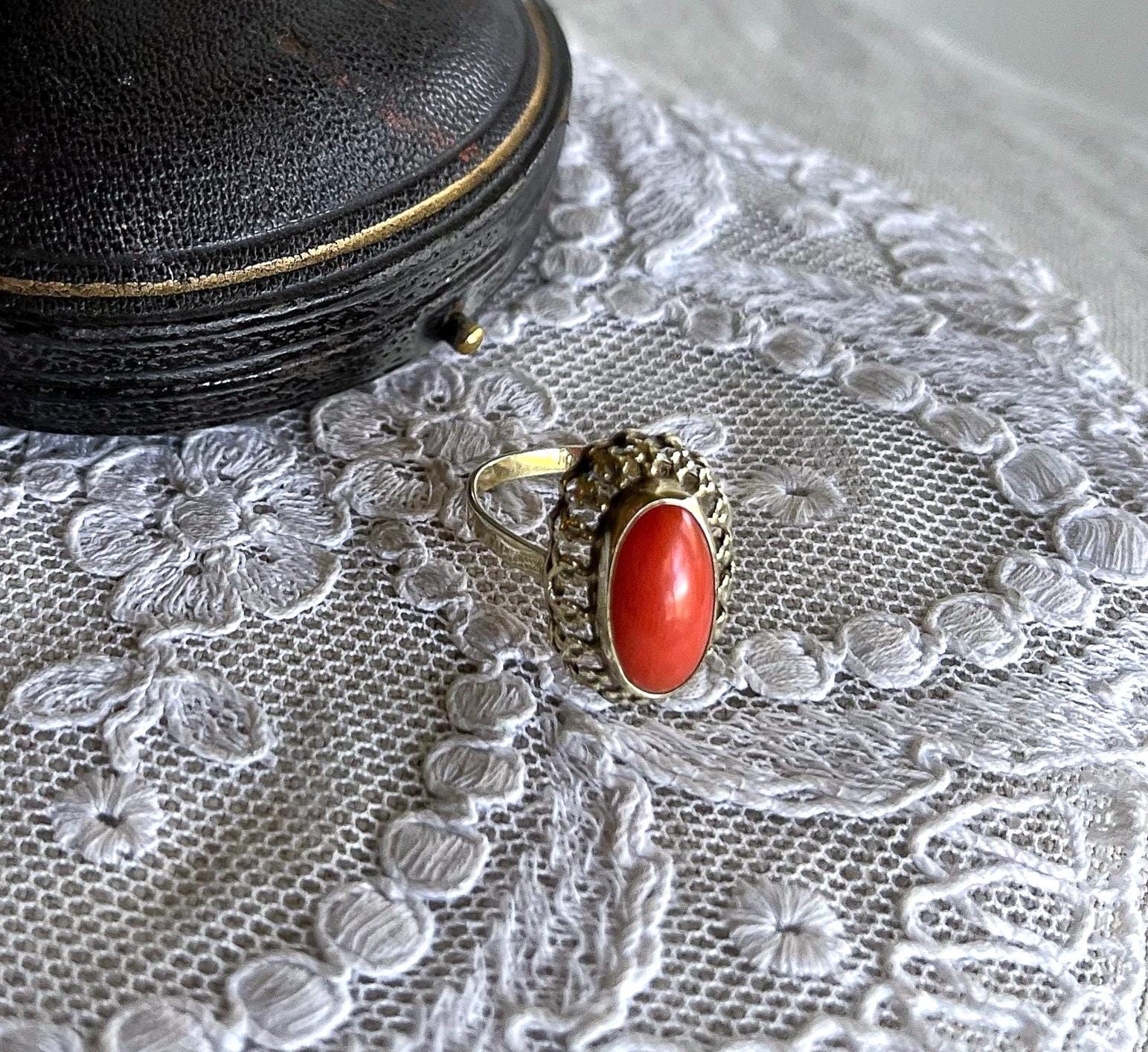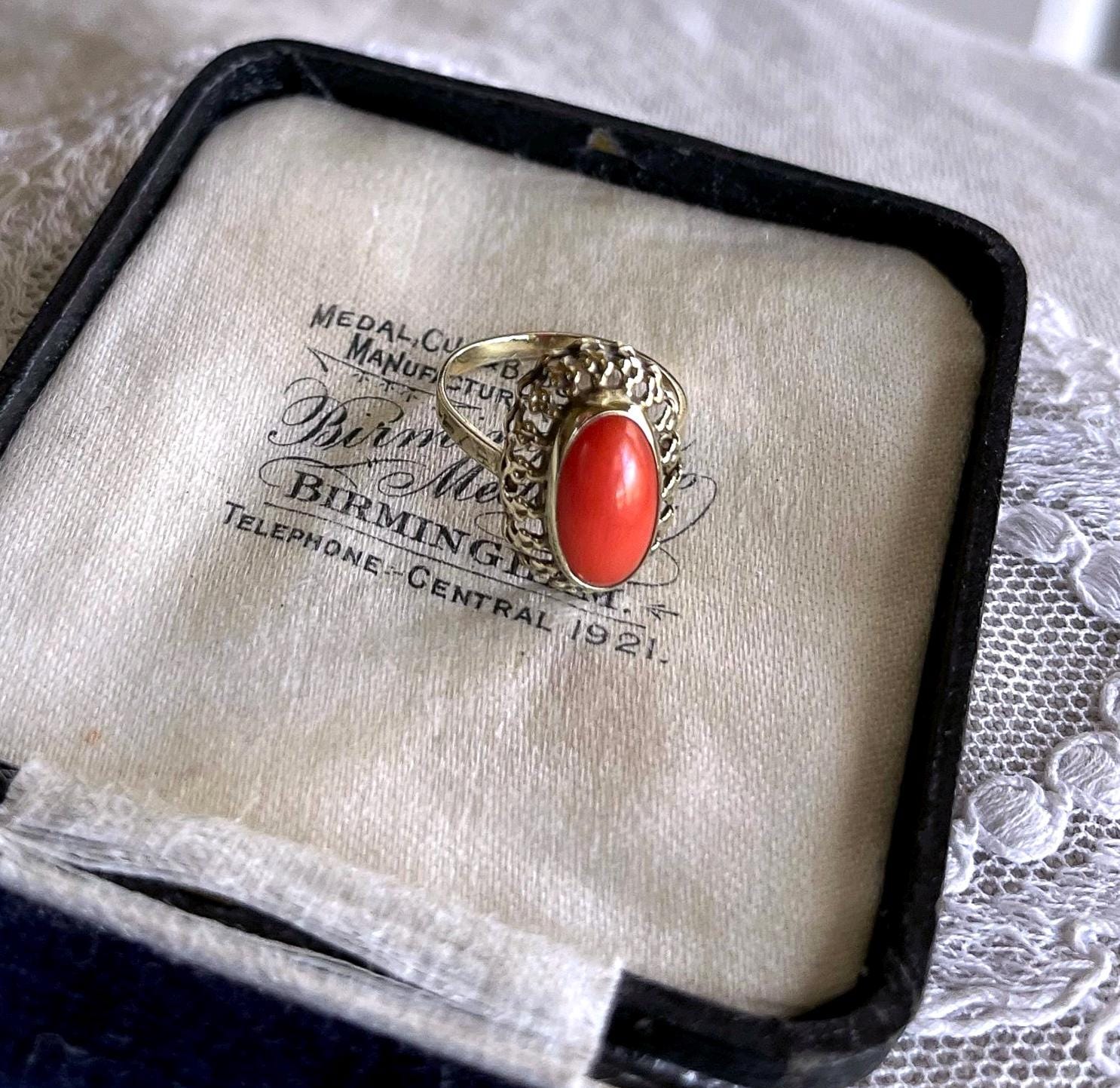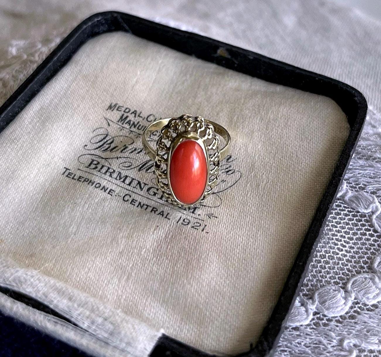 Featuring a wonderful antique 8K 333 gold Cocktail ring adorned with beautiful natural Coral cabochon set in a beautiful gold setting. Ring is in beautiful condition with normal wear, stamped 333 with a makers mark on the inside of band with stone intact and accounted for. Approximately size 5.5 at 1.9 grams respectively this is a collectible wearable Heirloom piece, beautifully designed!