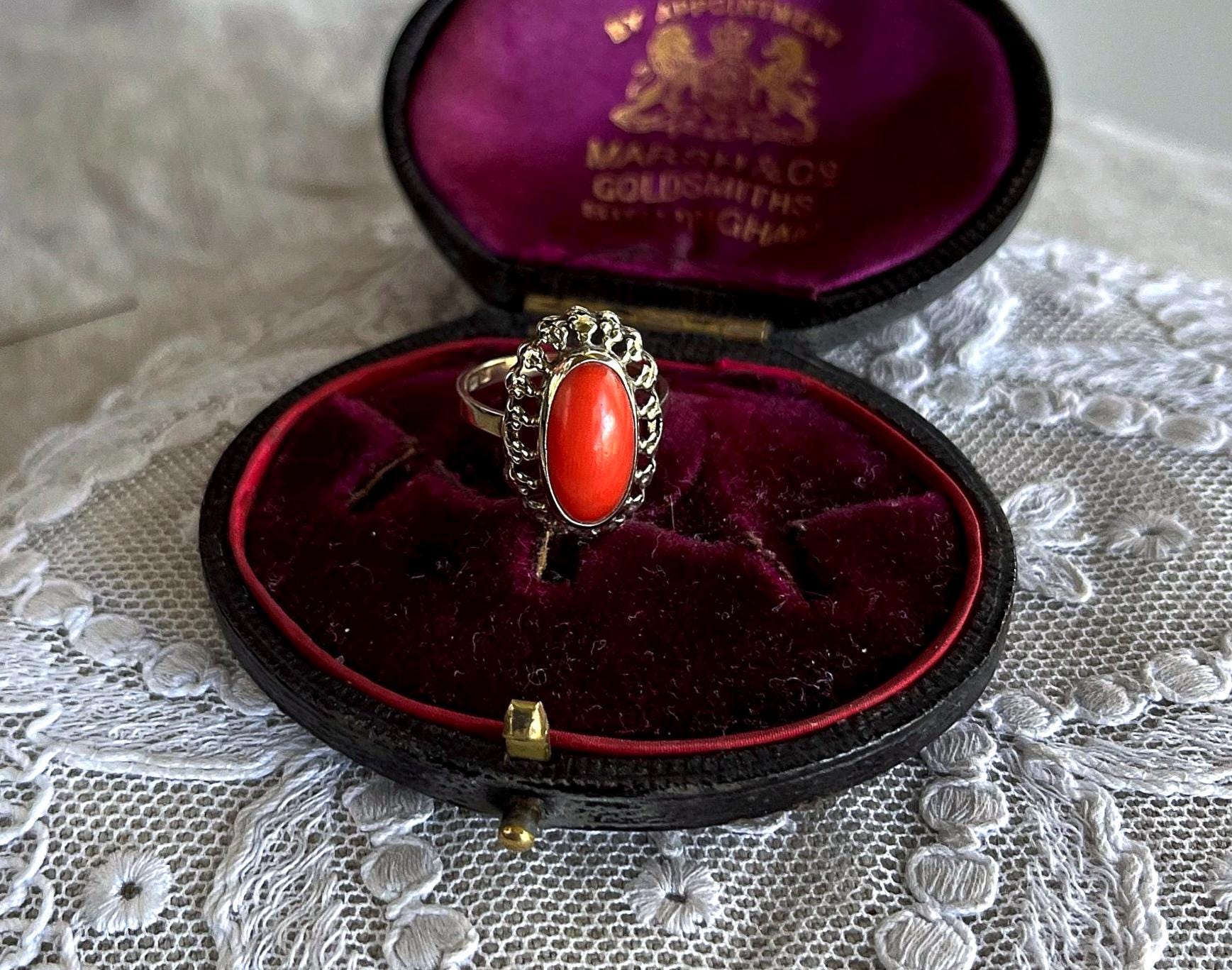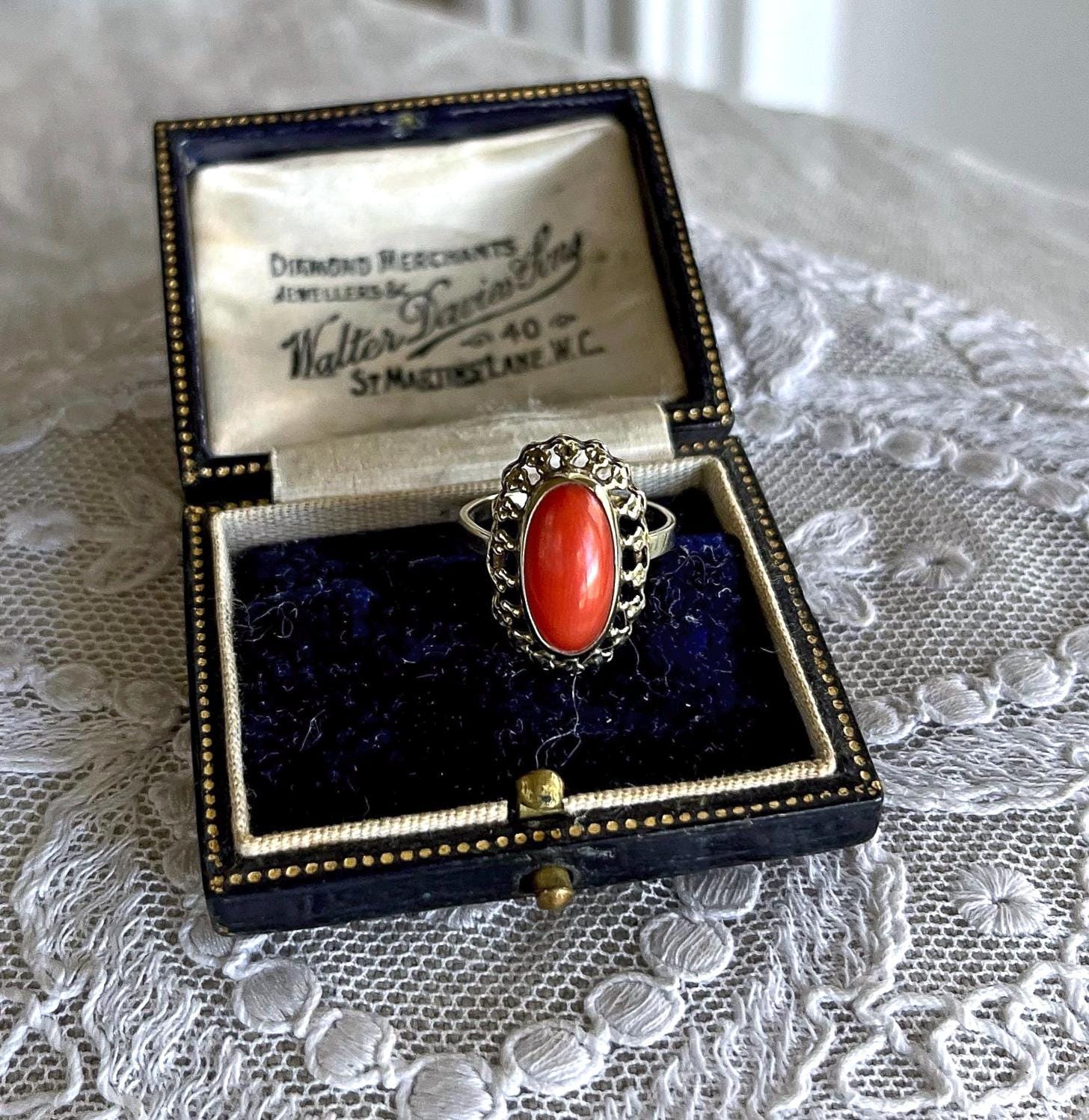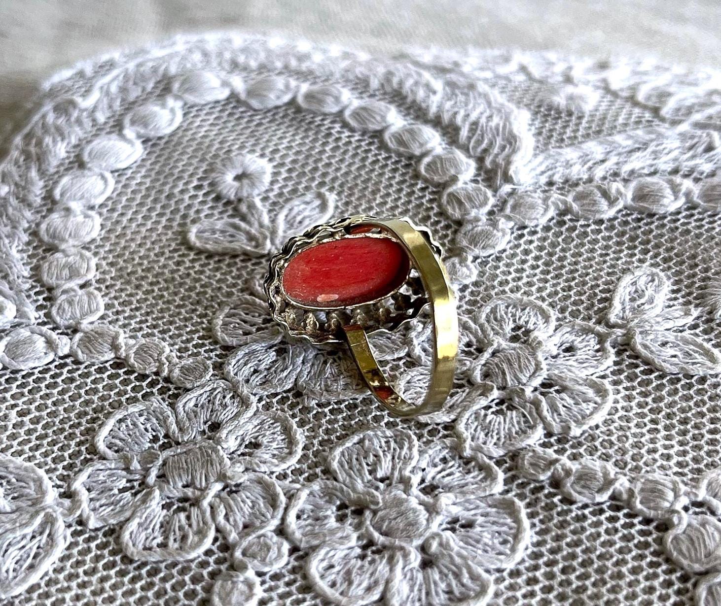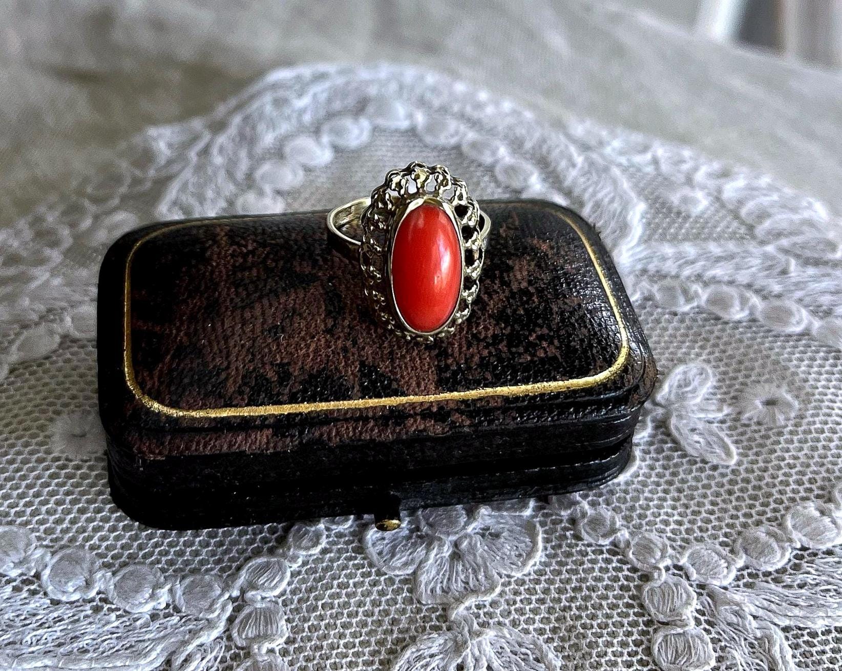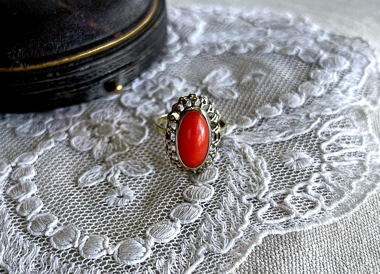 Featuring a wonderful antique 8K 333 gold Cocktail ring adorned with beautiful natural Coral cabochon set in a beautiful gold setting. Ring is in beautiful condition with normal wear, stamped 333 with a makers mark on the inside of band with stone intact and accounted for. Approximately size 5.5 at 1.9 grams respectively this is a collectible wearable Heirloom piece, beautifully designed!