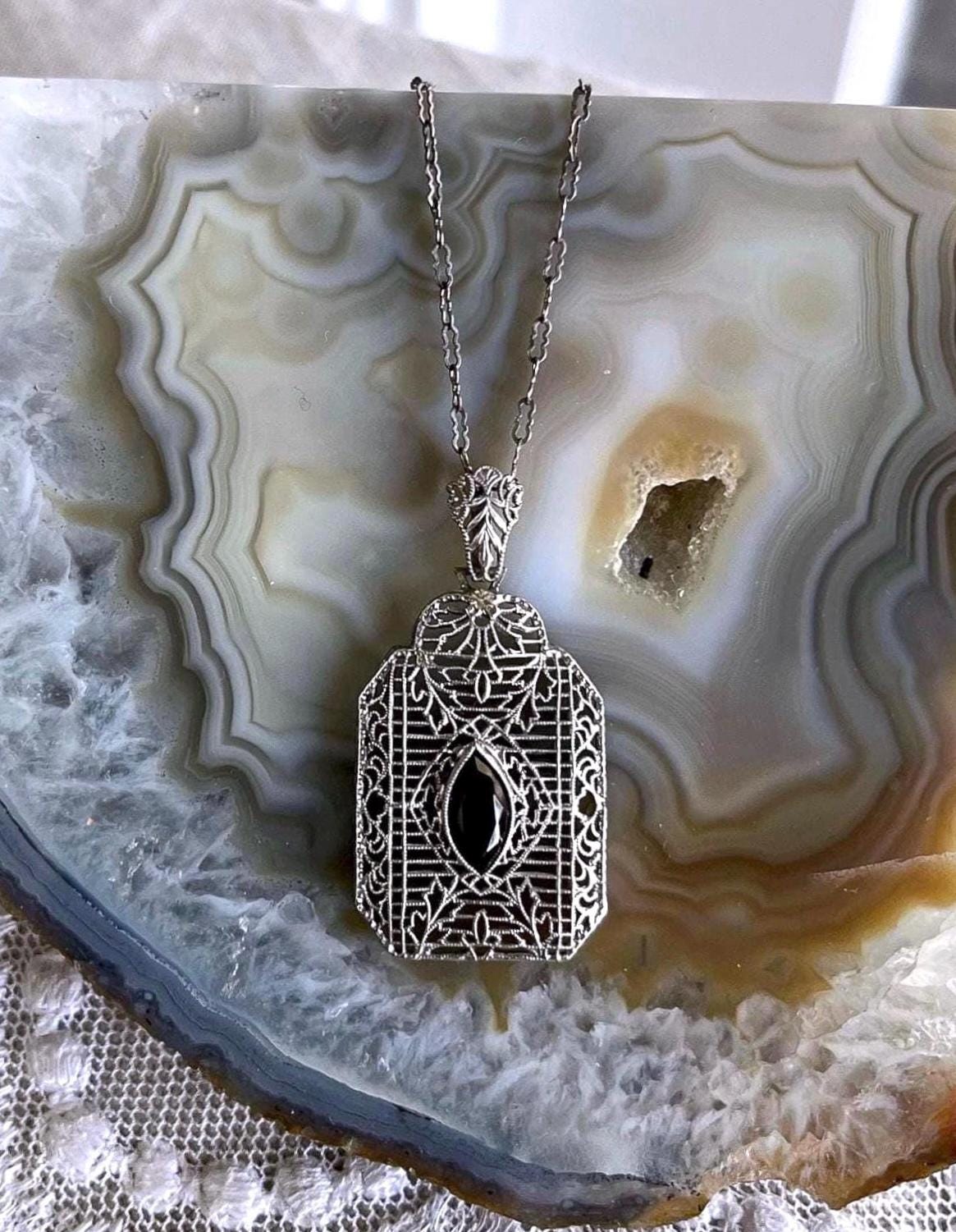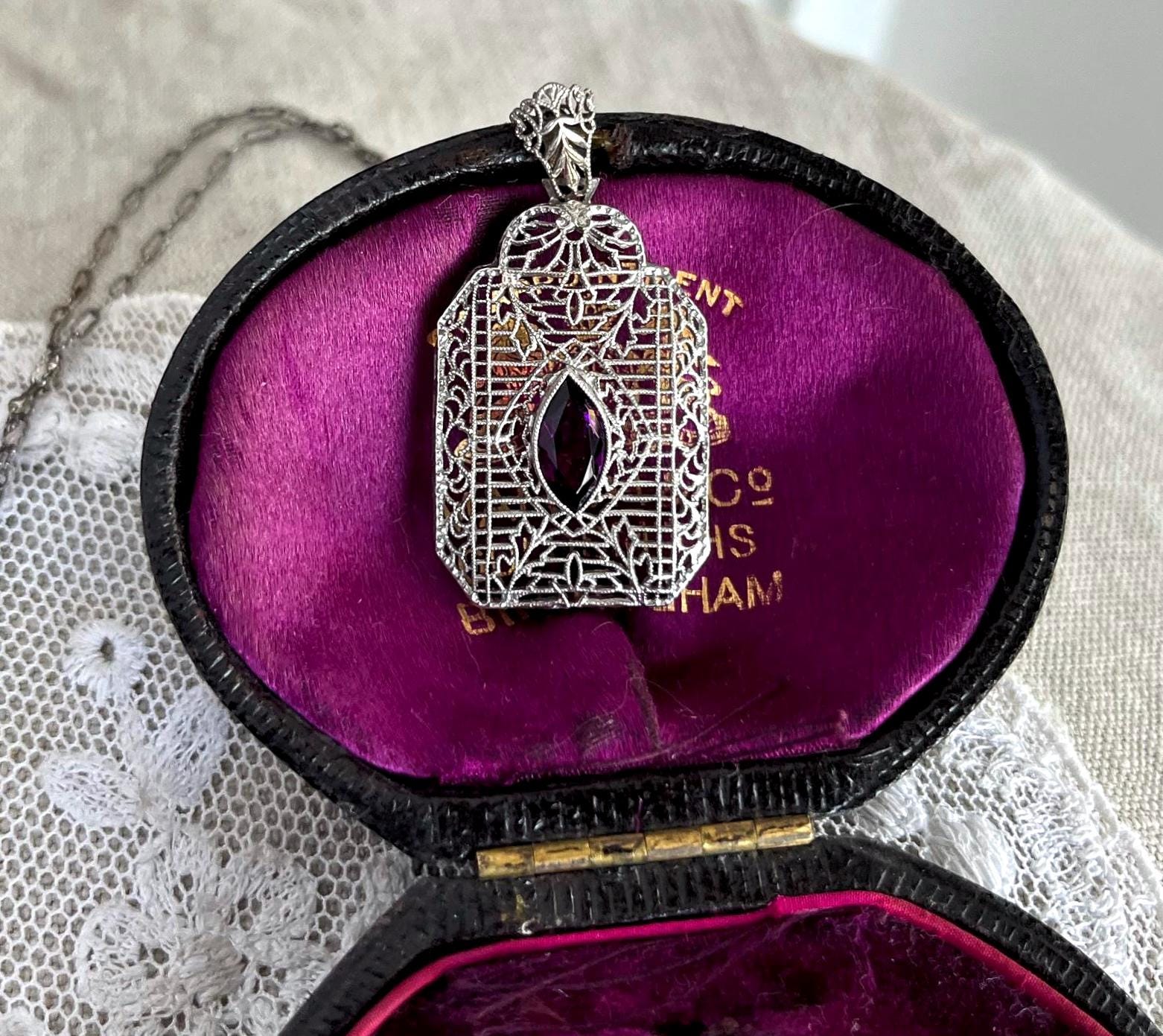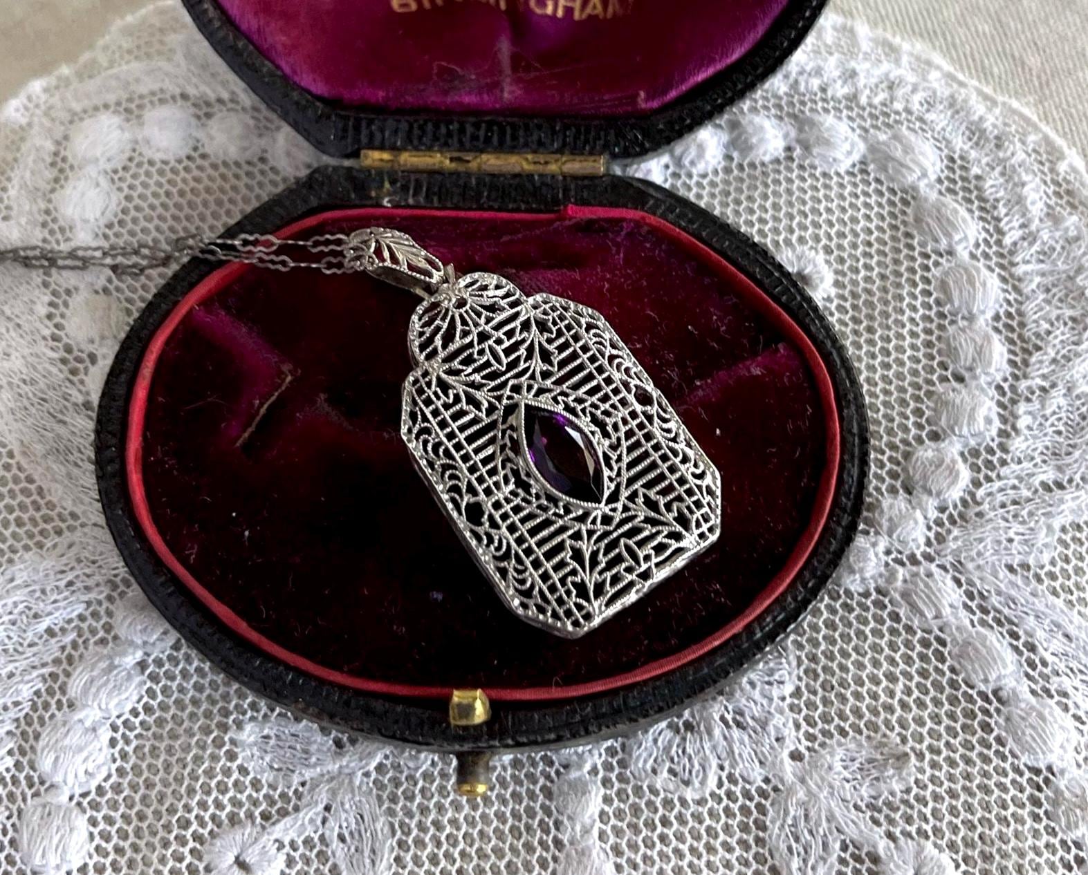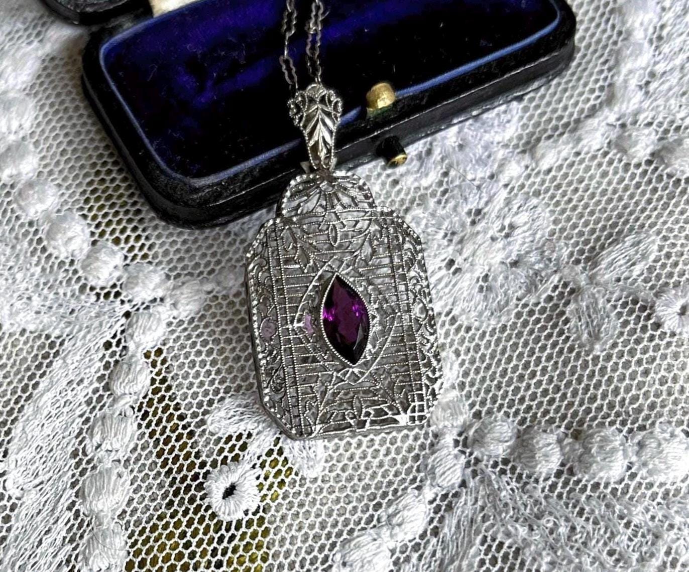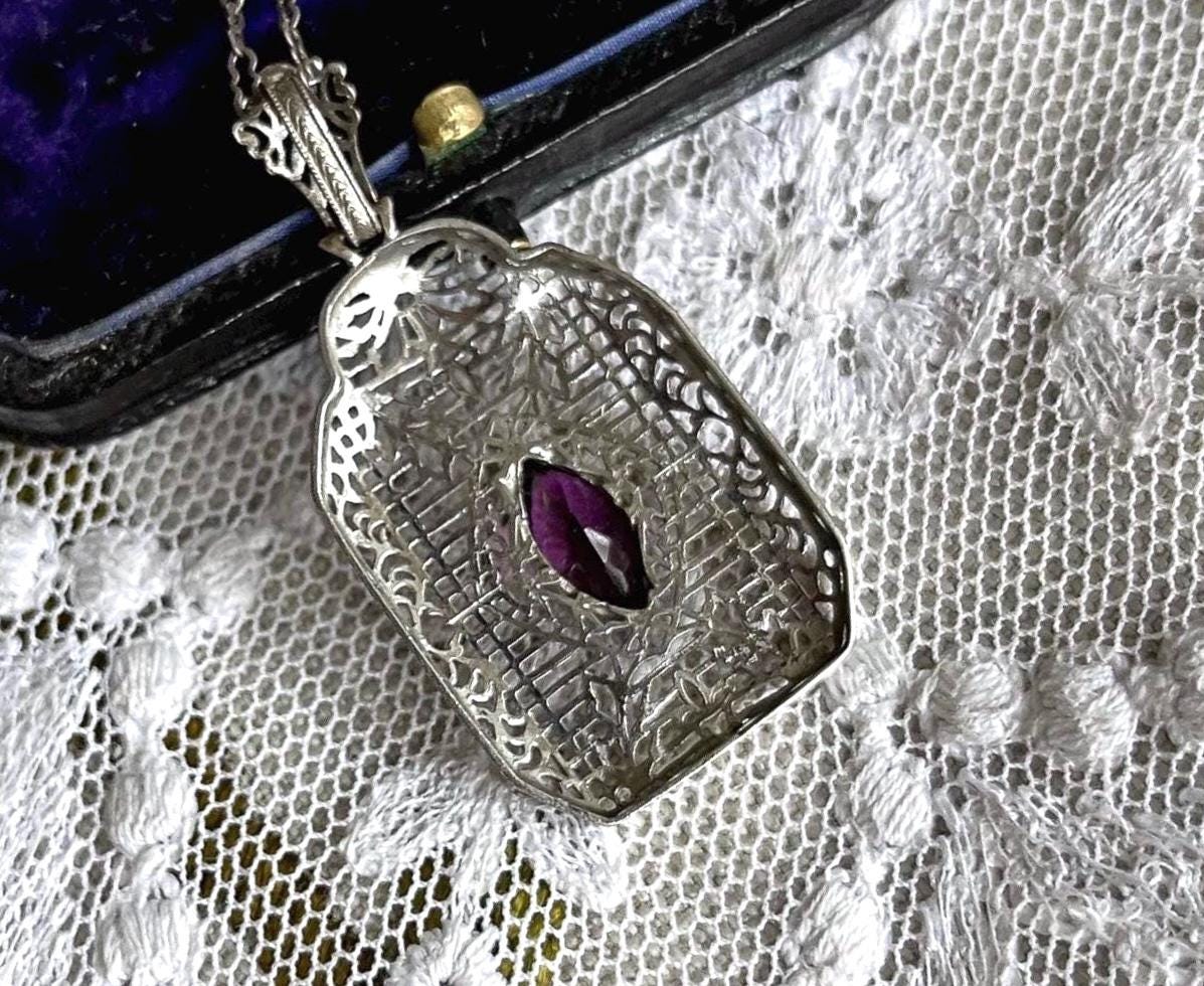 Featuring a lovely antique Edwardian Era delicate sterling silver filigree pendant necklace with a decorative sterling silver filigree pendant accented with a luminous amethyst purple faceted Paste stone. Necklace is in excellent antique condition with functional hallmarked STER fold clasp, minimal wear with stone bright and intact. Necklace measures approximately 17 inches around with a 1.50 inch pendant drop at 3.8 grams respectively. Beautifully designed and handcrafted, paste stone still has rich color, collectible and wearable!