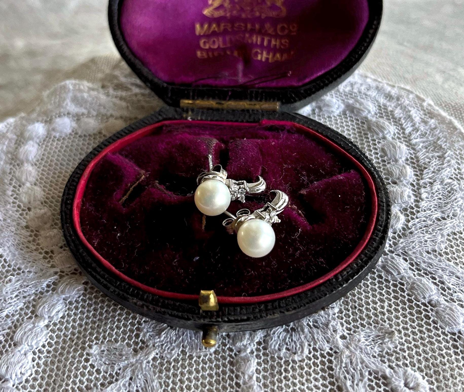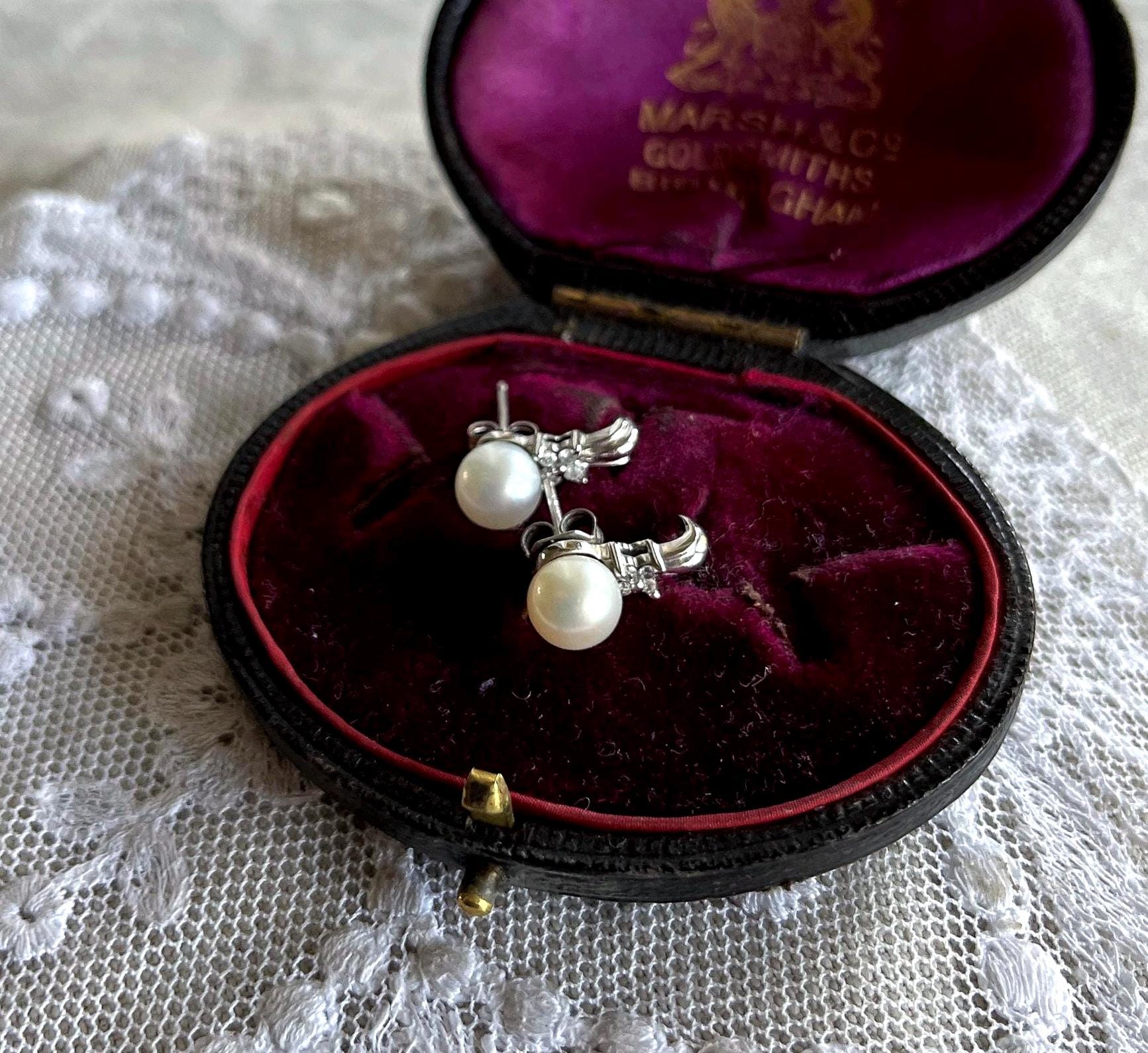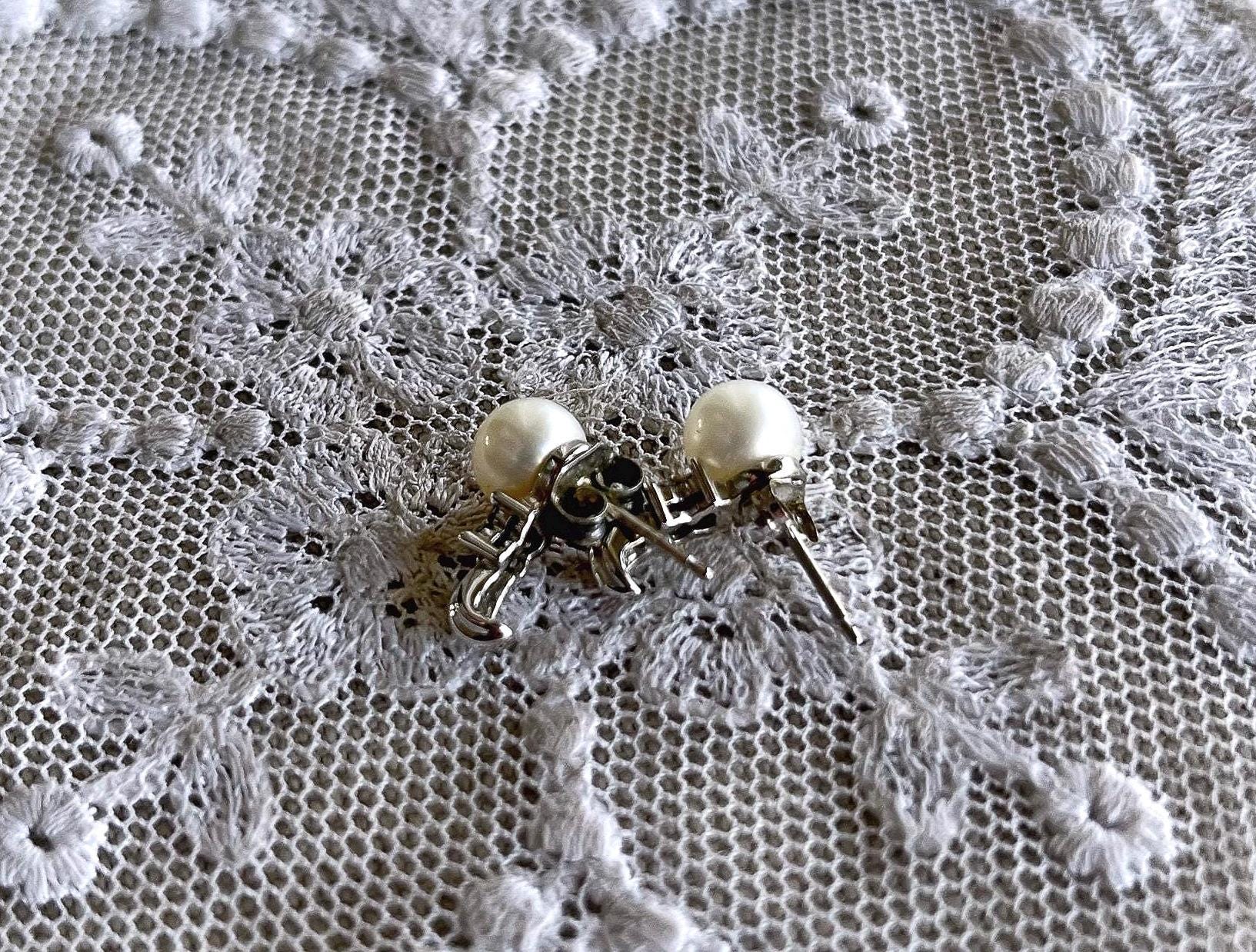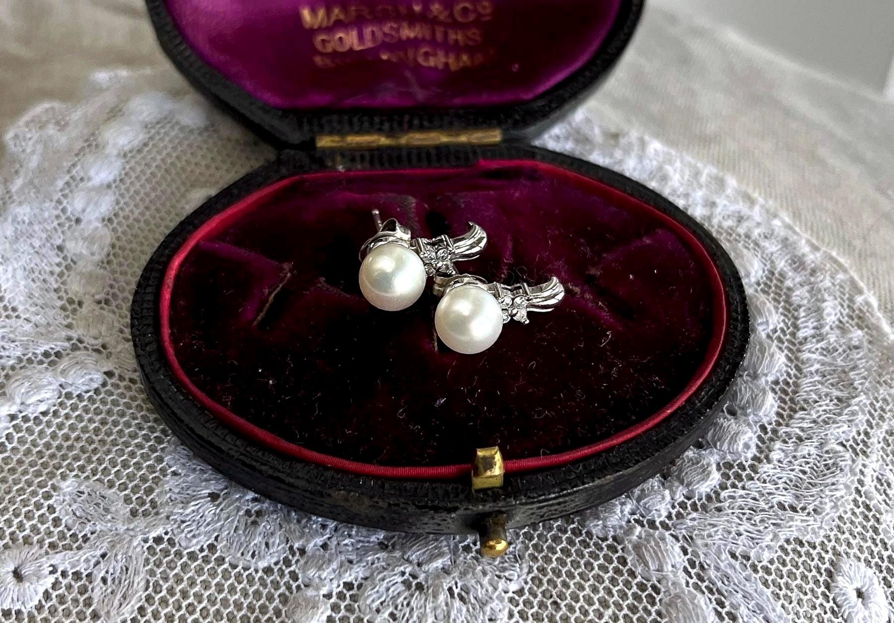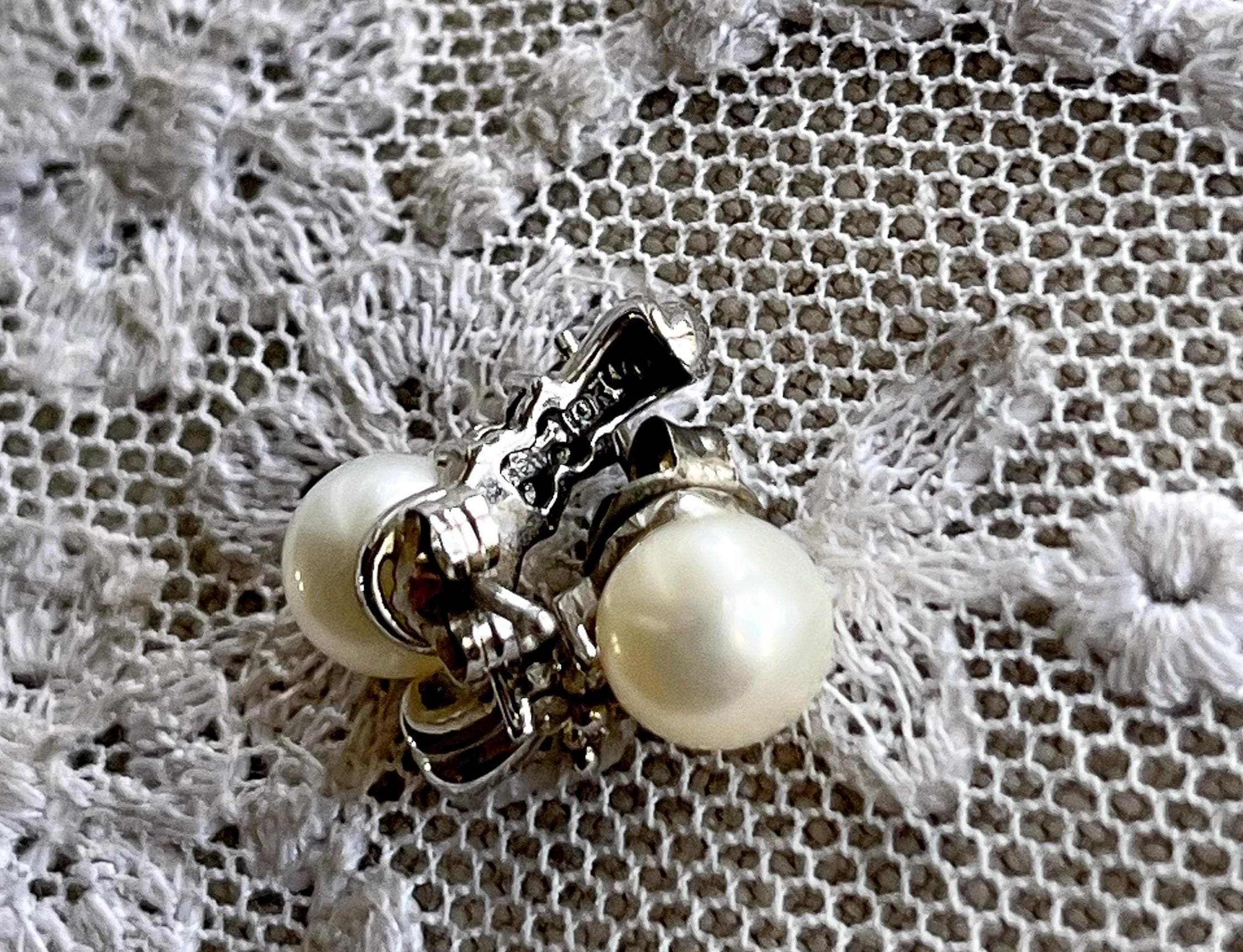 Featuring a fine pair of vintage genuine Cultured Pearl 10K white gold earrings adorned with genuine pearls measuring approximately 6.6mm accented with brilliant faceted genuine diamonds. Earrings measure approximately .5 inches at 2.21 grams with both original backings present. Earrings are in beautiful condition, stamped 10K on the reverse, with Pearls and stones intact and accounted for. Charming and classic these are ready to wear!