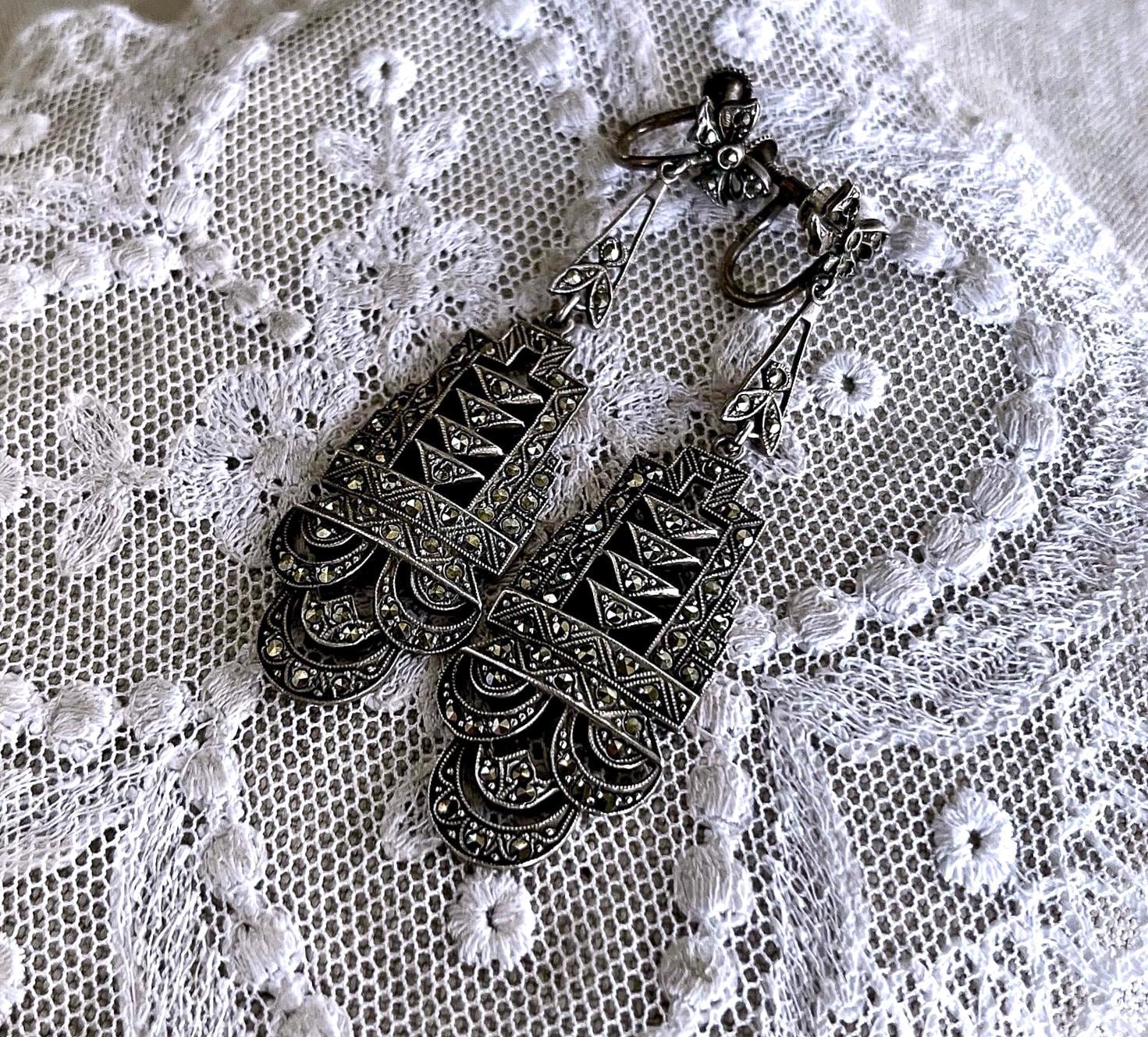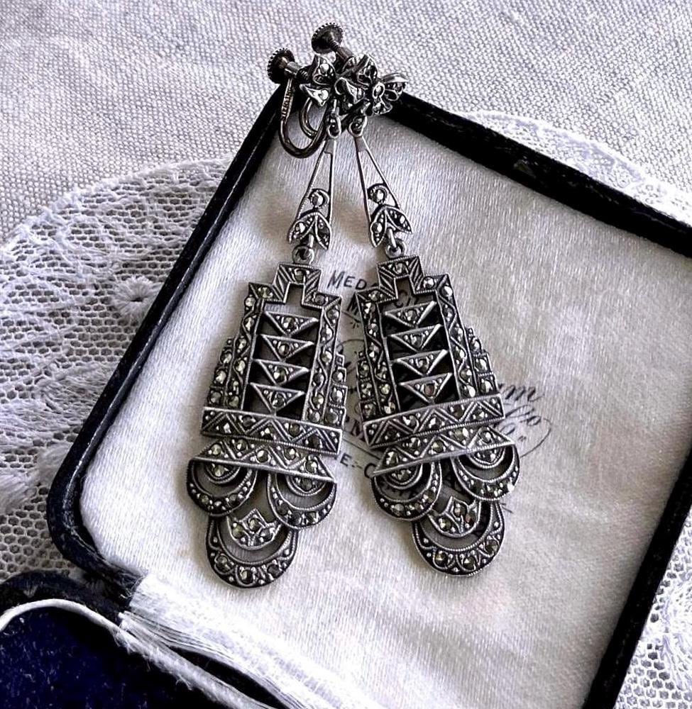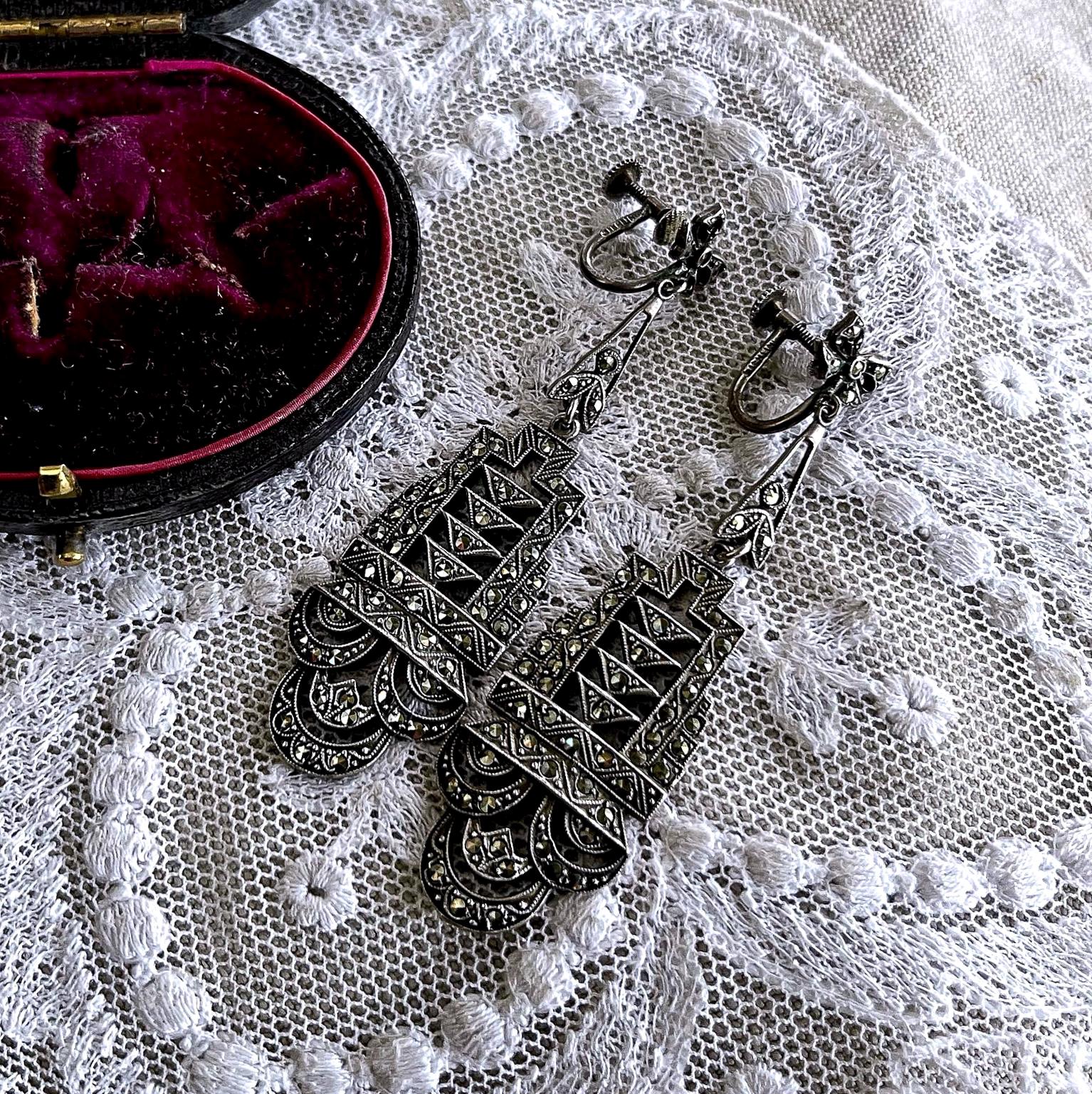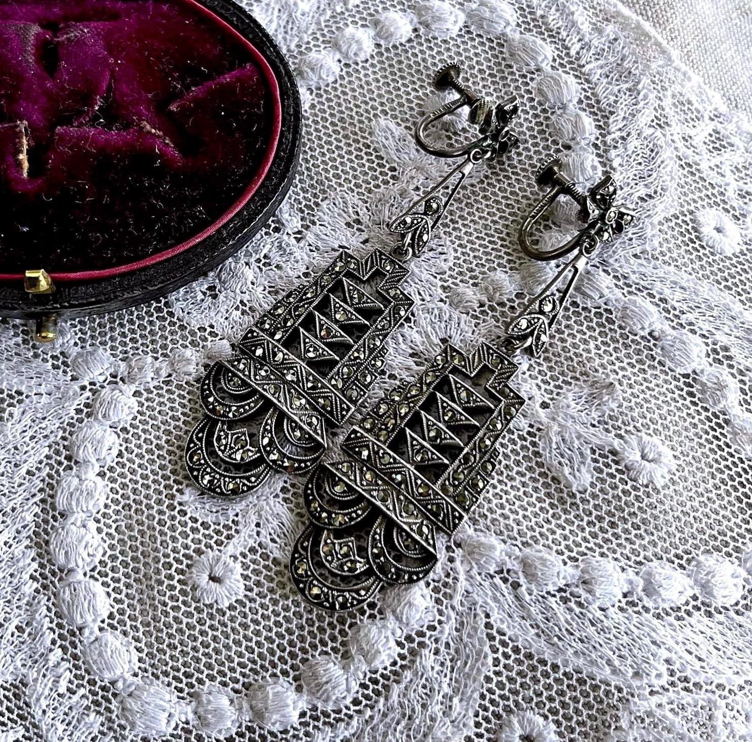 Featuring a gorgeous pair of antique Edwardian Era hallmarked sterling silver screw back drop earrings adorned with brilliant faceted marcasite crystals set in an ornate design. Earrings measure approximately 2.5 inches long at 16.13 grams respectively with both pieces in excellent antique condition with functional clasps, a beautiful patina with all stones intact and accounted for. Highly desirable these heirloom earrings will delight for generations to come!