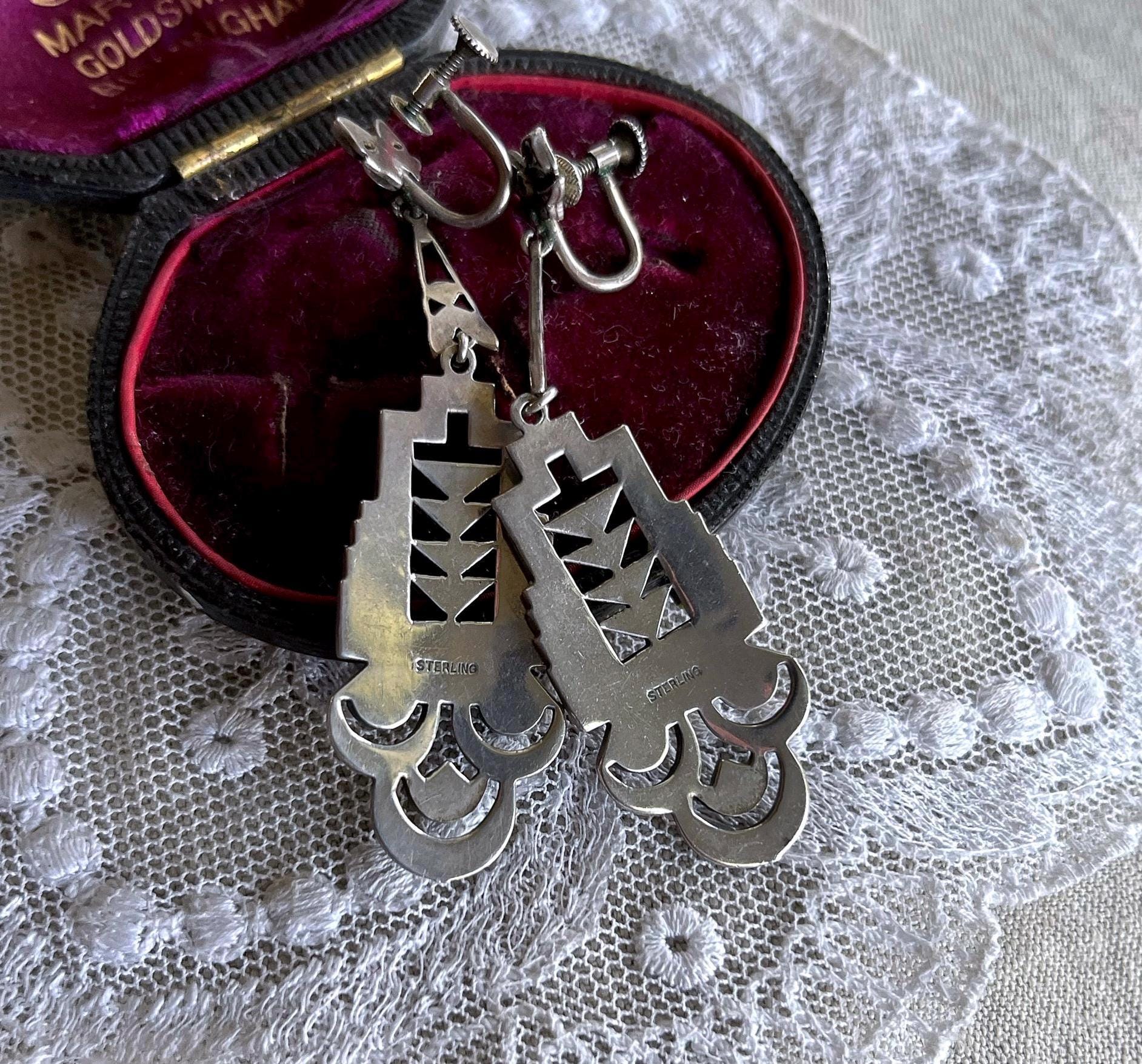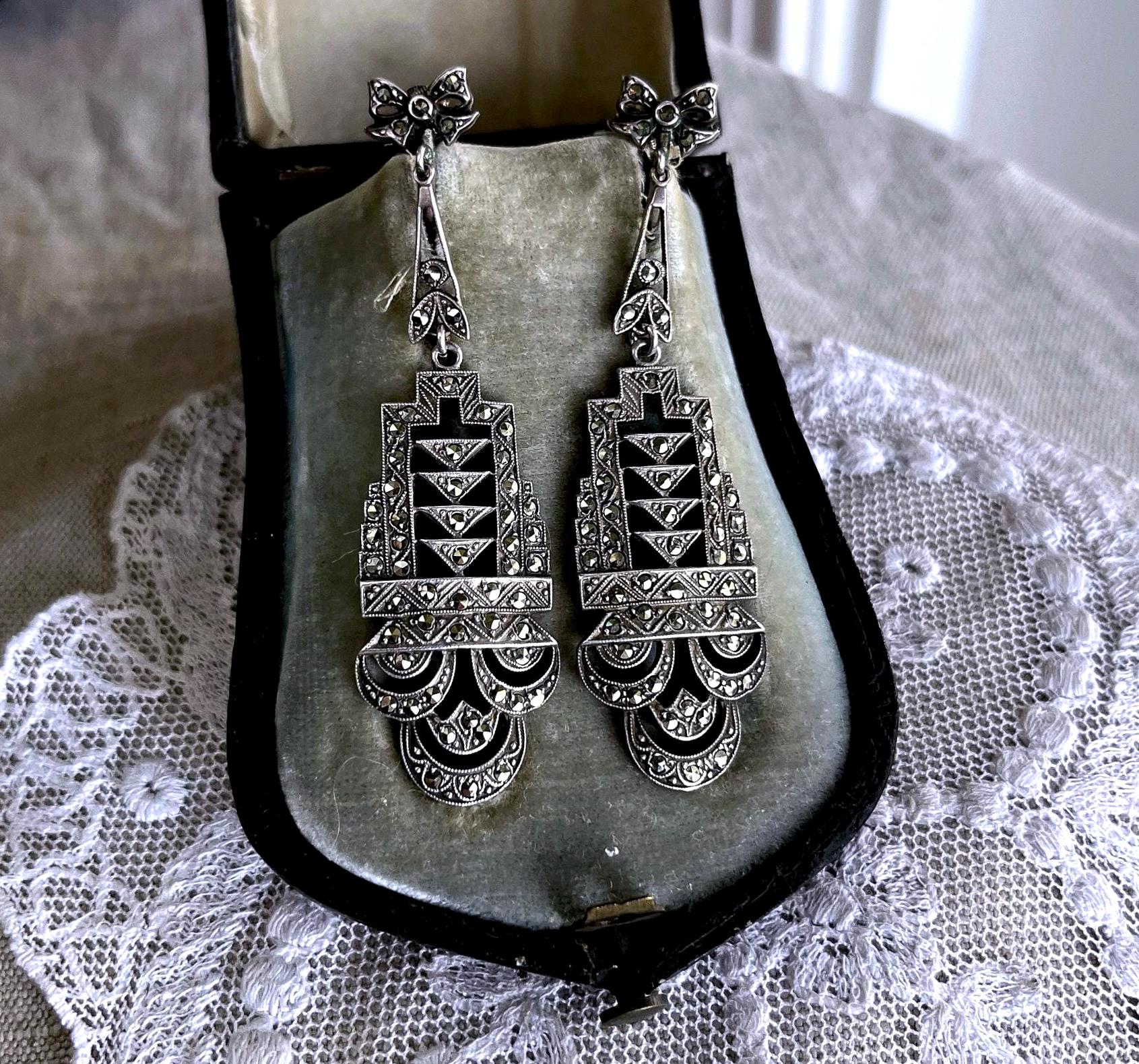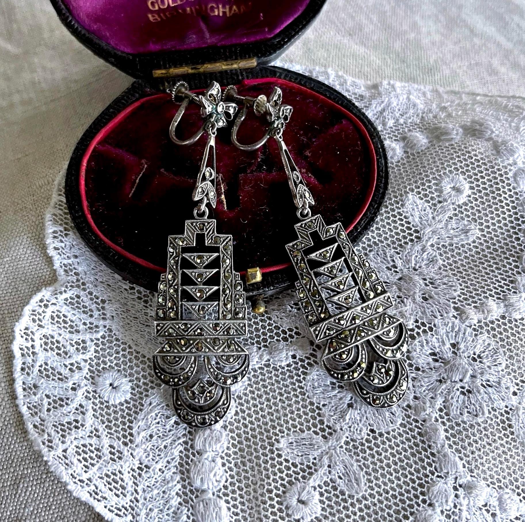 Featuring a gorgeous pair of antique Edwardian Era hallmarked sterling silver screw back drop earrings adorned with brilliant faceted marcasite crystals set in an ornate design. Earrings measure approximately 2.5 inches long at 16.13 grams respectively with both pieces in excellent antique condition with functional clasps, a beautiful patina with all stones intact and accounted for. Highly desirable these heirloom earrings will delight for generations to come!