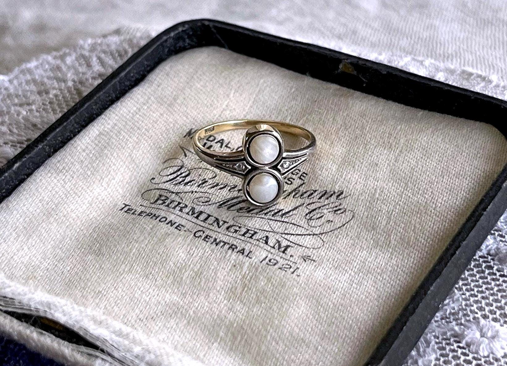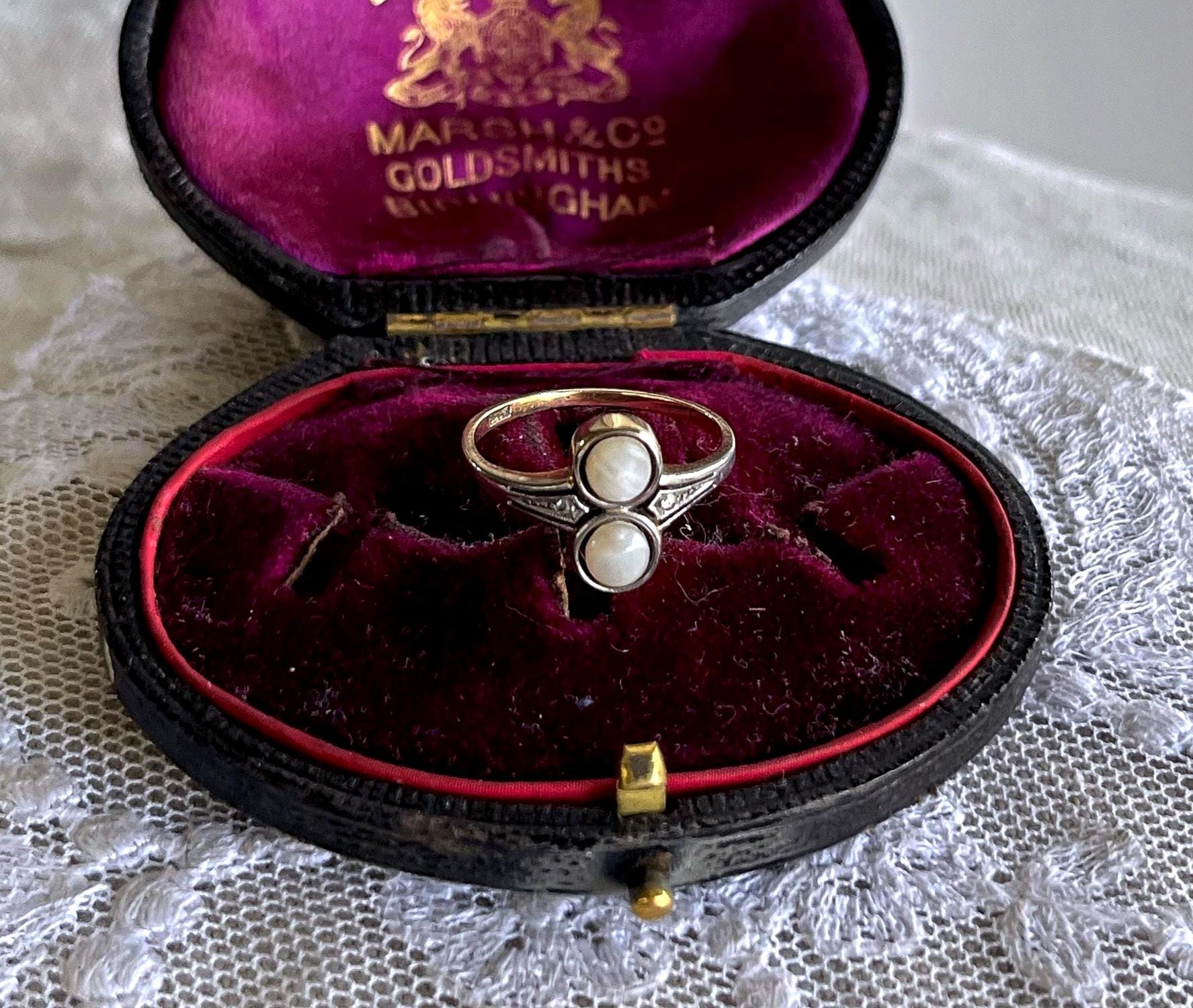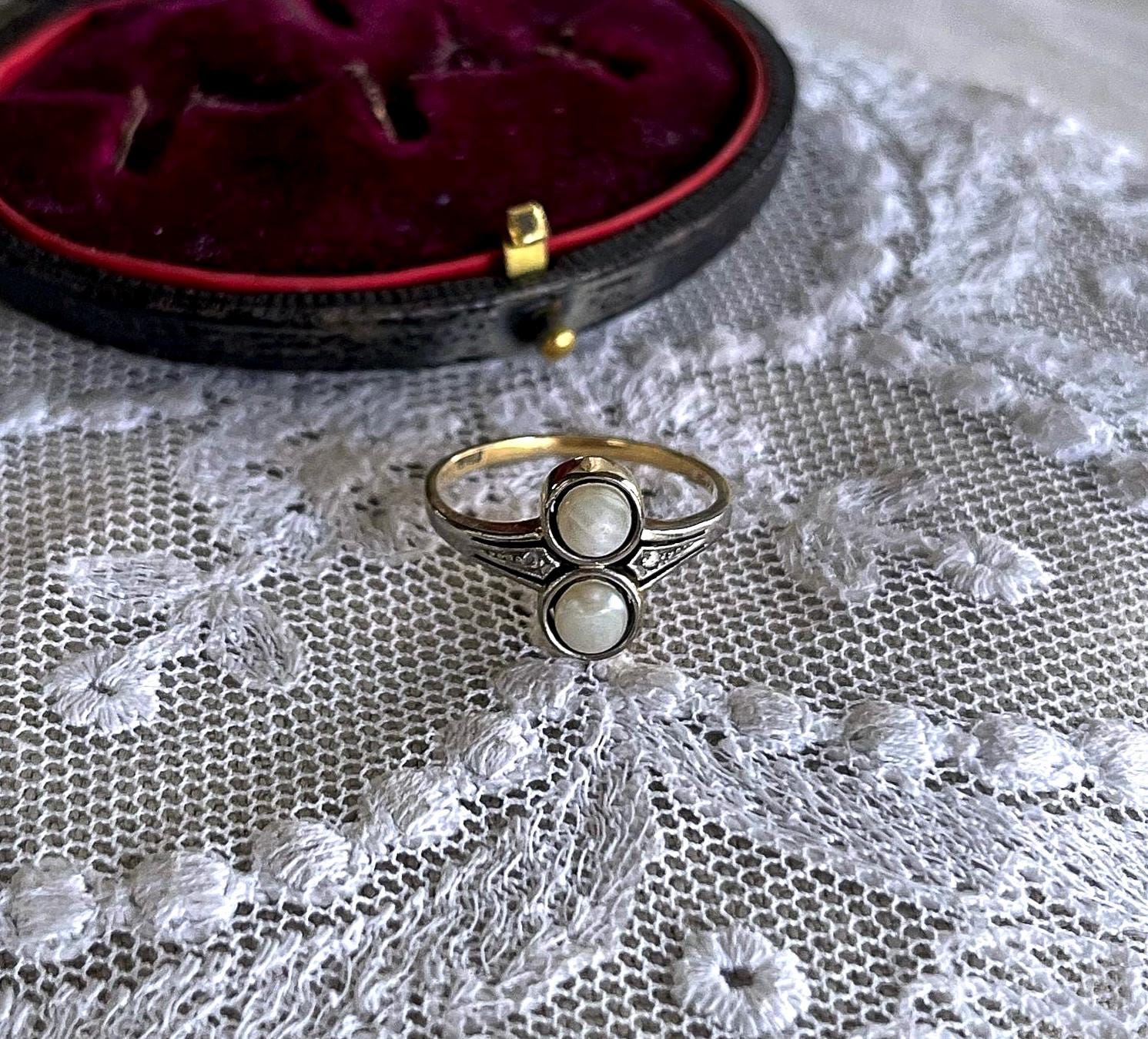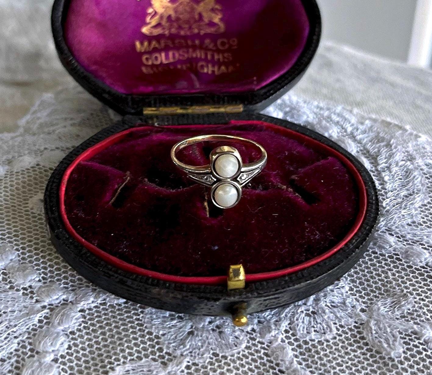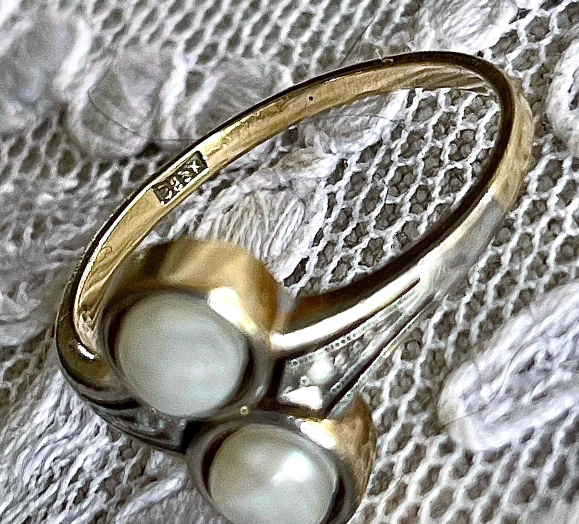 Featuring a sophisticated antique Edwardian Belle Époque delicate 14K yellow and white gold decorative filigree dinner ring adorned with two luminous natural pearls set in white gold settings accented with genuine Diamonds. Ring is approximately size 6 at 2.59 grams respectively and is hallmarked 585 on the inside of band. This fine dinner ring is in excellent antique condition with all stones intact. This timeless piece is beautifully crafted, ready to wear.