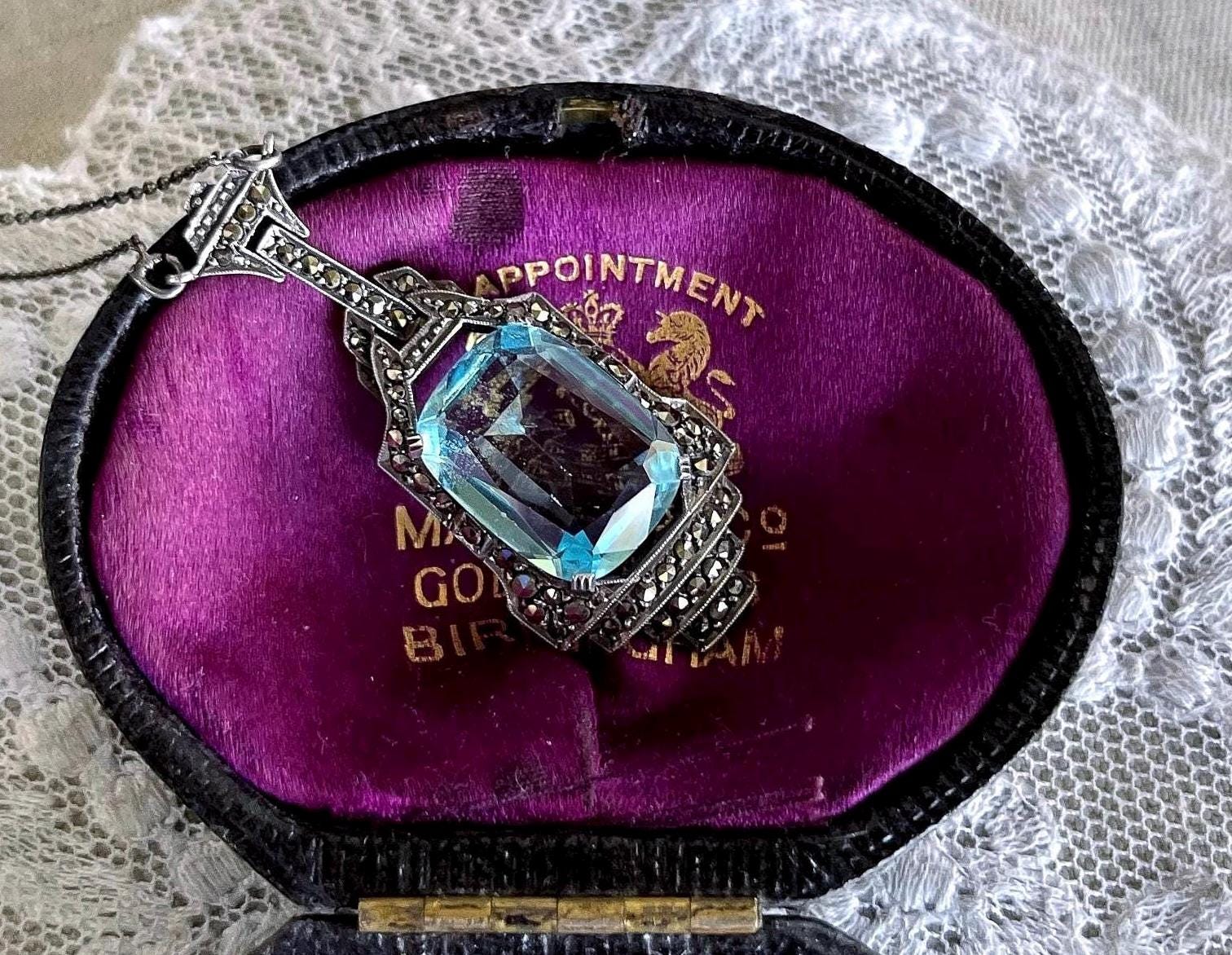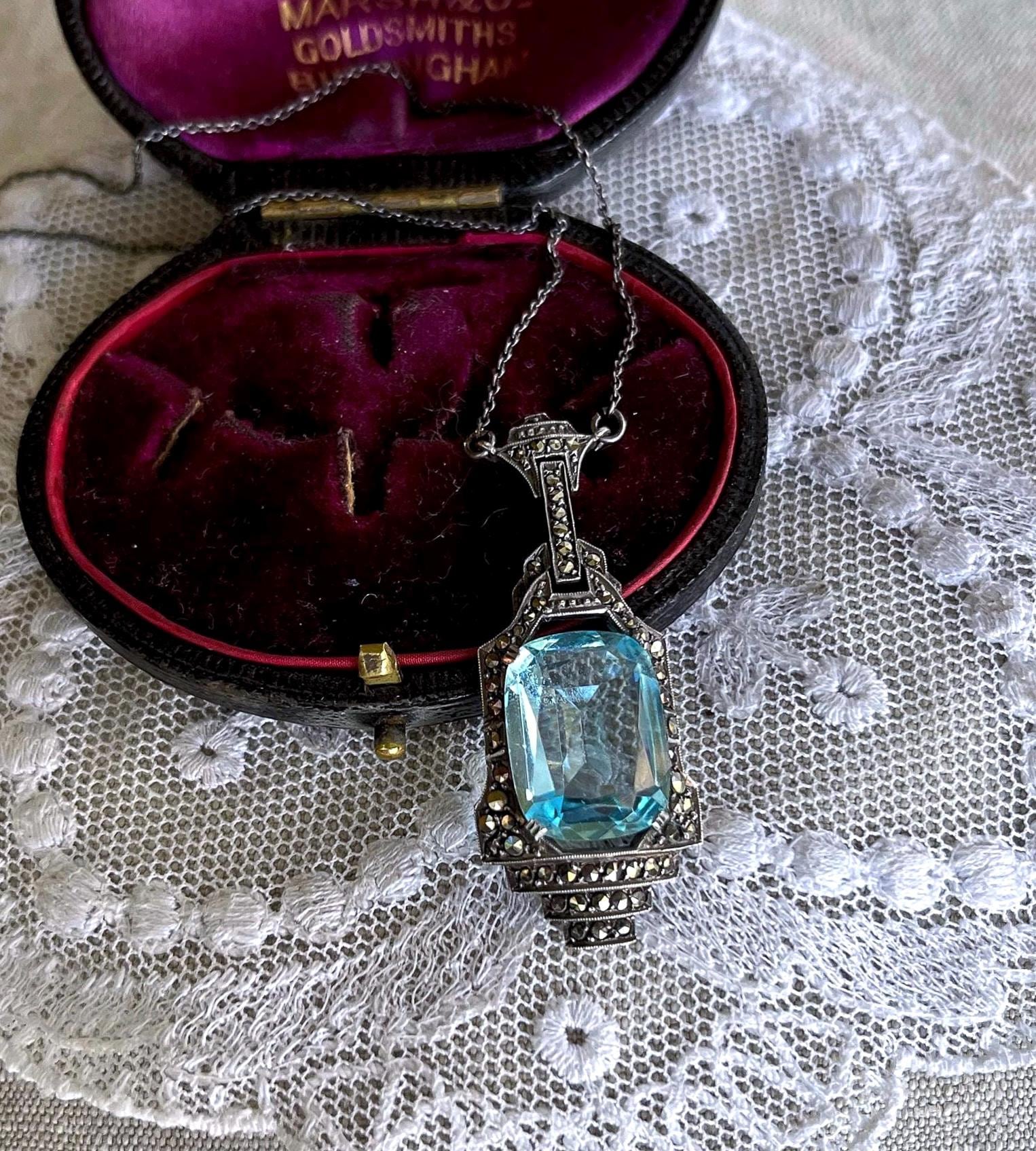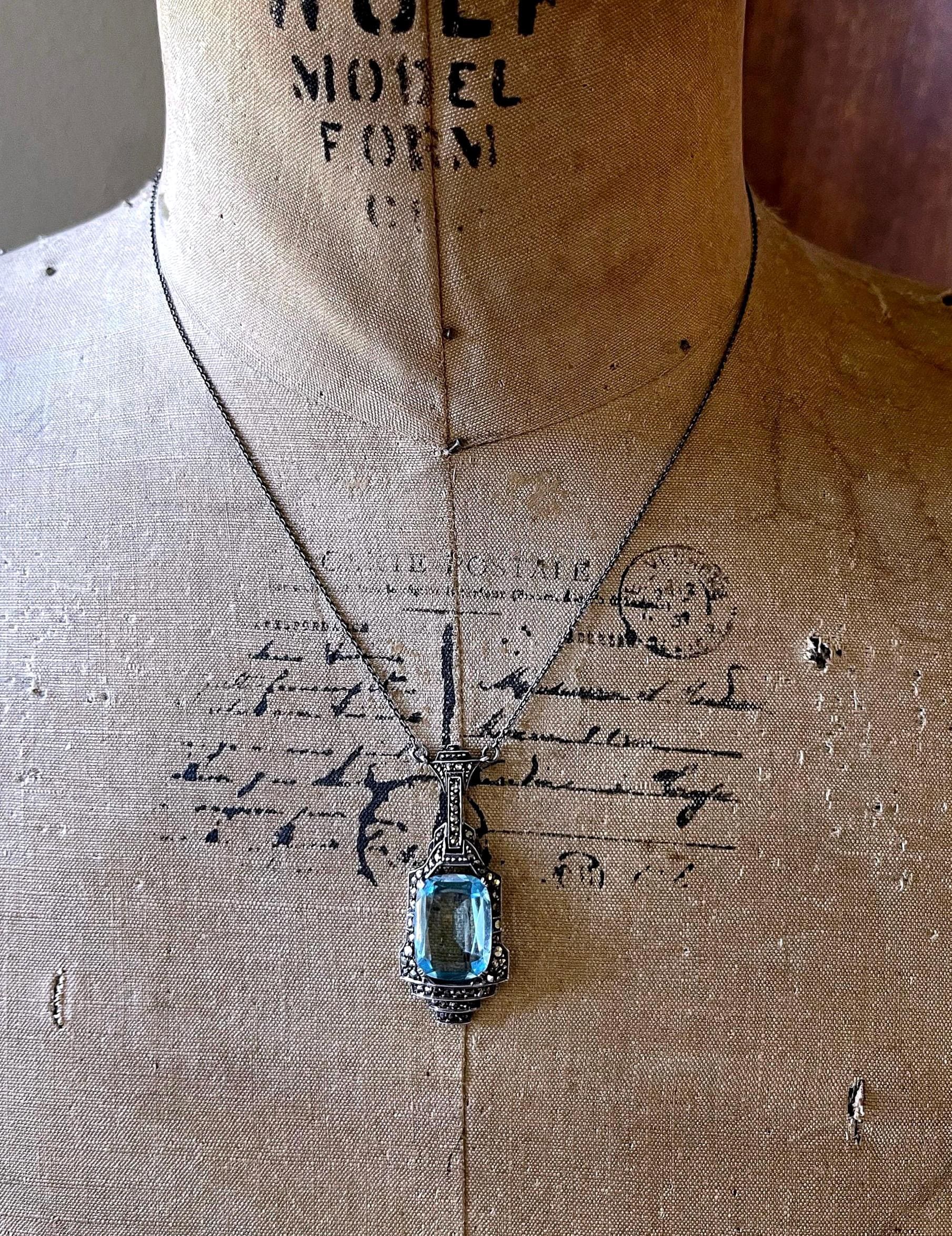 Featuring a beautiful Edwardian solid sterling silver pristine lavaliere necklace adorned with beautiful faceted open back Topaz blue paste stone accented with brilliant faceted marcasite crystals set in a decorative setting. Necklace measures approximately 17 inches around with a 1.5 inch pendant drop at 6.65 grams respectively. Necklace is in excellent vintage condition with a functional stamped STERLING antique thumbless clasp with all stones intact and accounted for. Beautifully made, this in an extraordinary piece, collectible and wearable!
