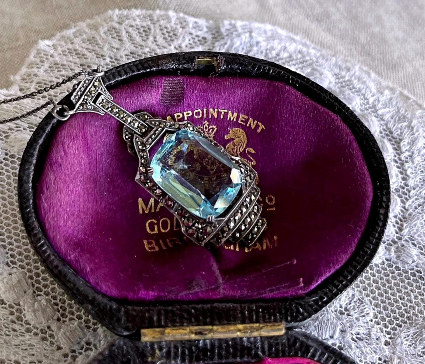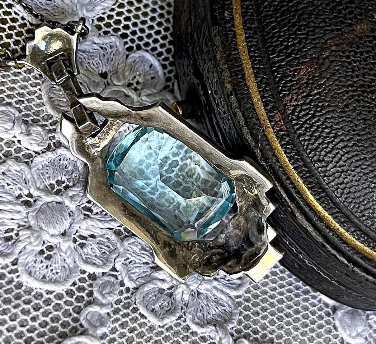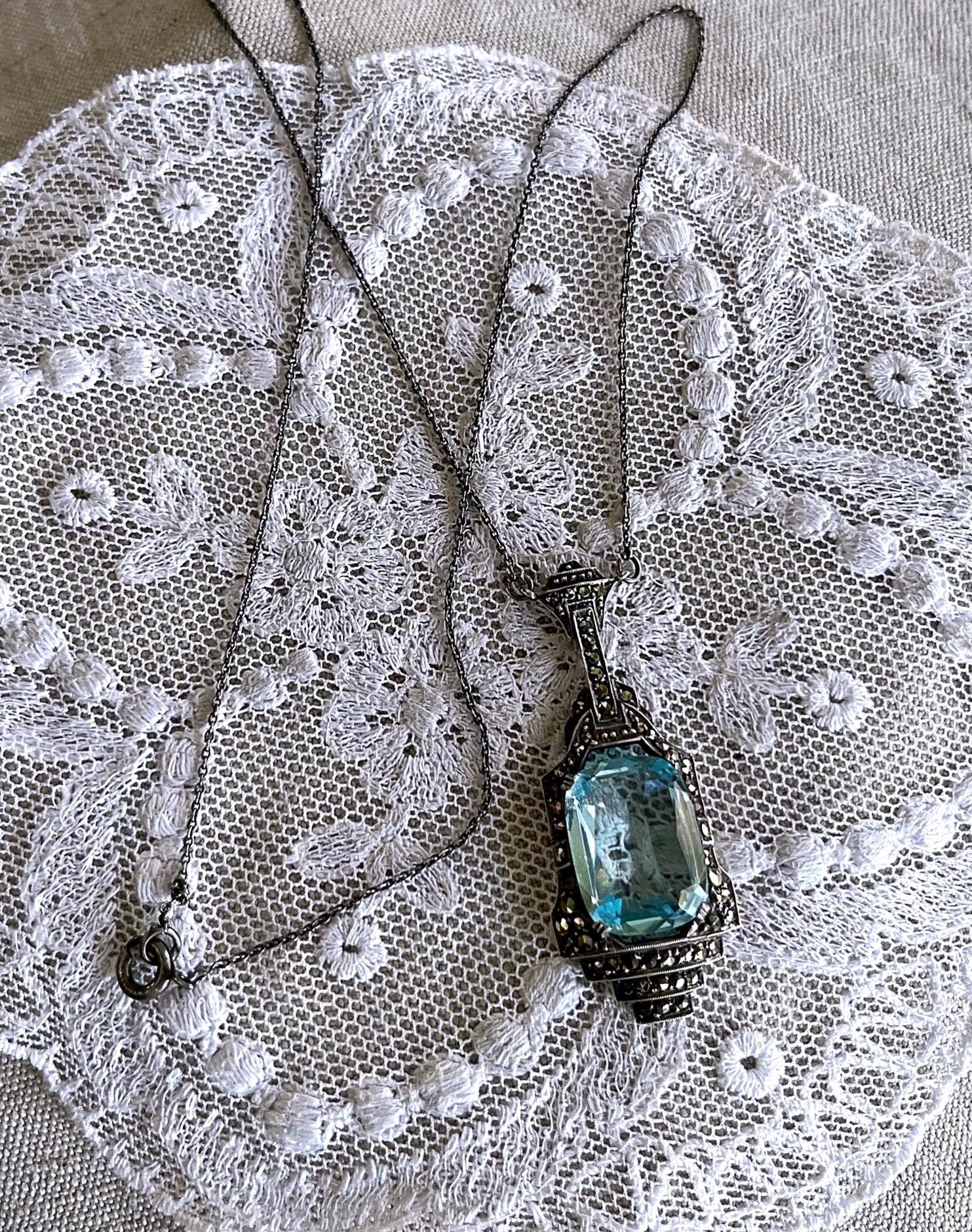 Featuring a beautiful Edwardian solid sterling silver pristine lavaliere necklace adorned with beautiful faceted open back Topaz blue paste stone accented with brilliant faceted marcasite crystals set in a decorative setting. Necklace measures approximately 17 inches around with a 1.5 inch pendant drop at 6.65 grams respectively. Necklace is in excellent vintage condition with a functional stamped STERLING antique thumbless clasp with all stones intact and accounted for. Beautifully made, this in an extraordinary piece, collectible and wearable!