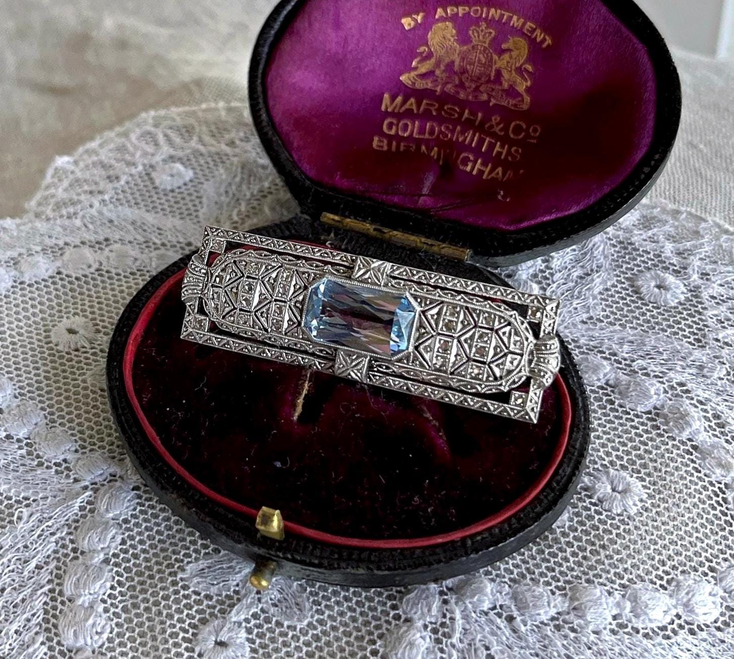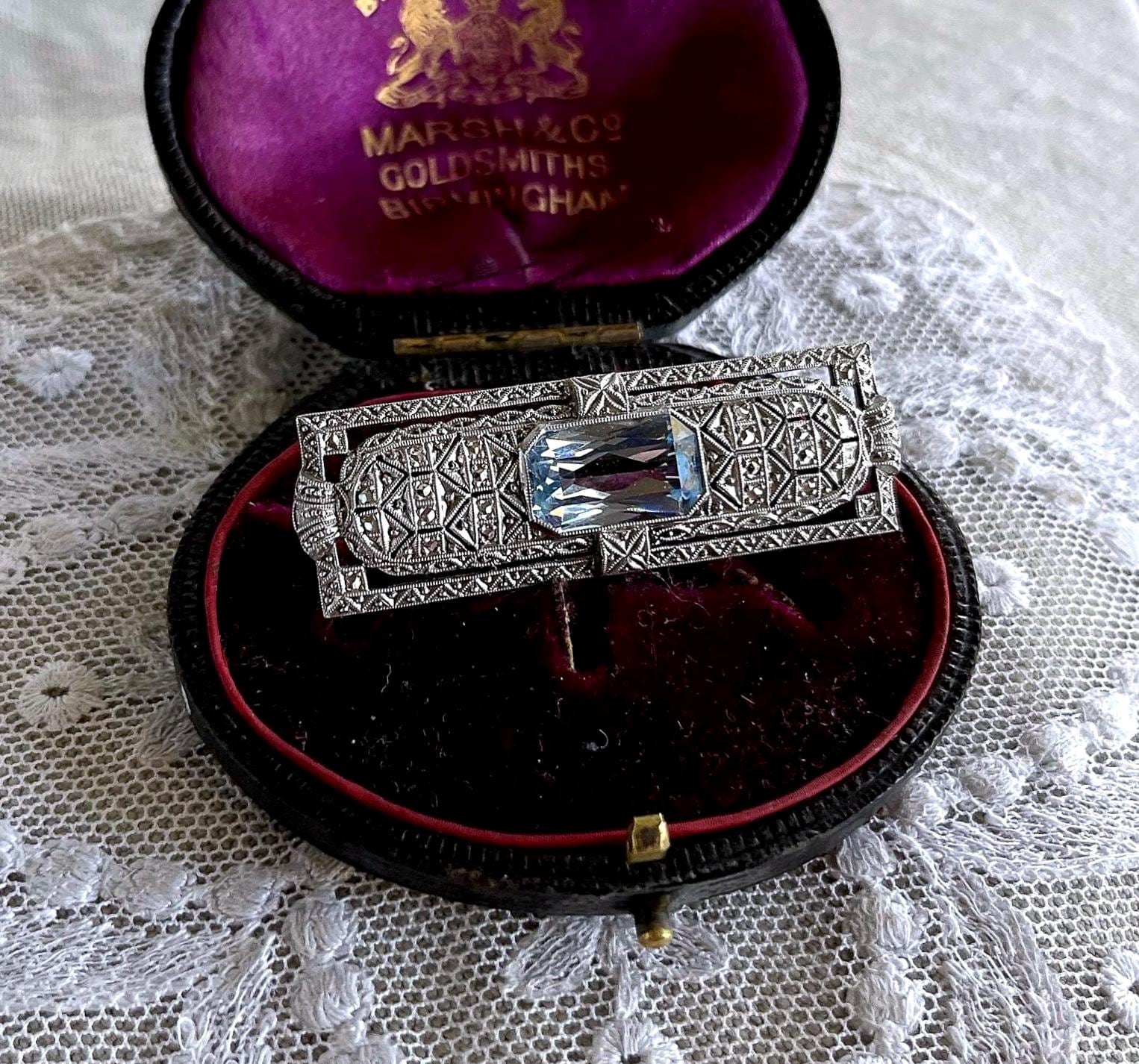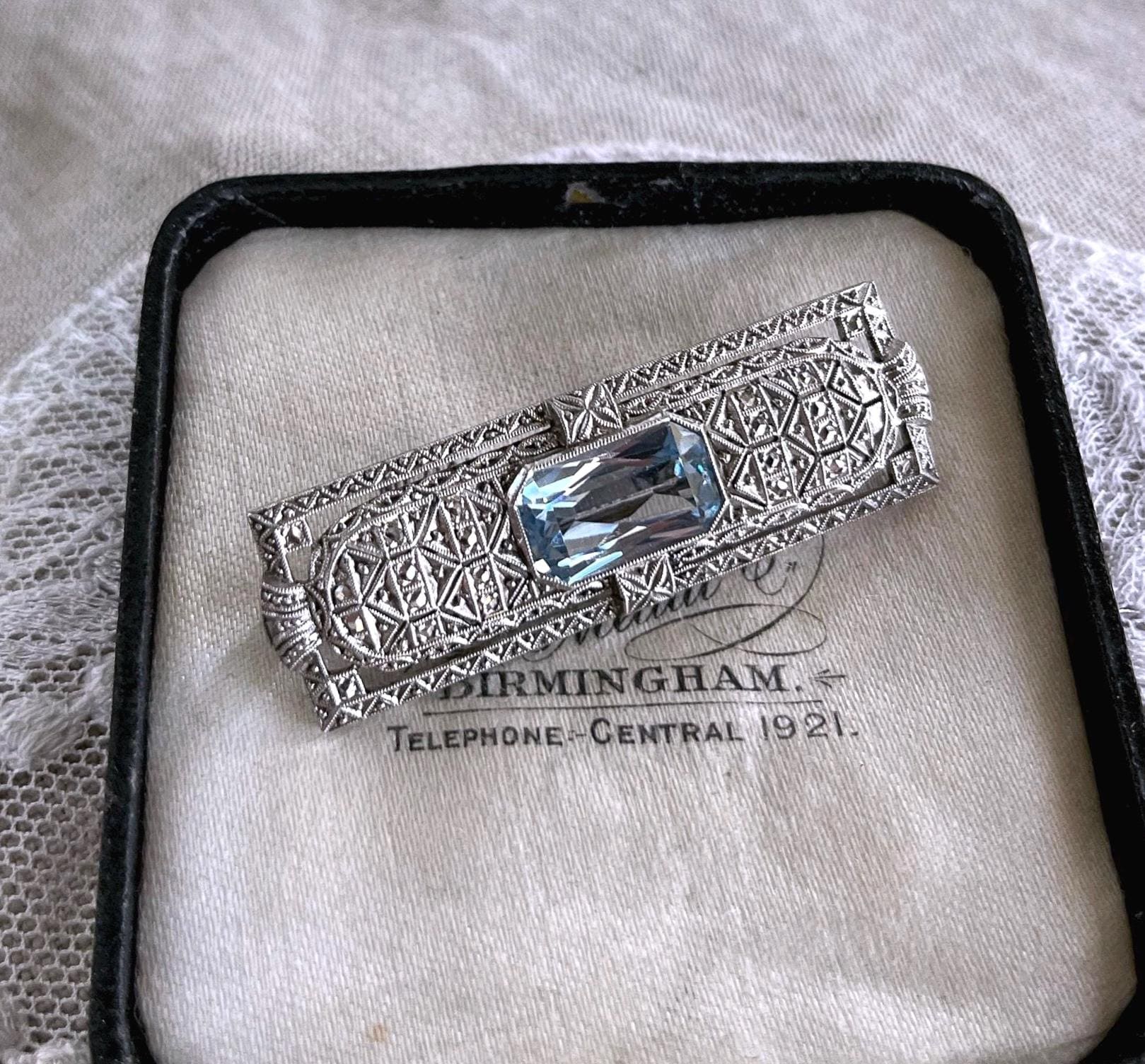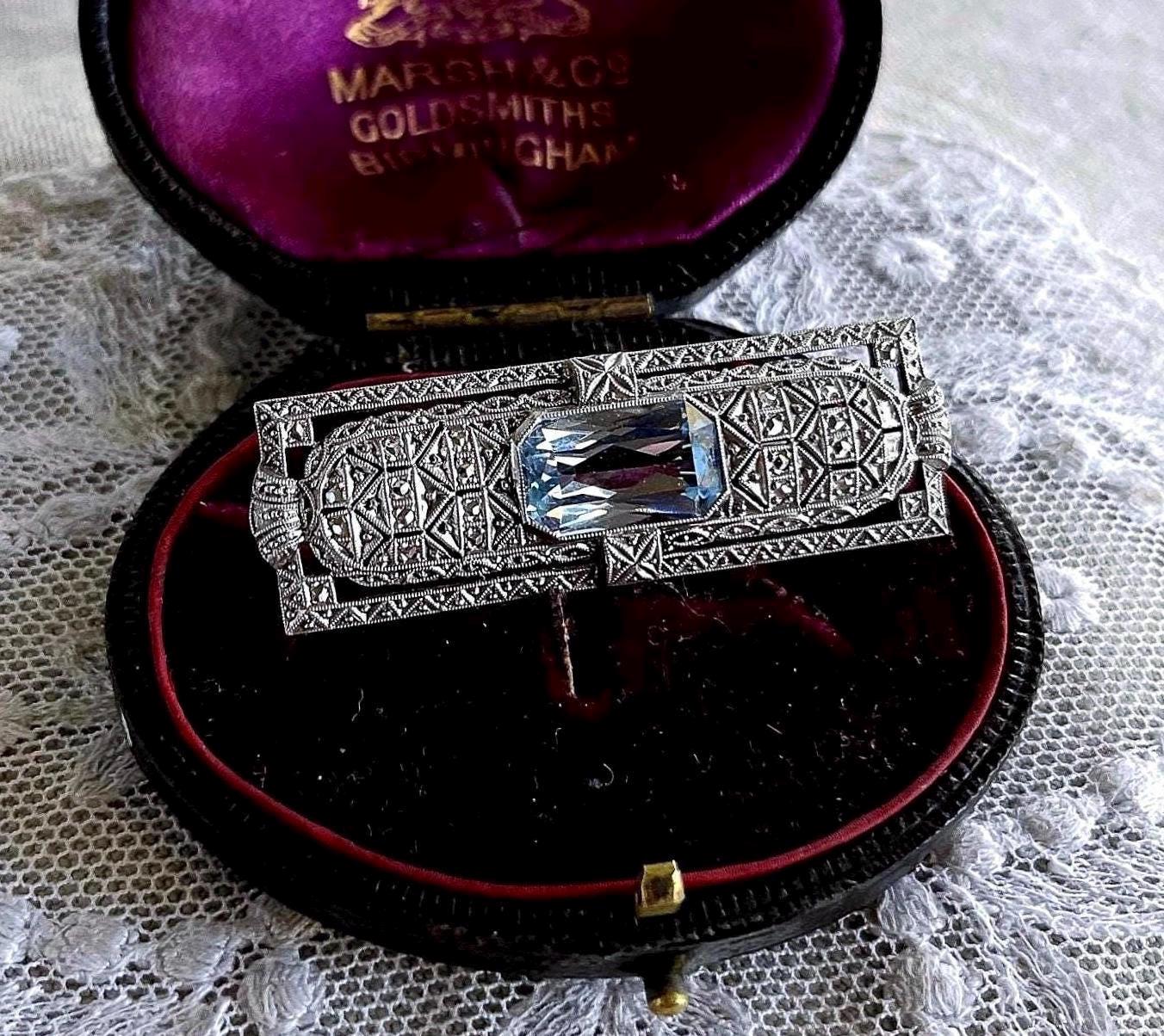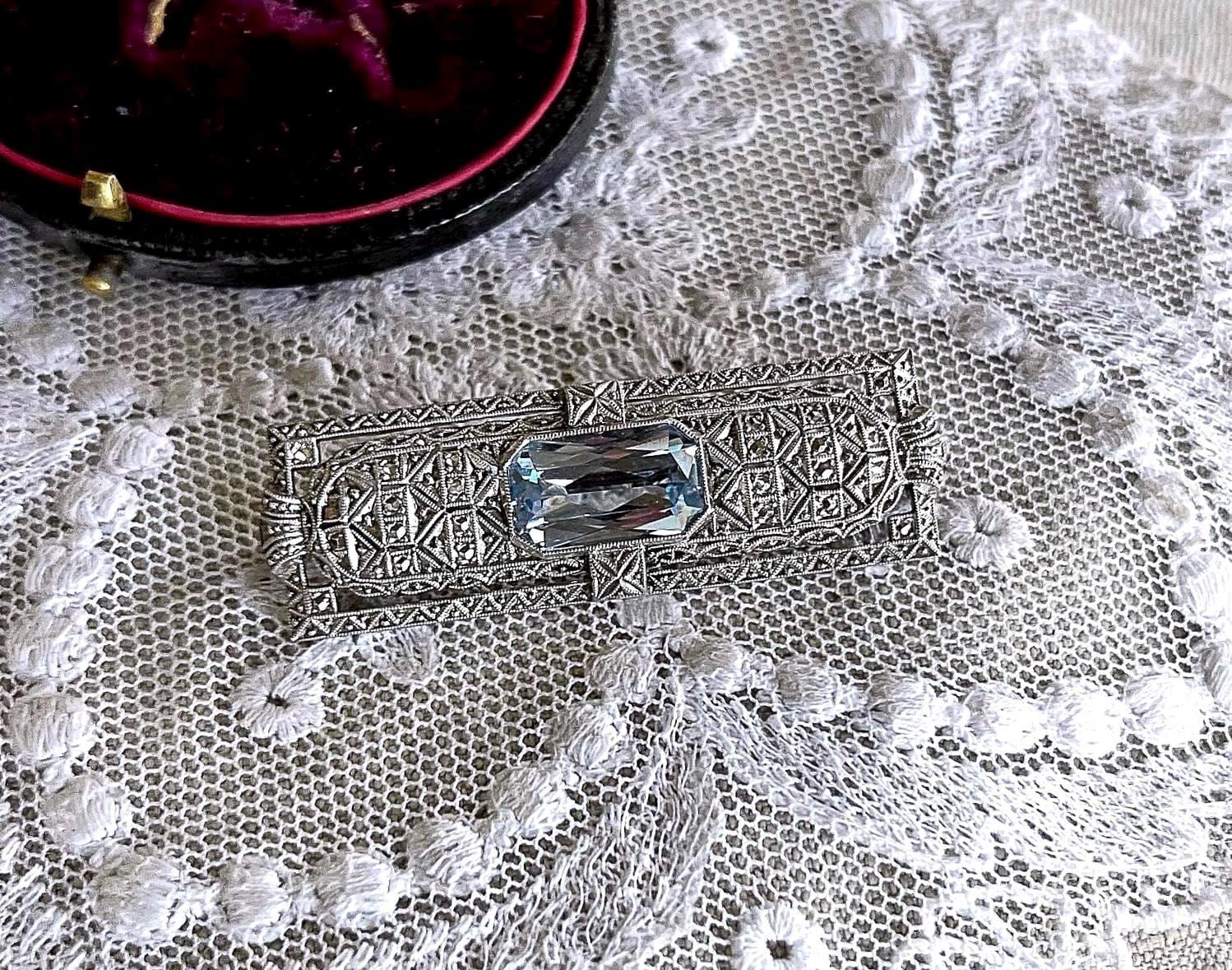 Featuring an exquisite vintage Art Deco Germany solid 835 silver statement brooch adorned with a brilliant aquamarine blue spinel gemstone set in a beautiful open back setting. Brooch measures approximately 1.9 inches long at 9.58 grams respectively. This exceptional piece is in pristine condition with a functional clasp, a slight patina with stone intact. Stamped 835 on the reverse this in a wonderful collectible investment, beautifully made and completely wearable!