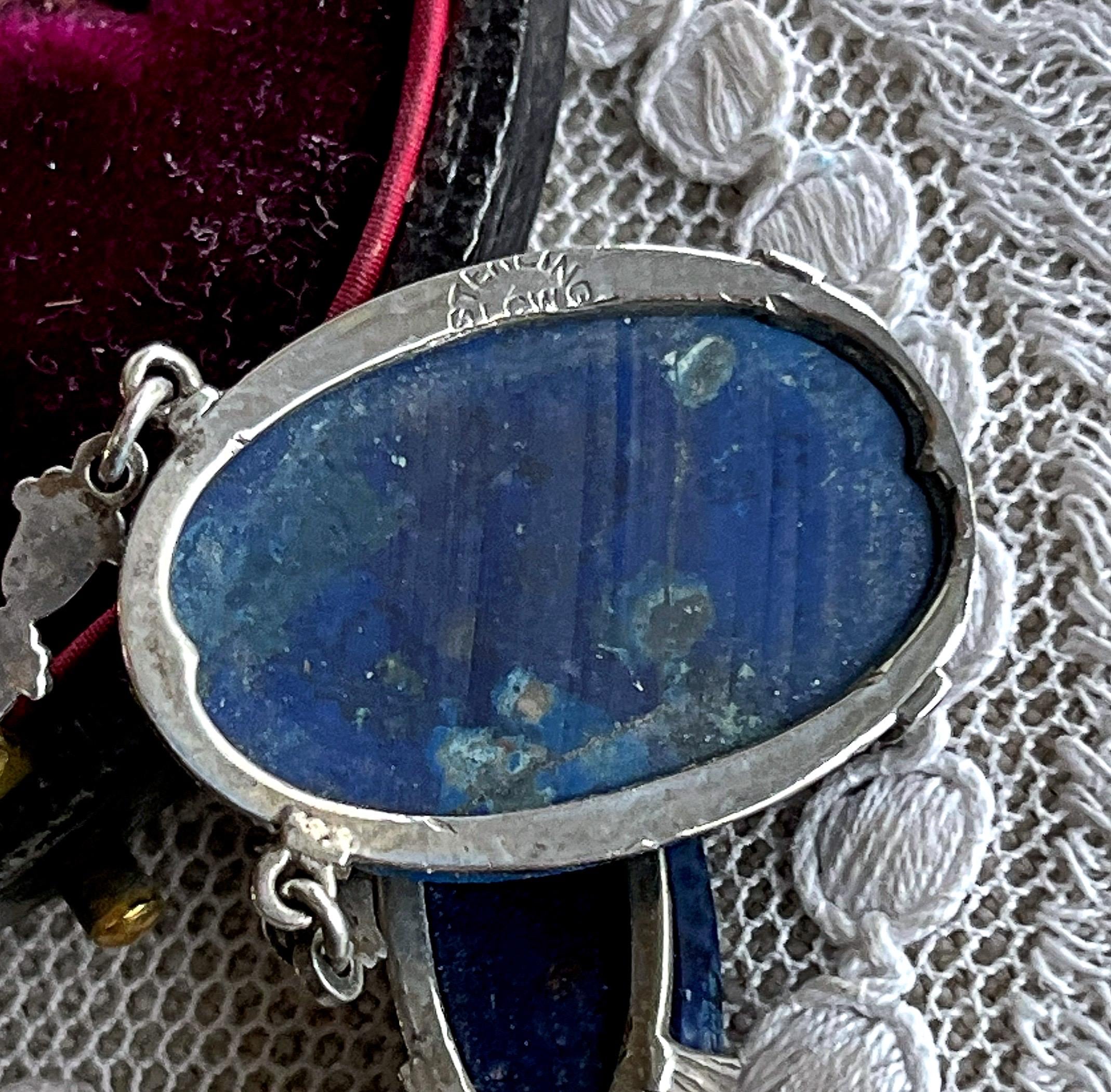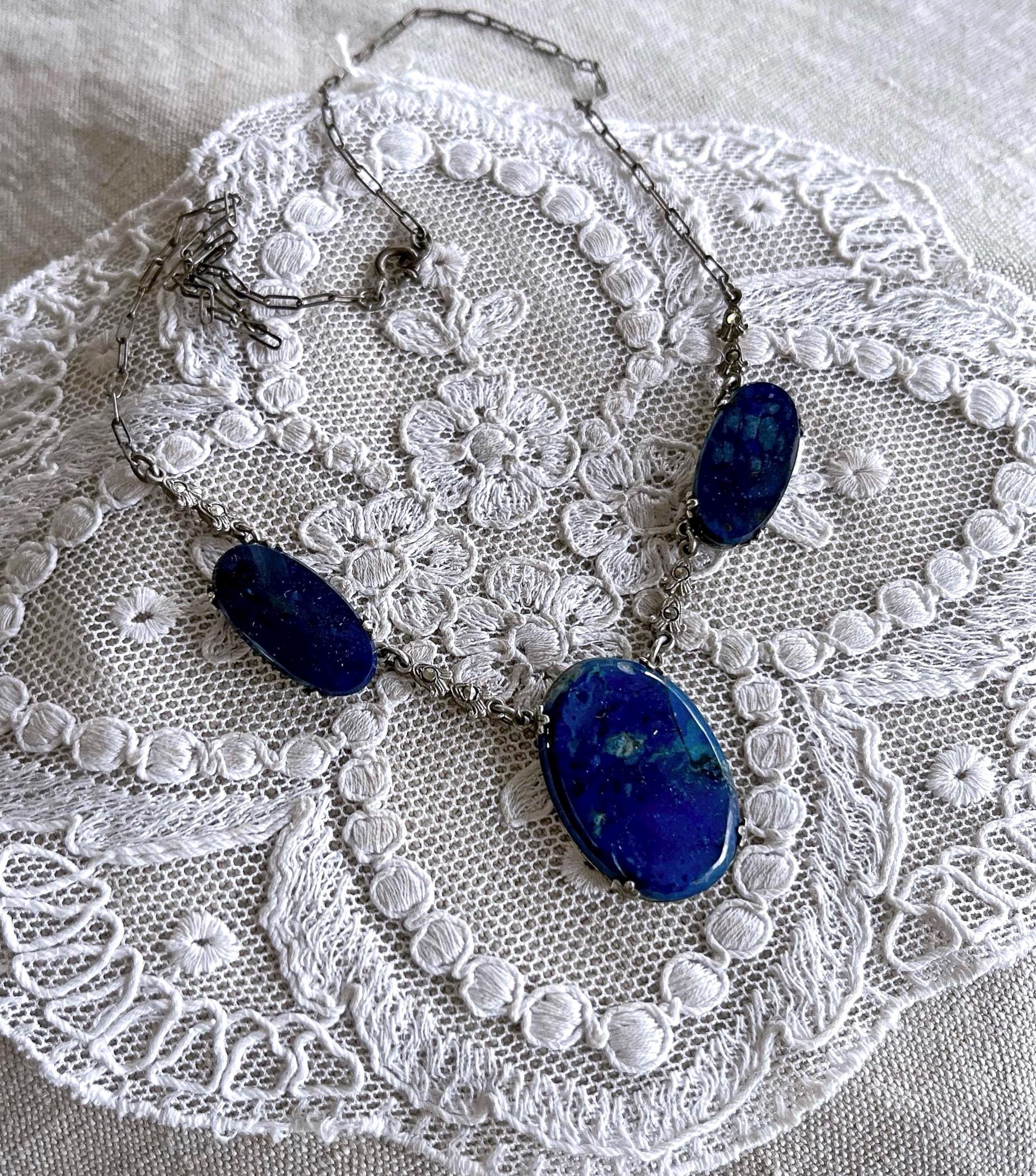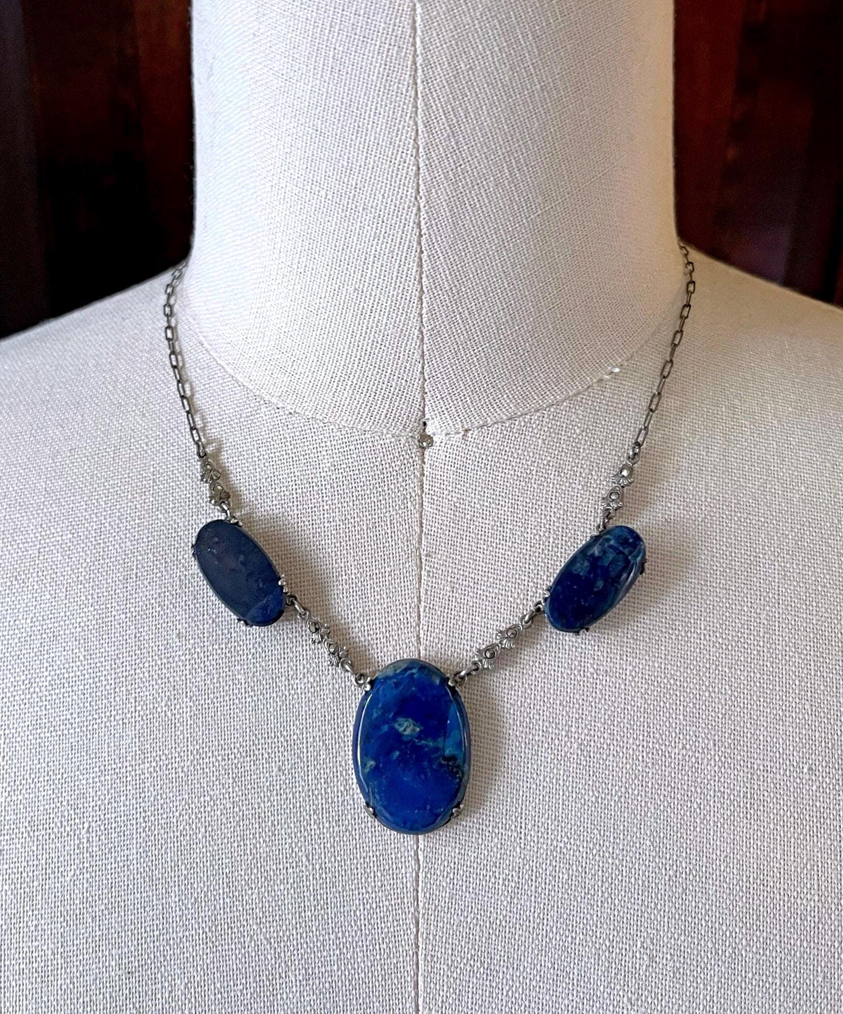 Featuring a gorgeous antique 1910s-20s Edwardian Era stamped sterling silver choker necklace adorned with genuine lapis lazuli stones set in sterling pronged open back settings accented with faceted sparkling marcasite crystals. This lovely heirloom necklace is in excellent antique condition with a functional stamped antique thumbless clasp , a beautiful oxidized patina with all stones intact and accounted for, hallmarked on the reverse of pendant and clasp . Measuring approximately 14 inches at 8.65 grams respectively this is an exceptional piece, sits beautifully on the neck and is ready to wear!