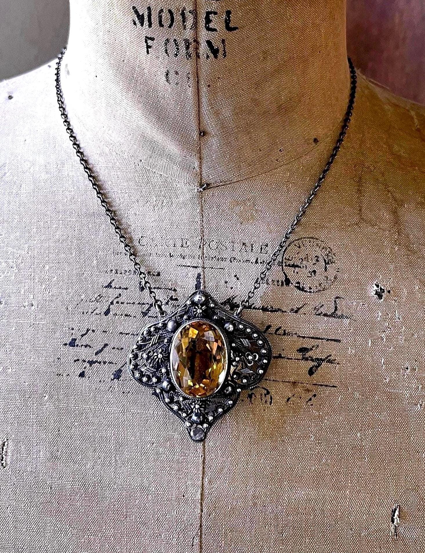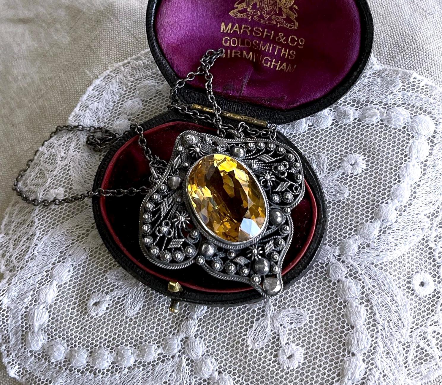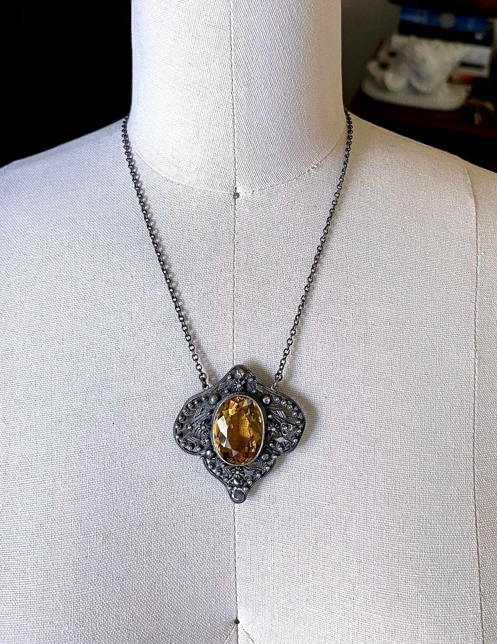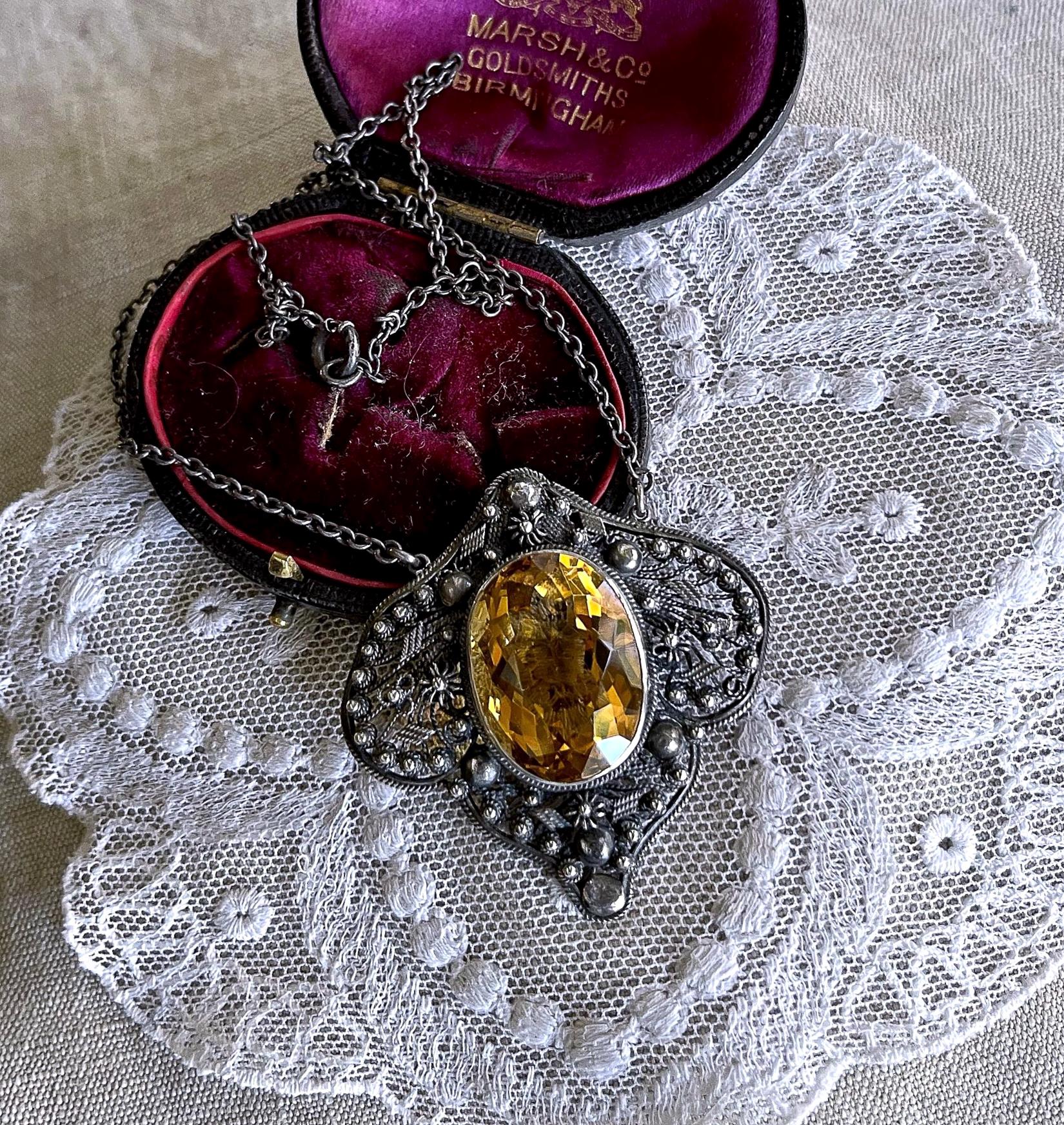 Featuring an absolutely gorgeous antique Italian Bohemian Revival Peruzzi style Arts and Crafts Sterling Silver cannetille heirloom necklace adorned with a brilliant faceted Citrine Quartz stone set in an open back bezel setting. Necklace is in excellent antique condition with a functional clasp, a beautiful patina with all components intact and accounted for. Measuring approximately 16 inches around with pendant measuring 2 inches long at 18.56 grams respectively. Stamped faintly on the clasp, tested as STERLING . This is an amazing antique piece, beautifully designed and handcrafted over 100 years ago!