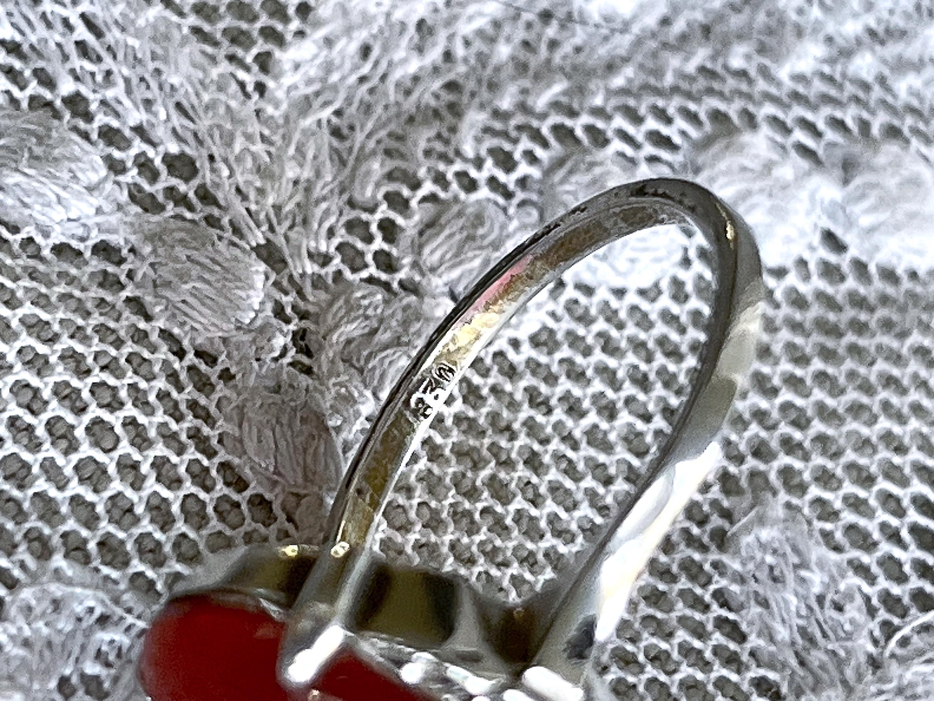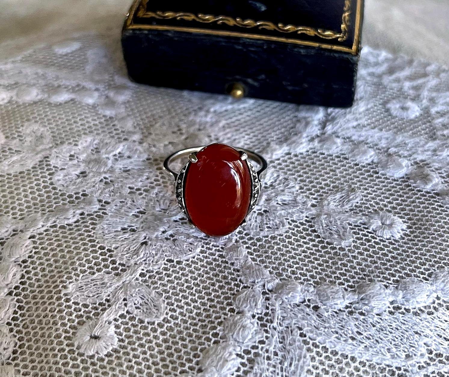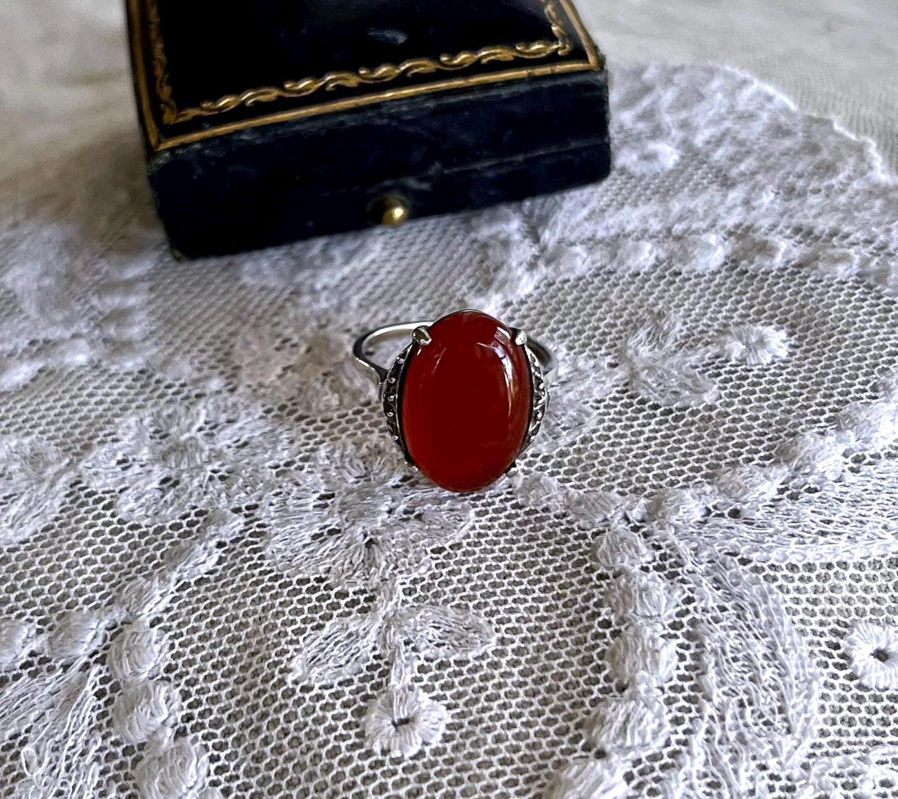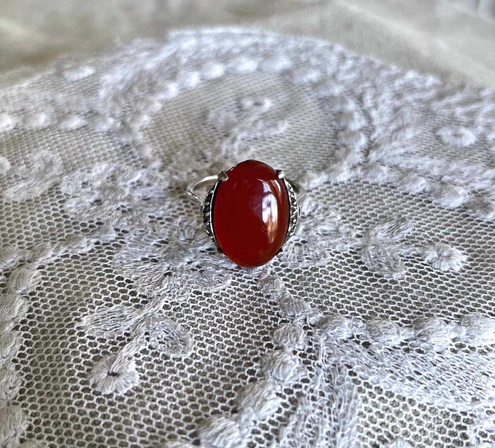 Featuring a lovely vintage Art Deco 835 European Silver decorative ring adorned with a genuine luminous carnelian stone set in a decorative 835 setting accented with brilliant Marcasite crystal accents. Ring is in excellent condition with all stones intact and accounted for. Ring is approximately size 7 at 3.83 grams respectively and is hallmarked 835 on the inside of band . A beautiful unique piece, collectible and wearable!