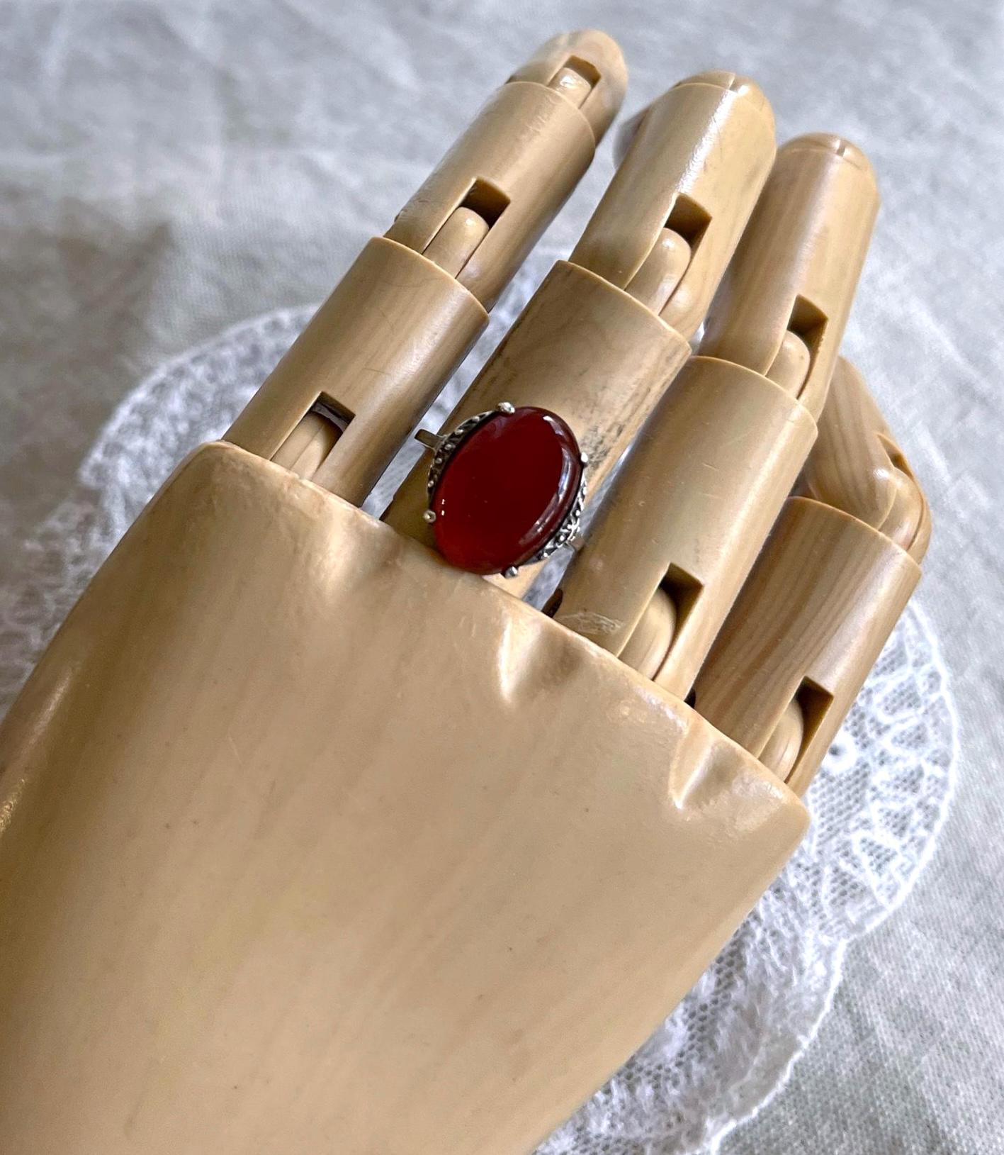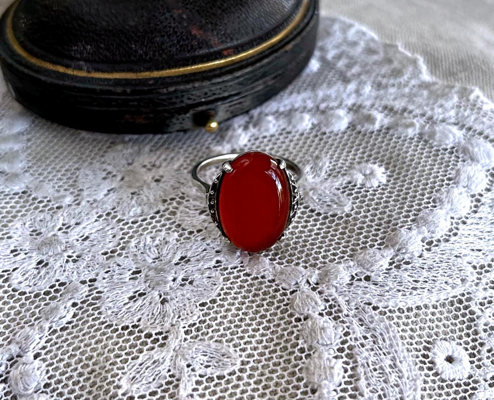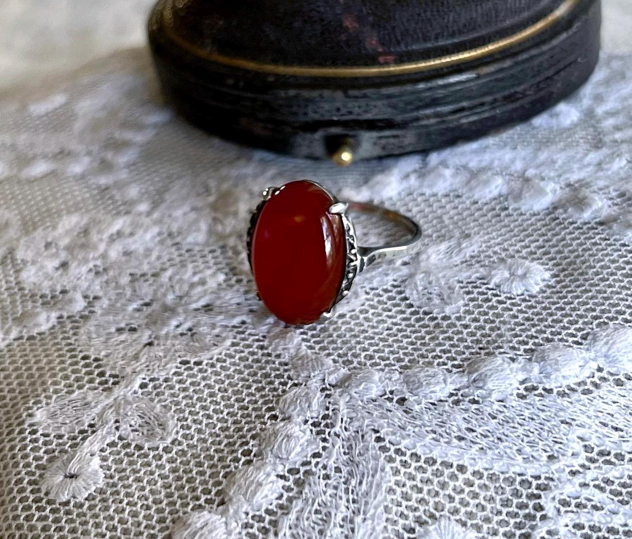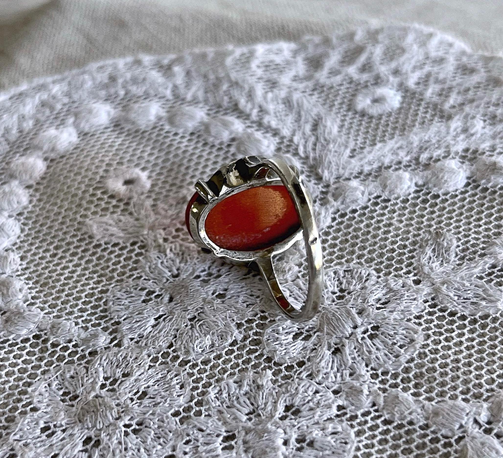 Featuring a lovely vintage Art Deco 835 European Silver decorative ring adorned with a genuine luminous carnelian stone set in a decorative 835 setting accented with brilliant Marcasite crystal accents. Ring is in excellent condition with all stones intact and accounted for. Ring is approximately size 7 at 3.83 grams respectively and is hallmarked 835 on the inside of band . A beautiful unique piece, collectible and wearable!
