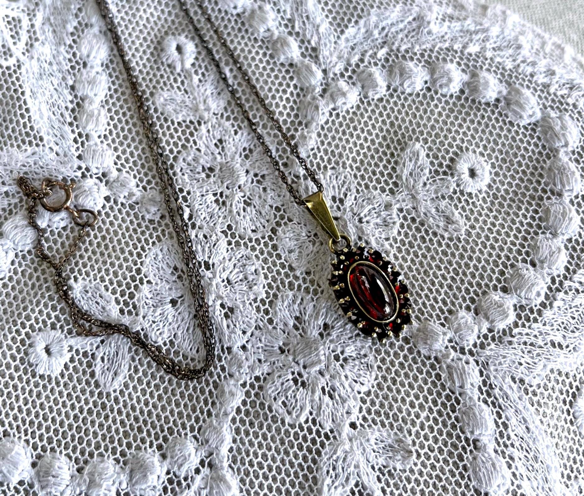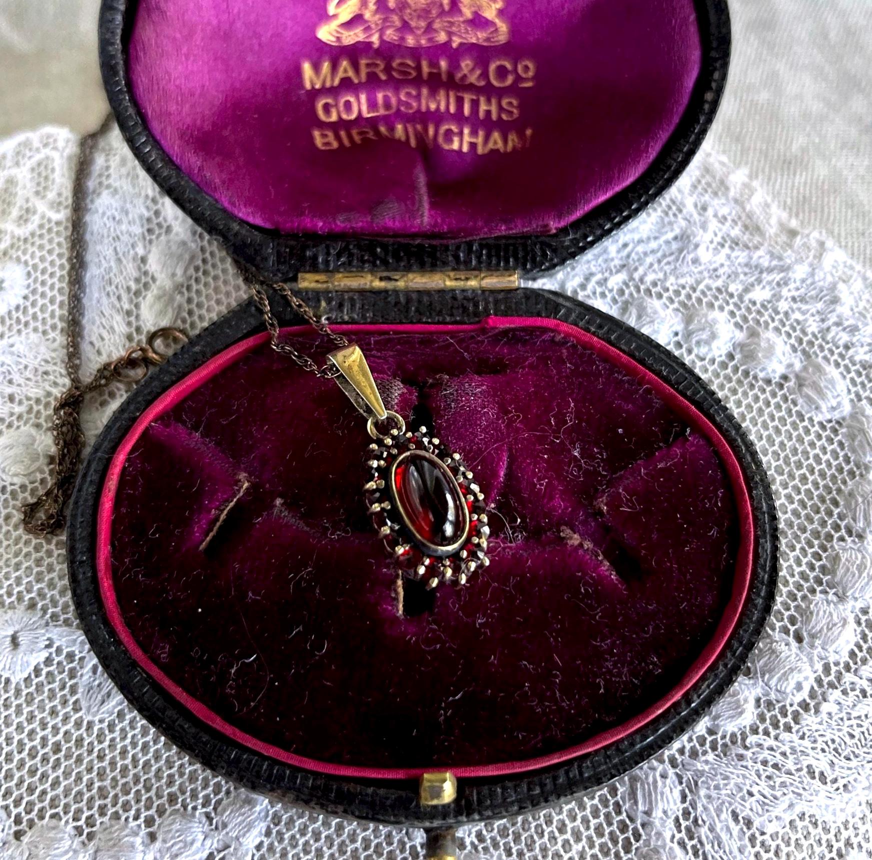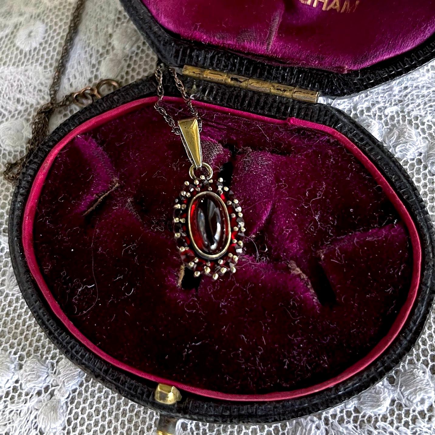 Featuring a lovely vintage Mid Century 9ct 375 yellow gold pendant necklace adorned with a luminous genuine garnets set in a 9ct gold setting. Necklace measures approximately 17 inches around with a 1 inch pendant drop at 2.59 grams respectively and are in excellent vintage condition, hallmarked on the reverse of pendant and clasp . Elegant and collectible this is a beautiful piece!!