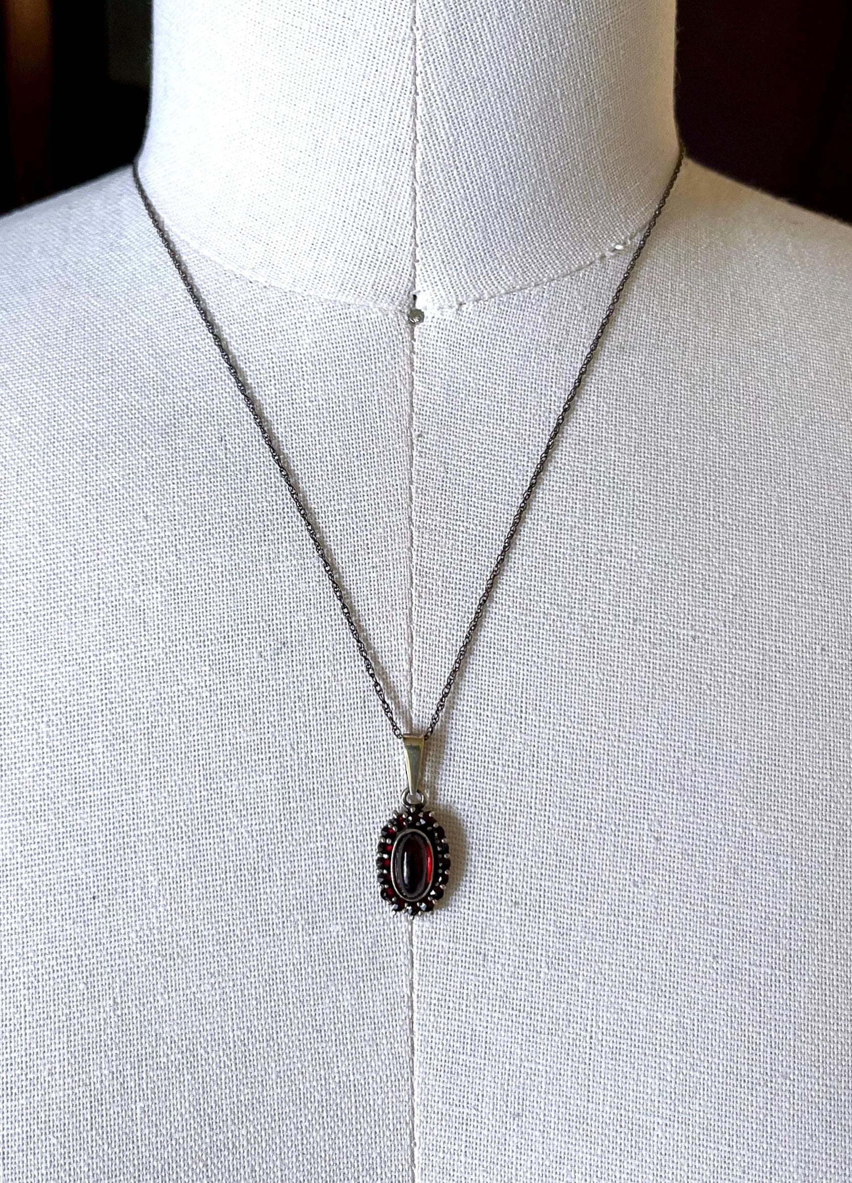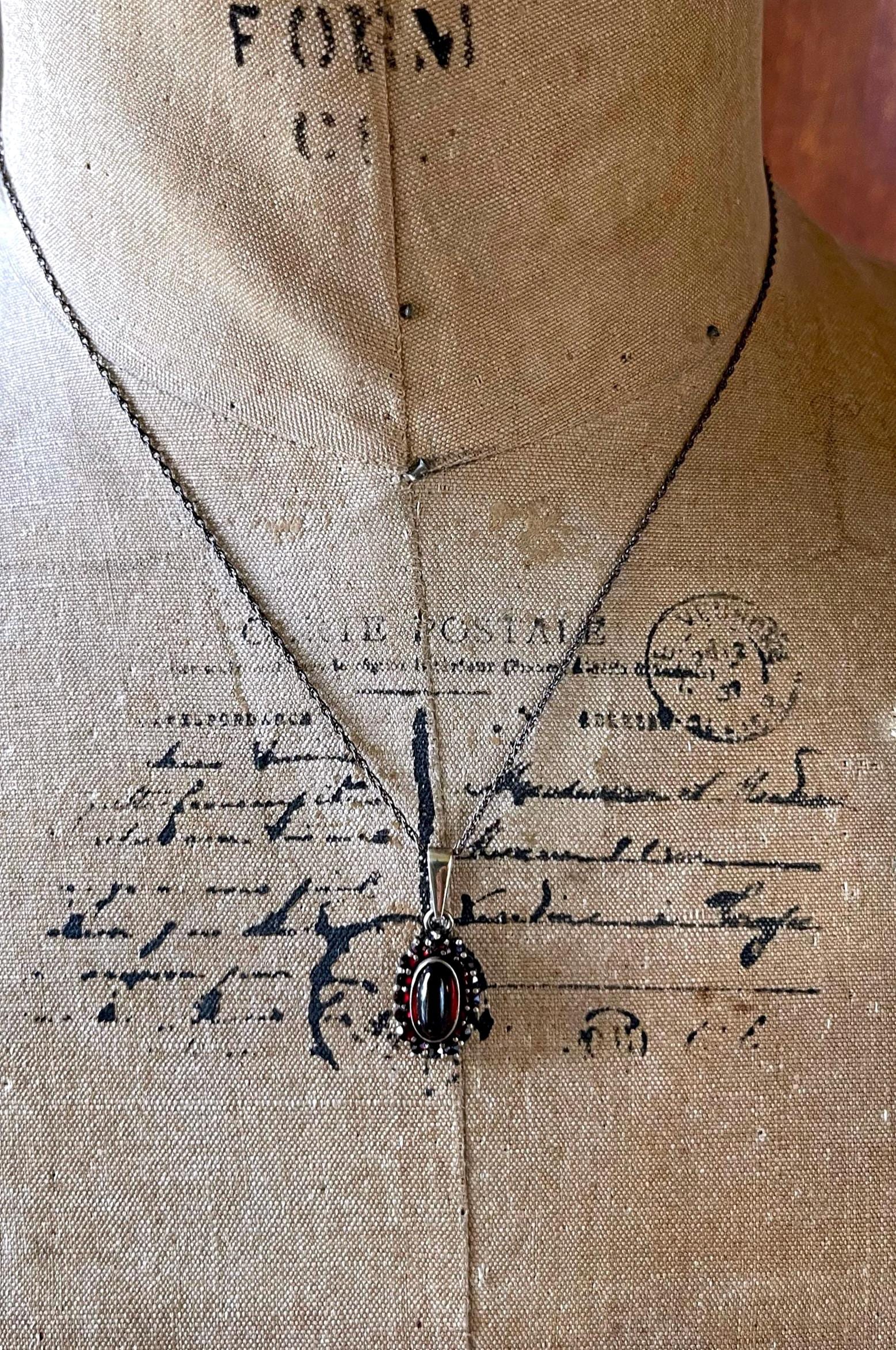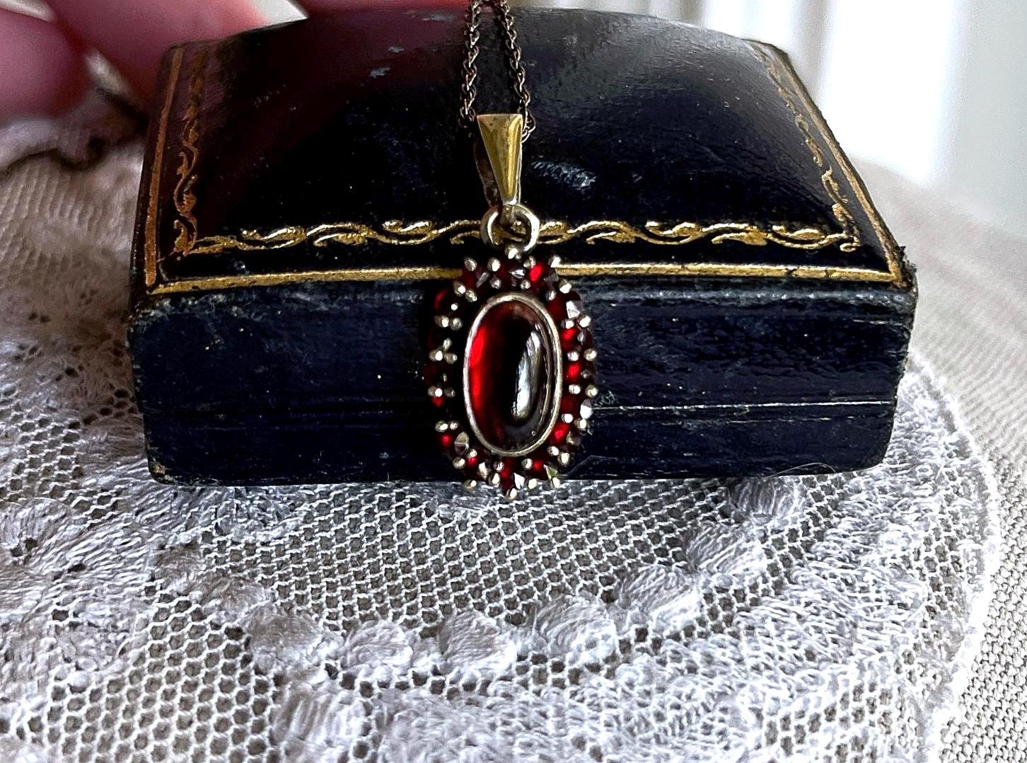 Featuring a lovely vintage Mid Century 9ct 375 yellow gold pendant necklace adorned with a luminous genuine garnets set in a 9ct gold setting. Necklace measures approximately 17 inches around with a 1 inch pendant drop at 2.59 grams respectively and are in excellent vintage condition, hallmarked on the reverse of pendant and clasp . Elegant and collectible this is a beautiful piece!!