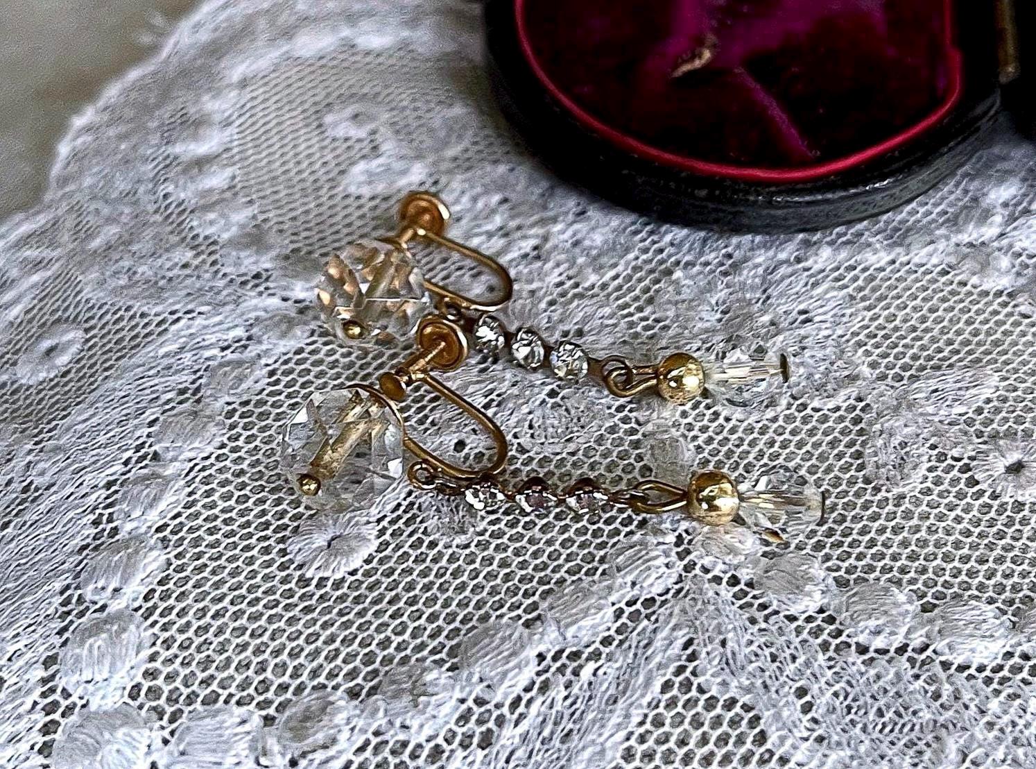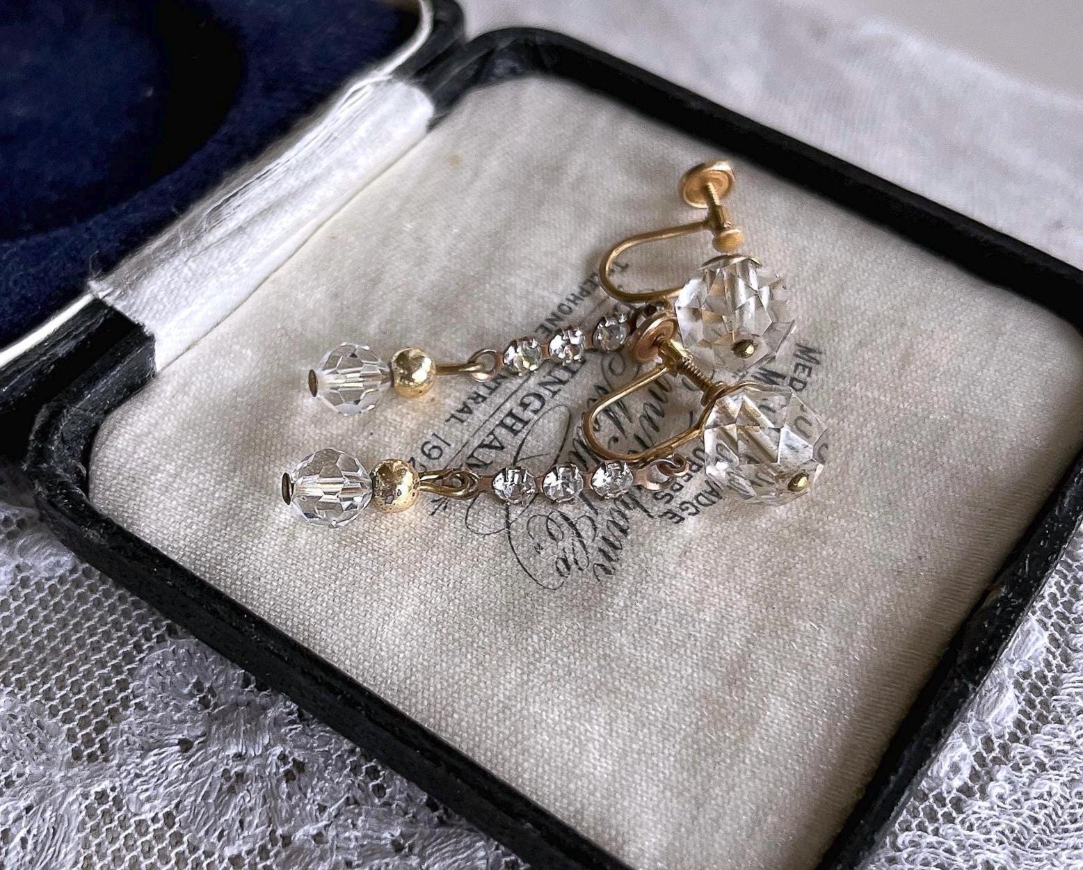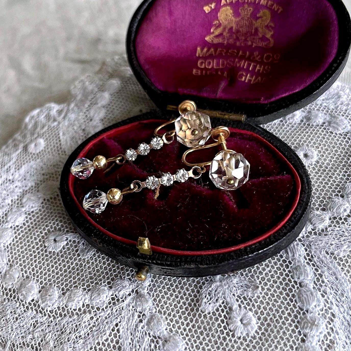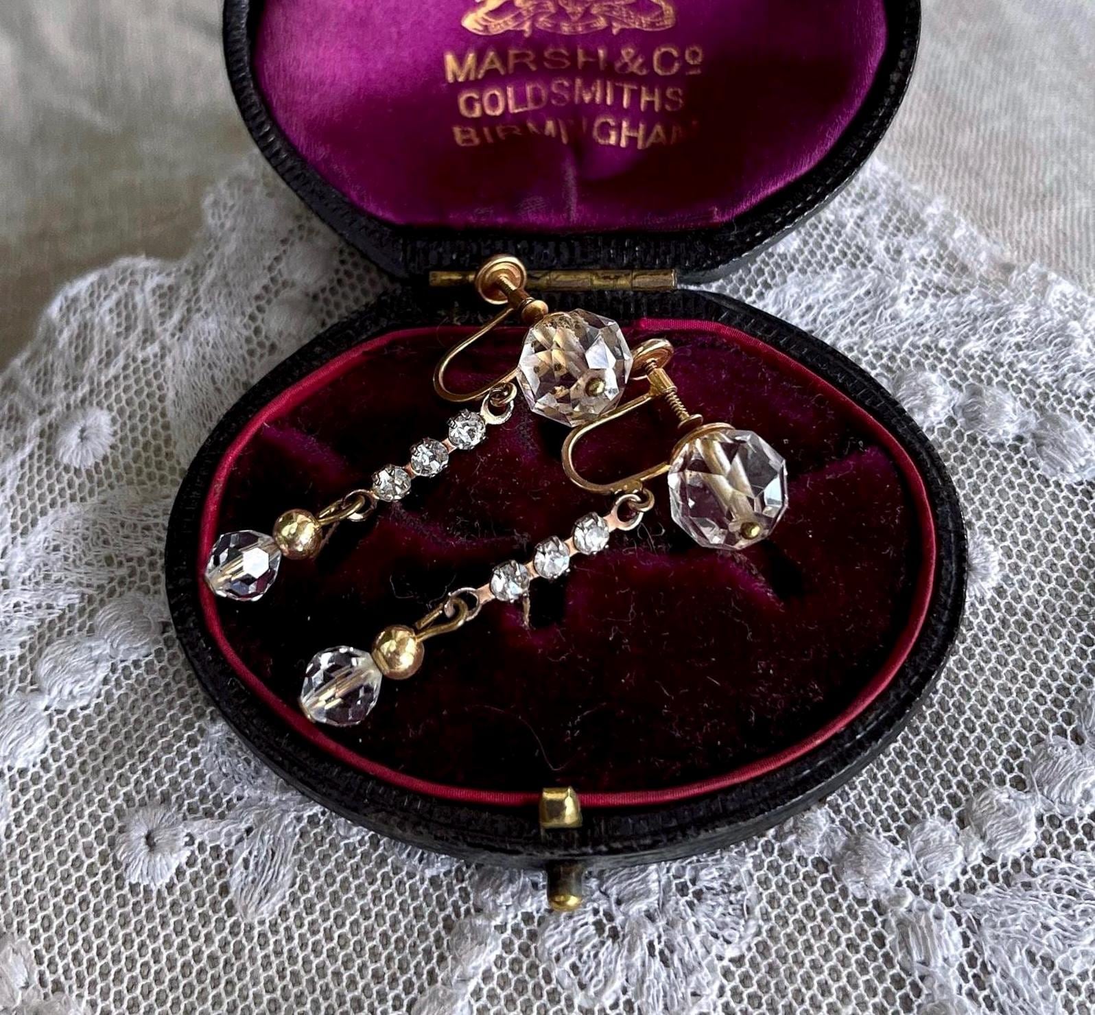 Featuring a beautiful antique pair of Late Victorian Aesthetic stamped 10K yellow gold screw back drop earrings adorned with genuine faceted Quartz Rock Crystal accented with brilliant sparkling Diamond paste stones. Earrings measure approximately 1 1/4 inches long at 4.6 grams respectively. Both pieces are in excellent antique condition with stamped 10K functional clasps, minimal wear with all stones intact and accounted for. An elegant collectible pair of beautifully designed and handcrafted antique earrings!