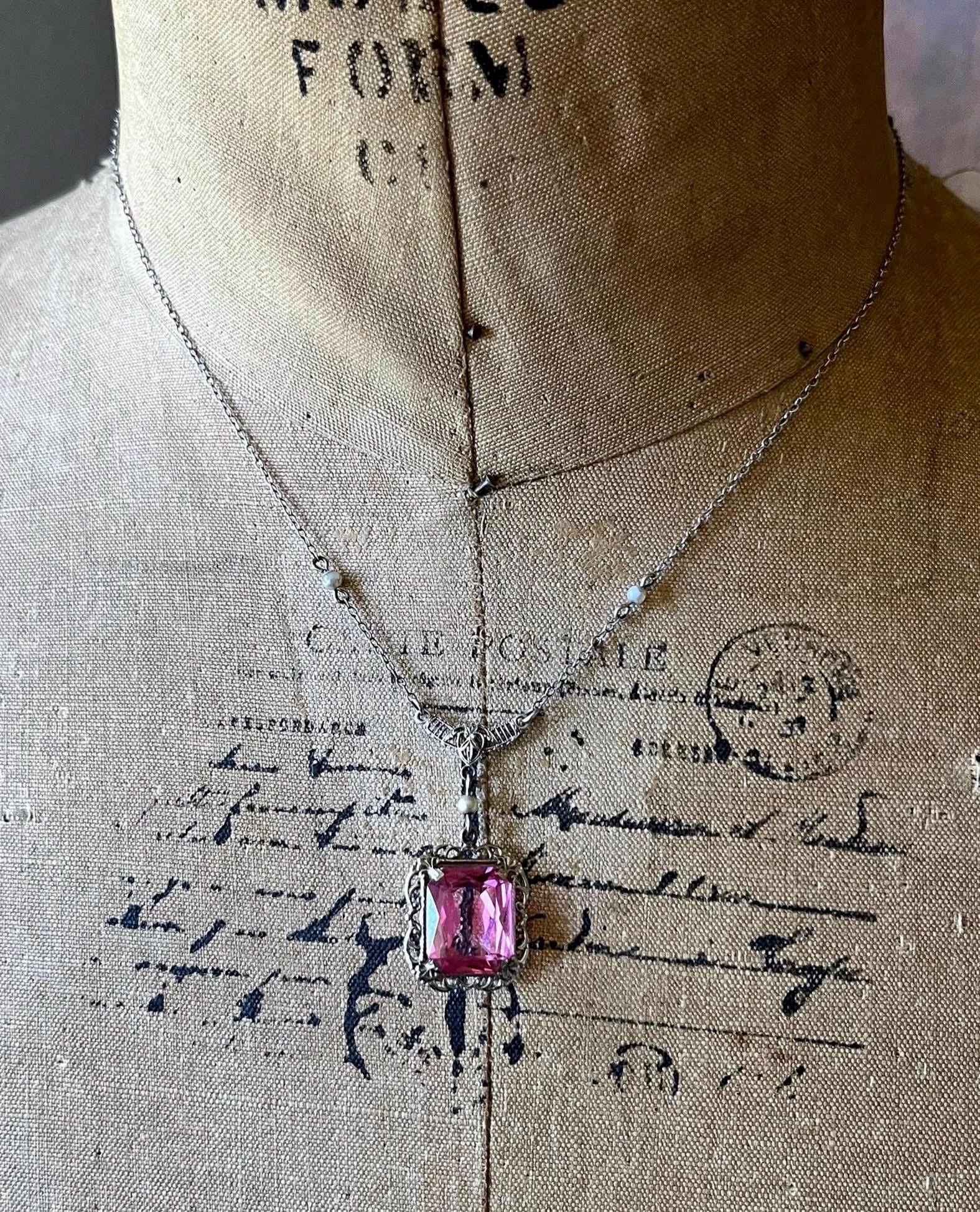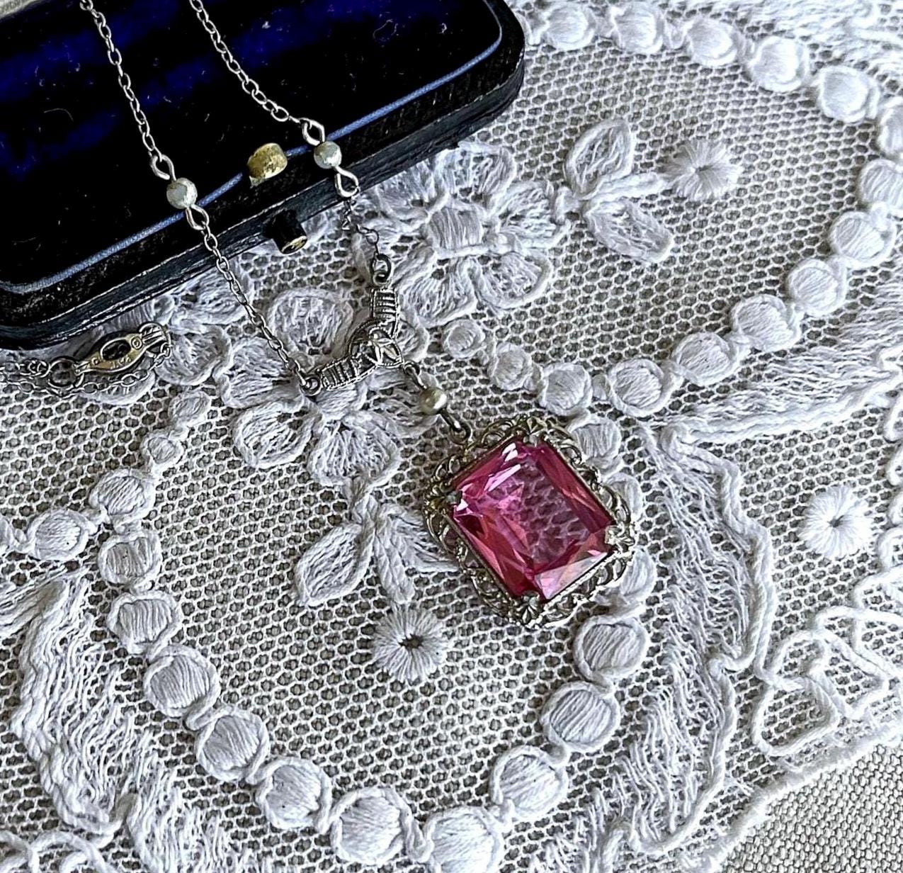 Featuring a graceful antique 1910s Edwardian Belle Époque solid 10k white gold delicate filigree necklace adorned with a brilliant and bright Pink faceted paste stone set in a beautiful open back setting accented with genuine seed pearls. Necklace measures approximately 18 inches around with a 1.2 inch pendant drop at 2.8 grams respectively. An investment worth wearing this exquisite piece is in pristine antique condition with a stamped 10K functional fold clasp, virtually no wear with all components intact. Beautifully designed and crafted over 100 years ago, wearable and absolutely gorgeous!