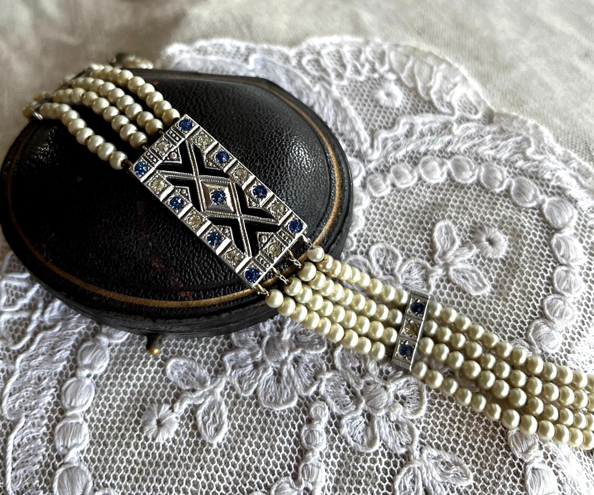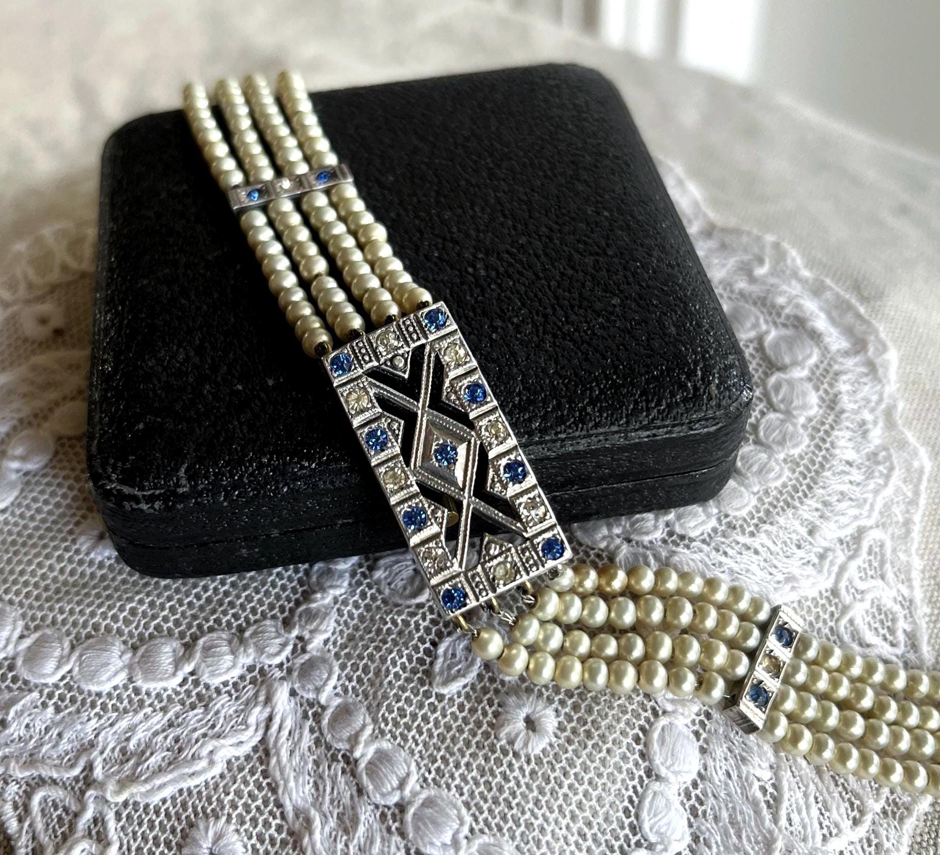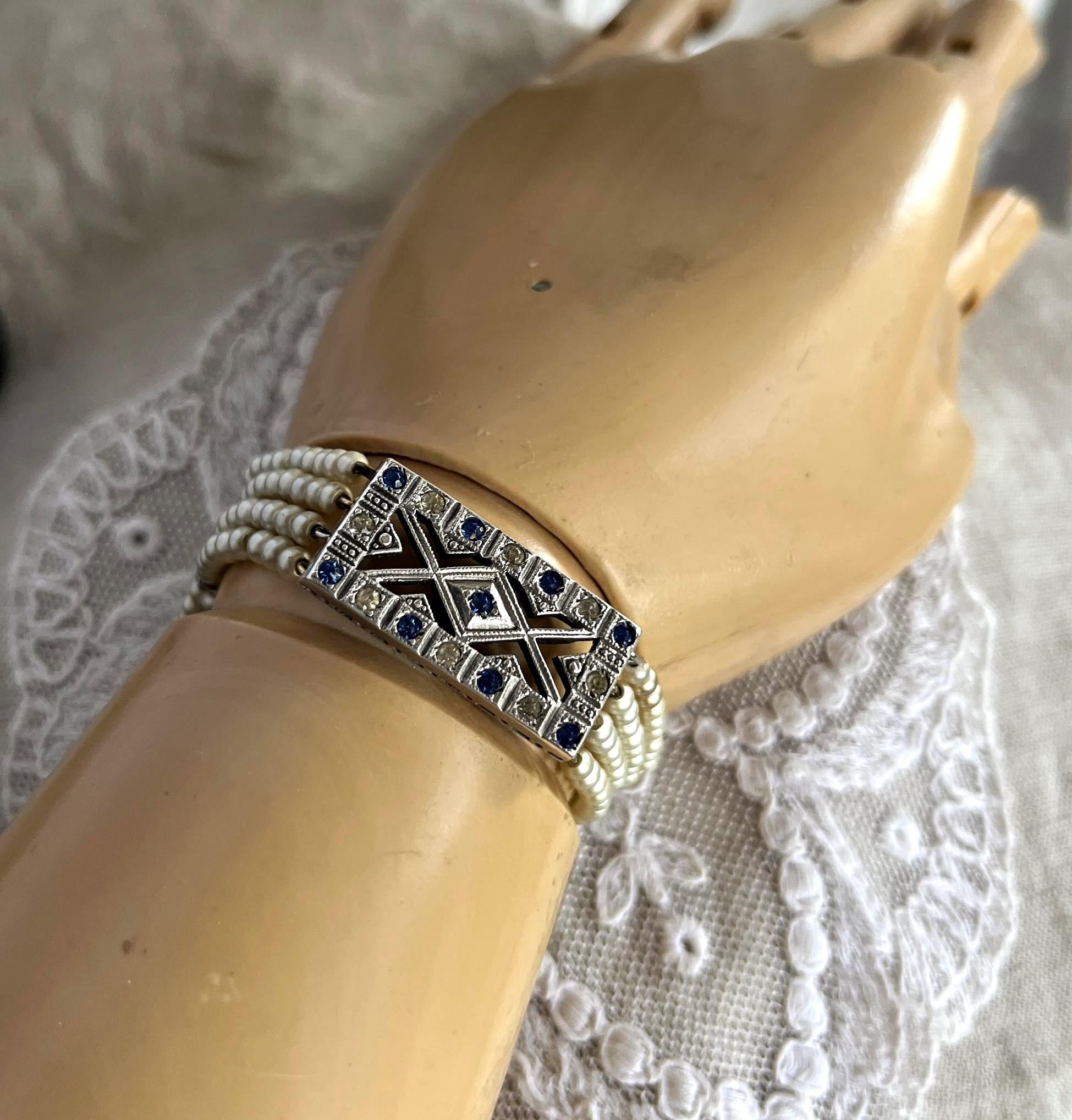 Featuring a feminine dainty antique Art Deco 1920-30s solid sterling silver triple strand Majorica glass pearl bracelet accented with brilliant faceted sapphire blue and white paste stones set in closed back settings. Bracelet is in excellent antique condition with functional antique button clasp, hallmarked STERLING on the inside of center focal point, with all stones intact. Bracelet measures approximately 7 inches around at 13.8 grams respectively. Such a beautiful antique bracelet, unique and one of a kind!